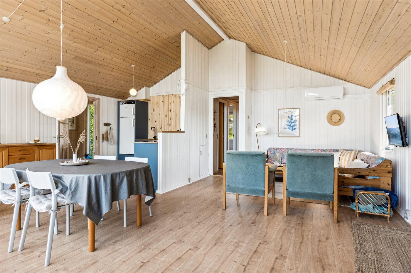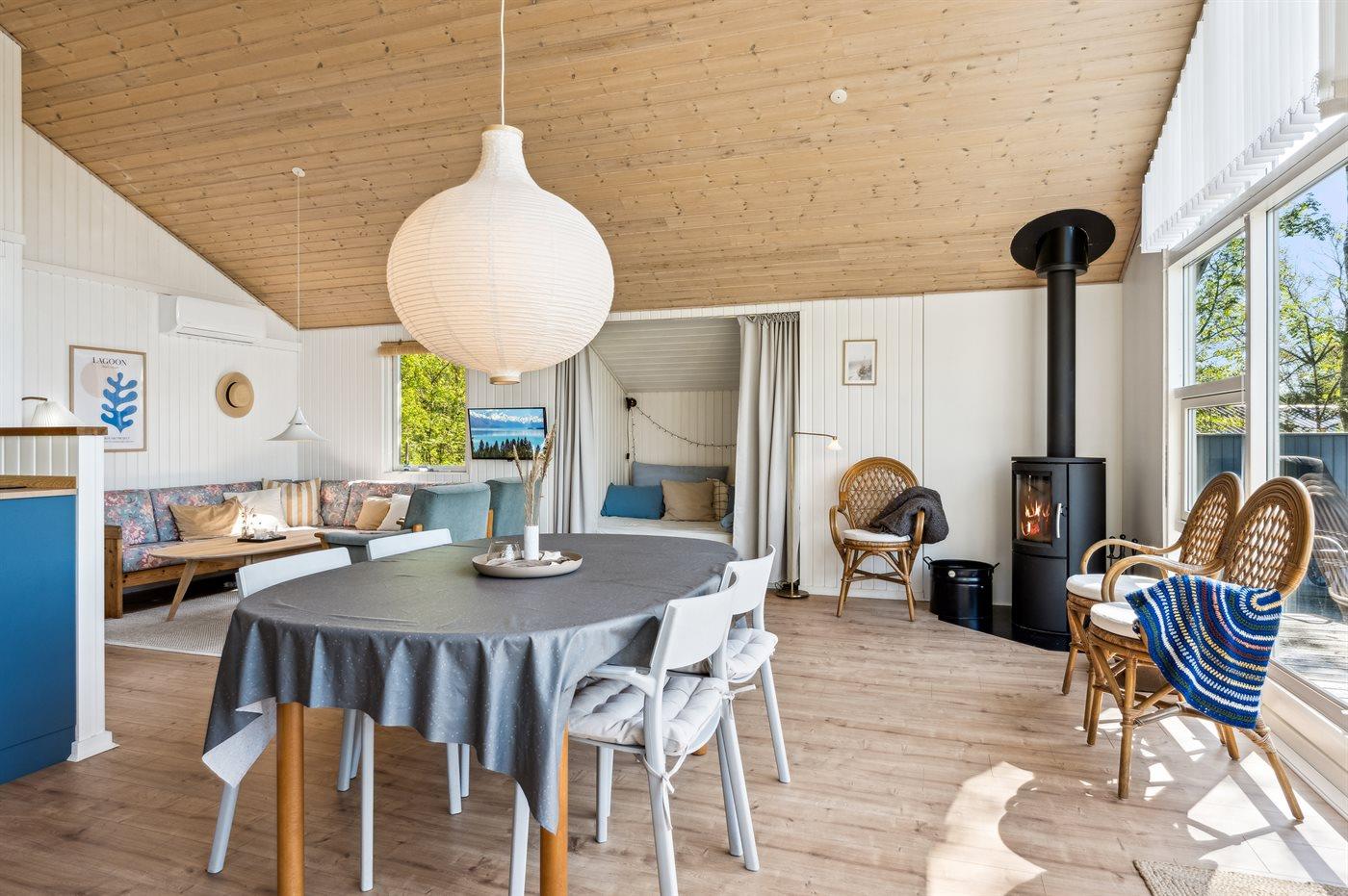 Det nyrenoverede sommerhus er godt indrettet og passer rigtig fint til en familie, som gerne vil nyde roen i dette dejlige ferieområde. Huset ligger på en1250 m² stor naturgrund. Der er adgang til træterrassen fra det lyse køkken-alrum, hvor der bl.a. er brændeovn.