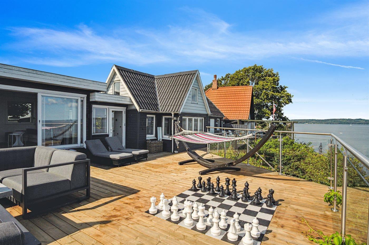 Skønt sommerhus ved vandkanten med panoramaudsigt over fjorden og flere terrasser til afslapning.