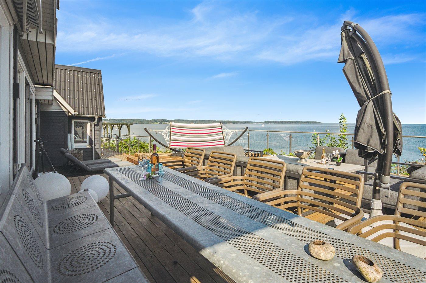Fra den store terrasse kan der bruges timevis på at nyde disse helt særlige og ugenerte omgivelser. Her findes flere fantastiske terrasser på nærmest alle sider af huset, så der altid er mulighed for at nyde solen og sidde fuldstændig ugeneret. Efter svømmeturen i fjorden kan brusebadet tages under den udendørsbruser, og herefter kan den udendørs sauna nydes - stadig med den skønne udsigt over fjorden.