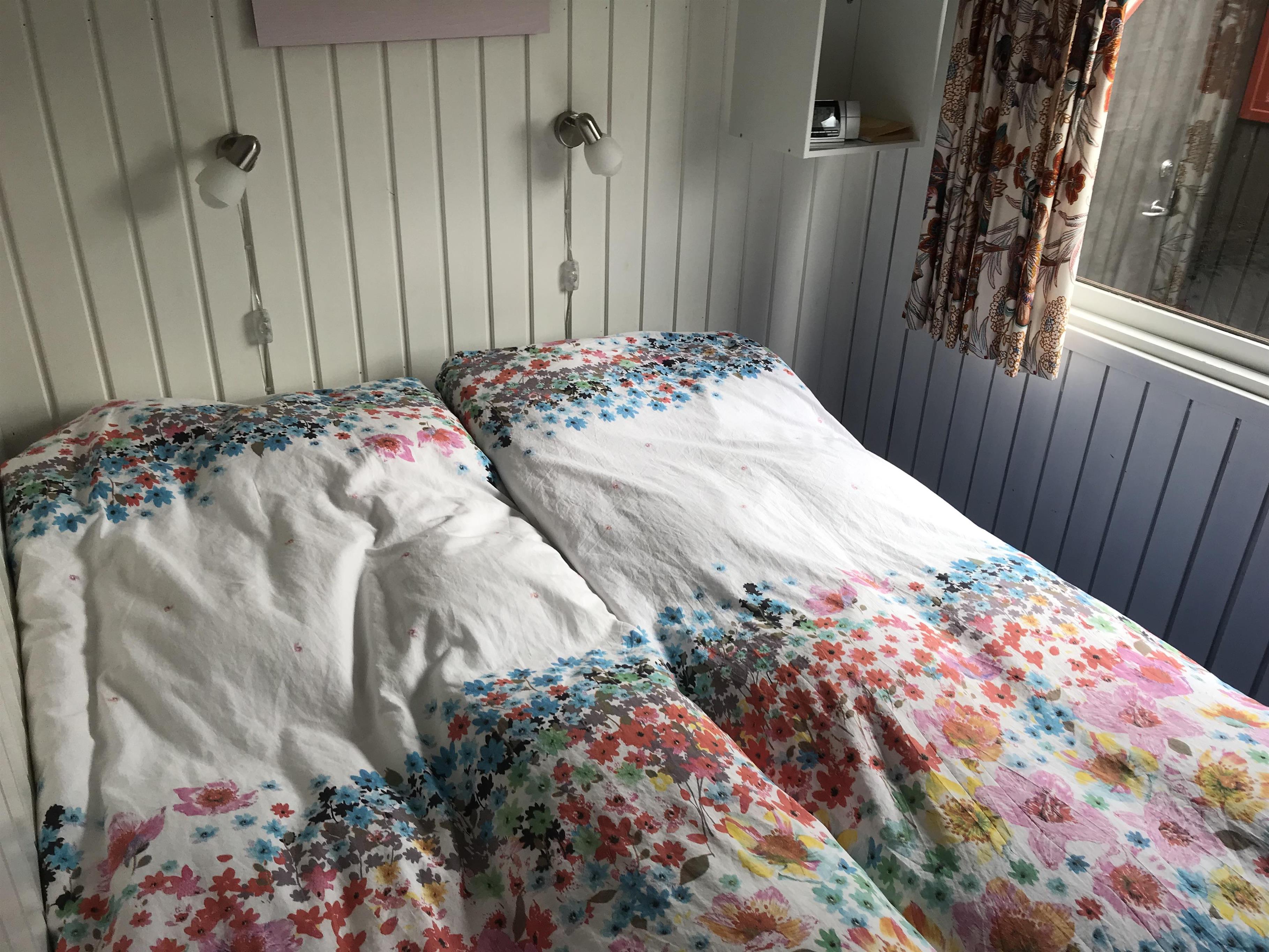 Soveværelse med dobbeltseng. De to øvrige sovepladser findes i sovesofaen i stuen, så huset er nok bedst, hvis I kun er to.
