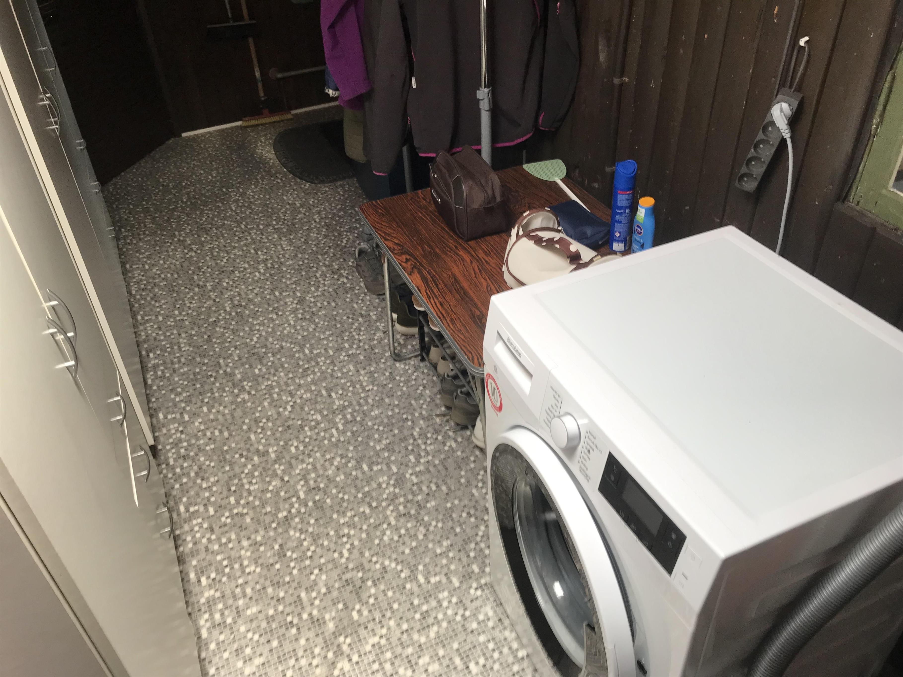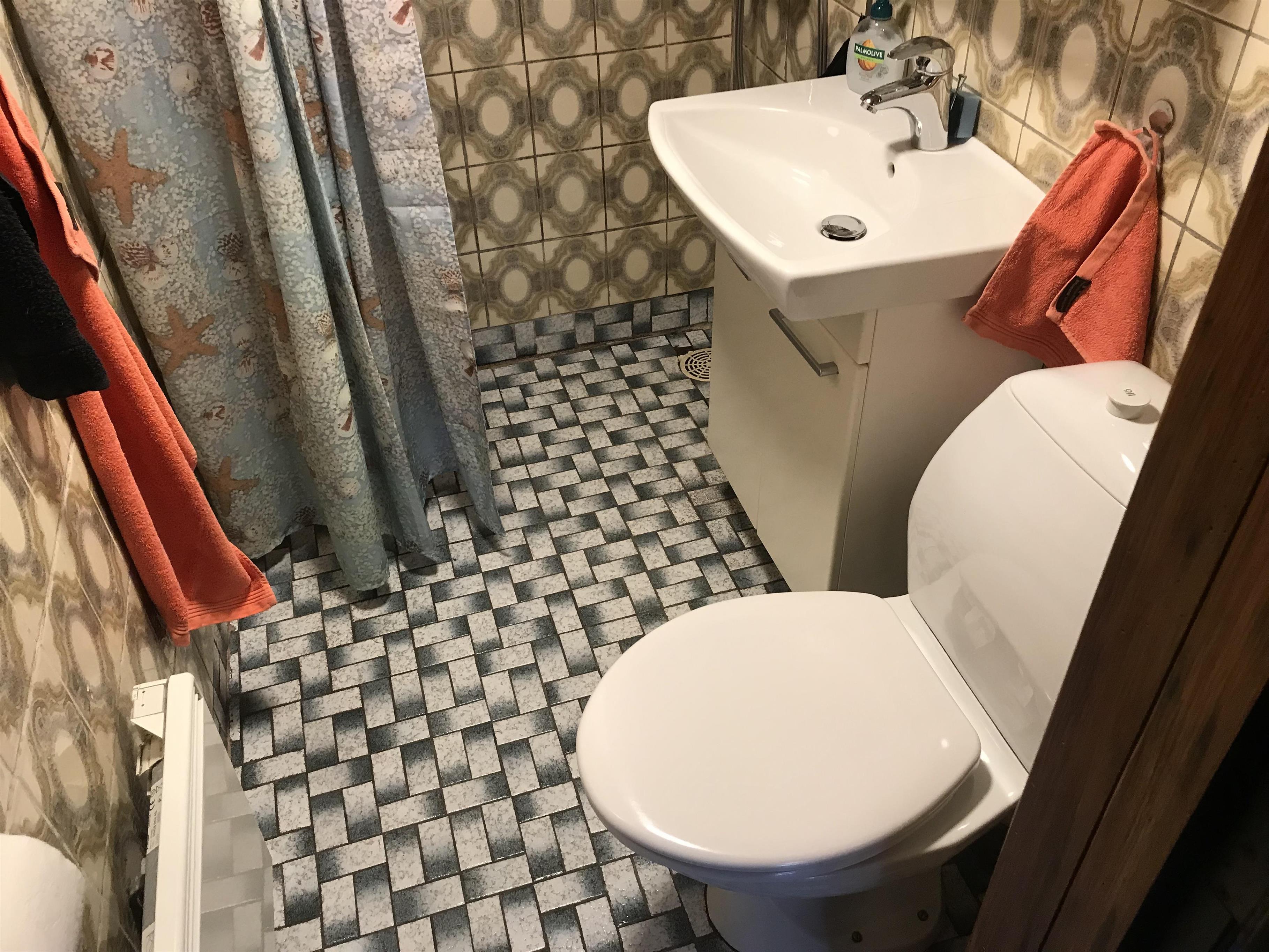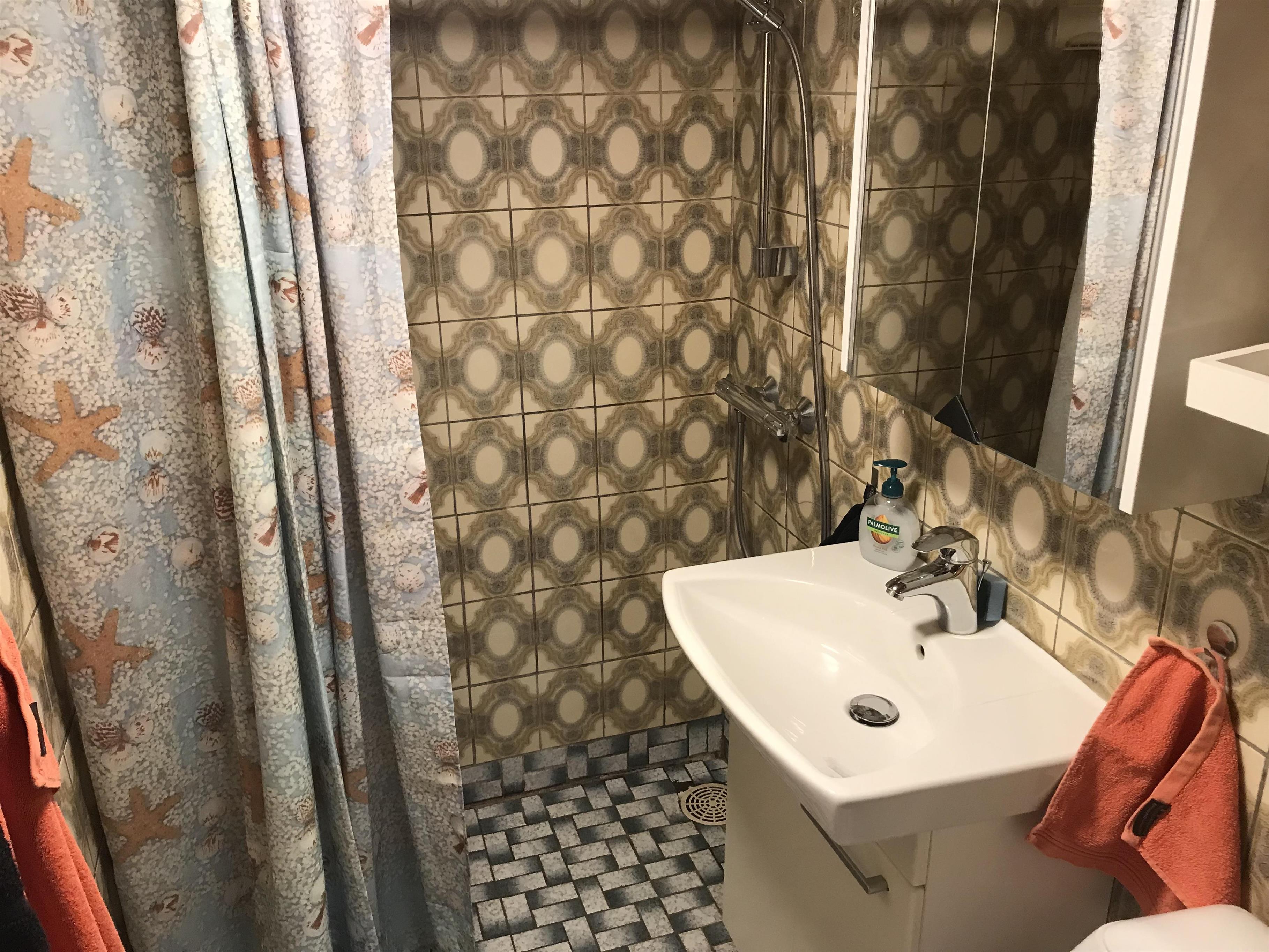 Badeværelse med toilet og brusebad. Huset har også vaskemaskine.