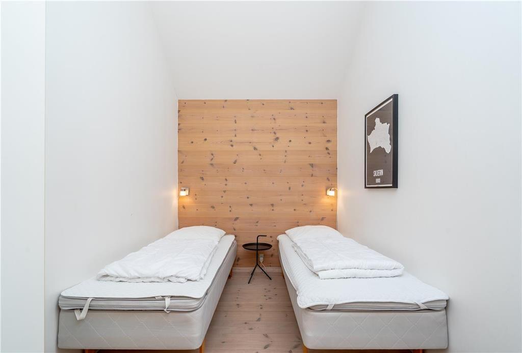 Rækkehuset, der er del af det populære feriekompleks Slusehusene, er et rigtigt kvalitetsbyggeri på 113 m2. Store sydvendte vinduer inviterer fjordlandskabet indenfor i stuen såvel som på det største af husets tre soveværelser, så fra sengen og lænestolene kan I nyde det flotte kig ud over vandet. Lysindfaldet er selvfølgelig også godt, og med loft til kip og en gennemført stilfuld indretning er der en skøn atmosfære i alle rum. Midt i opholdsrummet står en brændeovn, og i den ene ende venter køkkenet, der har spisebord og god plads til at kokkerere. Planløsningen byder også på to badeværelser, hvoraf det ene er med sauna og brusebad og det andet med spabad, og husets grovkøkken er indrettet med dybfryser, fiskerenseplads, vaskemaskine og tørretumbler.