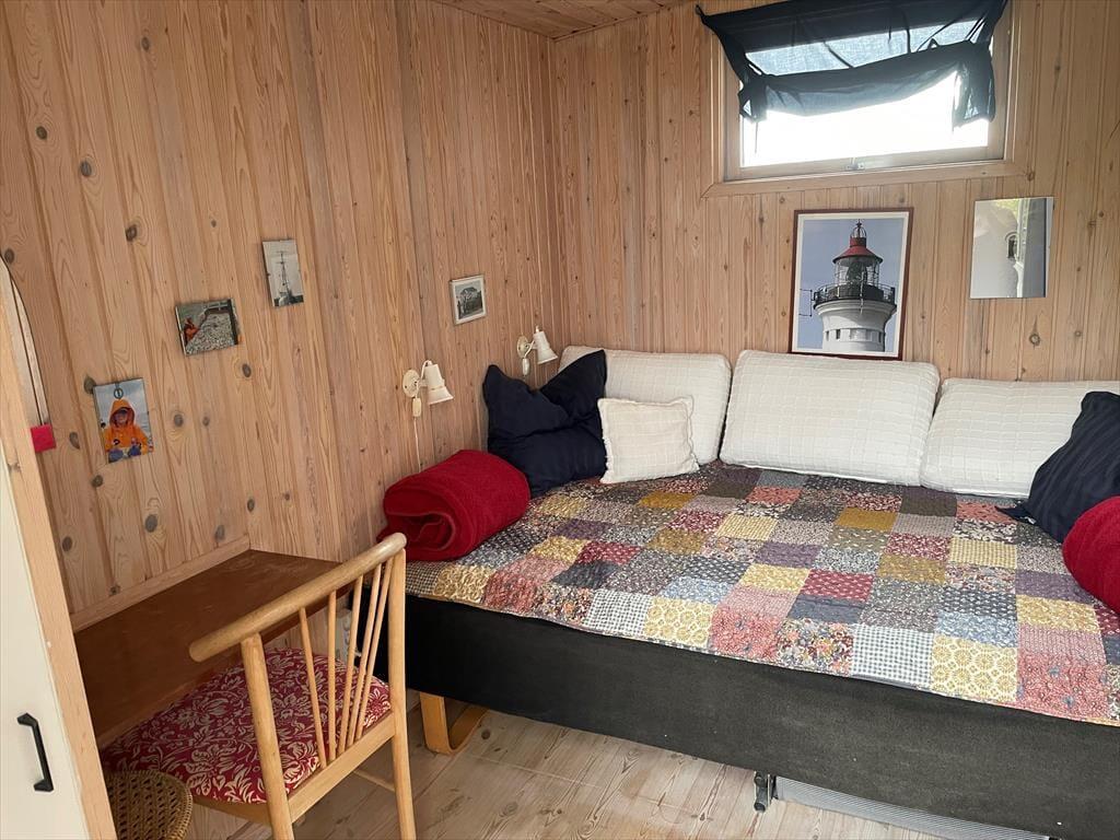 Det er ikke kun fra stuen, at I kan nyde synet af fjordens blå bølger: Når I ruller gardinet op i soveværelset, kan I se morgensolens første stråler på vandet– og skulle I have brug for at arbejde, har I også fjordudsigt fra kontoret. I stuen er vinduespartiet dog ekstra stort, hvilket forbedrer både udsynet og lysindfaldet, og så er det hyggelige rum indrettet med brændeovn, komfortabelt møblement, tv med Chromecast og andre gode detaljer. Et veludstyret køkken ligger i åben forbindelse med stuen, og planløsningen byder også på et badeværelse med bruser og gulvvarme. I sommerhusets anneks finder I endnu et soveværelse, og derfor er der i alt sengepladser til fire personer inden døre.