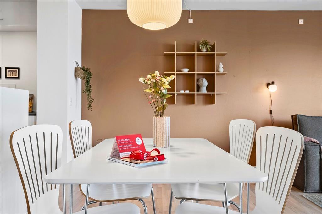 Ferielejligheden ligger på første sal i en velholdt ejendom med elevator. I entréen er der garderobe, og badeværelset er indrettet med gulvvarme, bruseniche og en praktisk vaskesøjle. Ferieboligen byder på et soveværelse med tv, terrasseadgang og to sengepladser, og en sovesofa i stuen giver jer yderligere to sovepladser. Køkkenet og stuen glider i ét i opholdsafdelingen, og det veludstyrede køkken giver god plads til at være sammen om at lave mad, mens opvaskemaskinen gør køkkentjansen efter måltidet let som en leg. Retterne kan serveres ved spisebordet, der også har god plads til brætspil. Stuen fuldendes af et sofaarrangement, hvor I kan hygge med film eller tv-serier.