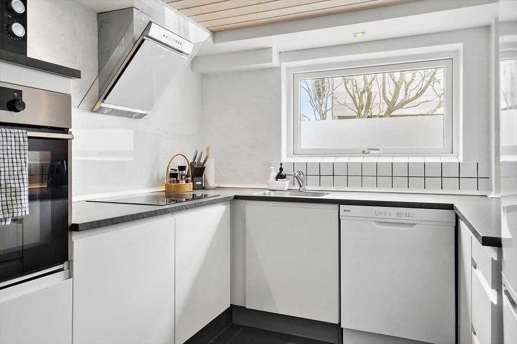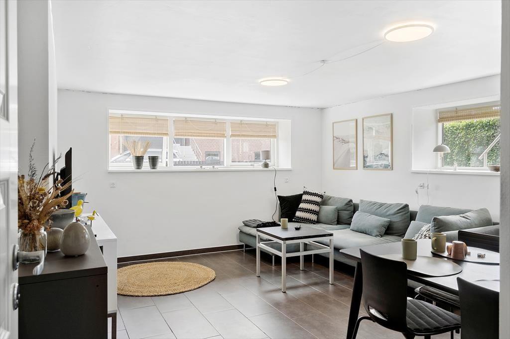 Mere præcist er der tale om en høj kælderlejlighed, der har brede vinduer i alle rum og en pæn indretning efter moderniseringen i 2021. Og inden døre finder du alt, hvad du skal bruge: Stuen har både sofa, spisebord og fladskærms-tv, når du vil hygge dig og slappe af, og når hvis bliver sulten, kan du trylle noget lækkert frem i det stilfulde og veludstyrede køkken. Badeværelset er med badekar, hvis du trænger til et varmt bad, når du vender hjem fra en cykeludflugt eller vandretur, og endelig sørger de to soveværelser for, at du og dine kære kan sove både godt og længe.
