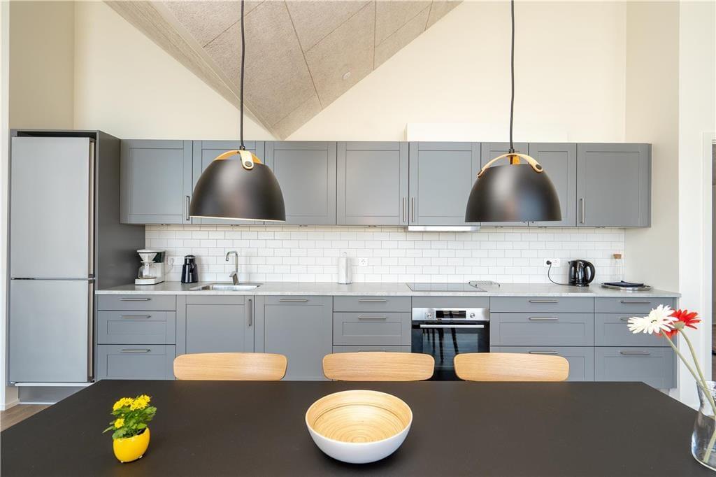 Lejligheden ligger i overetagen på et sammenbygget hus, og boligen byder på moderne komfort såsom akustiklofter. De tre værelser giver snildt sovepladser til seks personer, og begge badeværelser er indrettet med gulvvarme og bruseniche, mens det ene desuden byder på en praktisk kombi-vaskemaskine og wellness-faktor i form af en sauna. Opholdsafdelingen rummer et fuldt udstyret køkken med god plads til at være sammen om at lave mad. Retterne serveres let ved spisebordet, og skrånende akustiklofter sørger for en behagelig rumoplevelse, mens store vinduespartier bader rummet i naturligt lys. Med wi-fi og kabel-tv-pakke er aftenens underholdning sikret, og brændeovnen sørger for en behagelig temperatur og en hyggelig atmosfære.