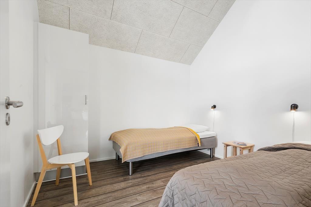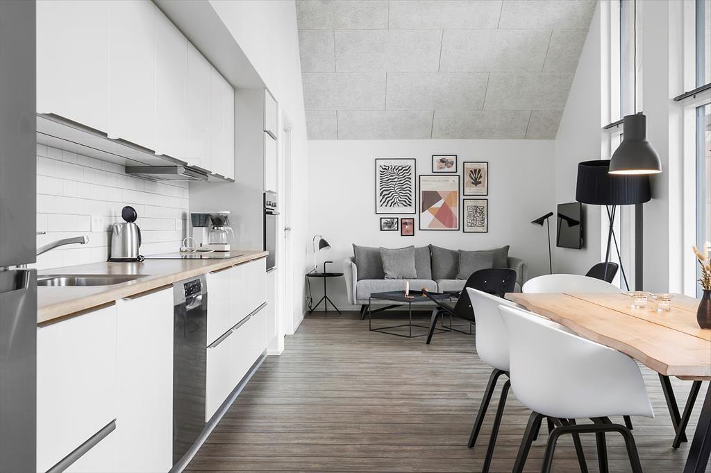 Ferielejligheden ligger på første sal i en arkitekttegnet ejendom fra 2020, og inden døre er det ikke kun fjordudsigten, der imponerer. Selve lejligheden byder nemlig på en stor stue, der er indrettet med flot interiør, inklusiv et åbent køkken, der er udstyret med alt, hvad I behøver for at kokkerere. I stuen er der skrå akustiklofter, og de store glaspartier sørger for et skønt lysindfald og giver jer nem adgang til terrassemiljøet. Bliver I inden døre, er det let at fortabe sig i udsigten til vandet, der tager sig godt ud i al slags vejr – også om aftenen med månens genskin i vandspejlet. Når I er klar til at sige godnat, har I tre gode soveværelser at gå til ro på. Planløsningen byder for øvrigt på to flotte badeværelser, og derfor egner lejligheden sig godt til seks personer.