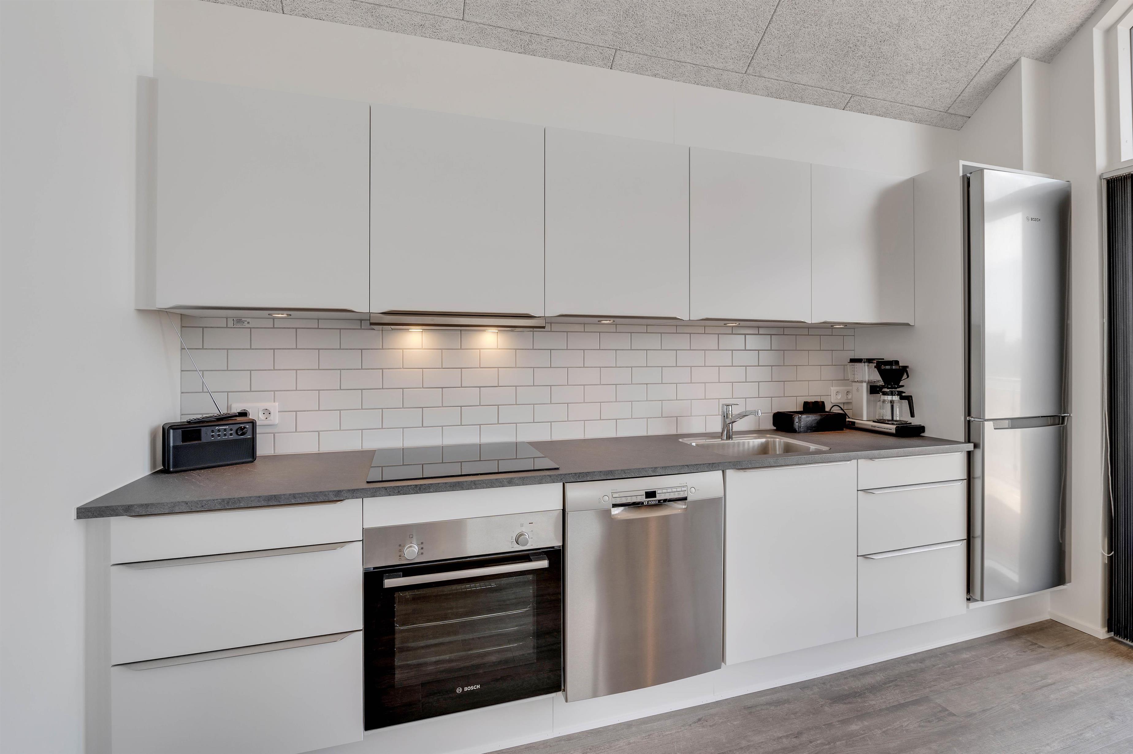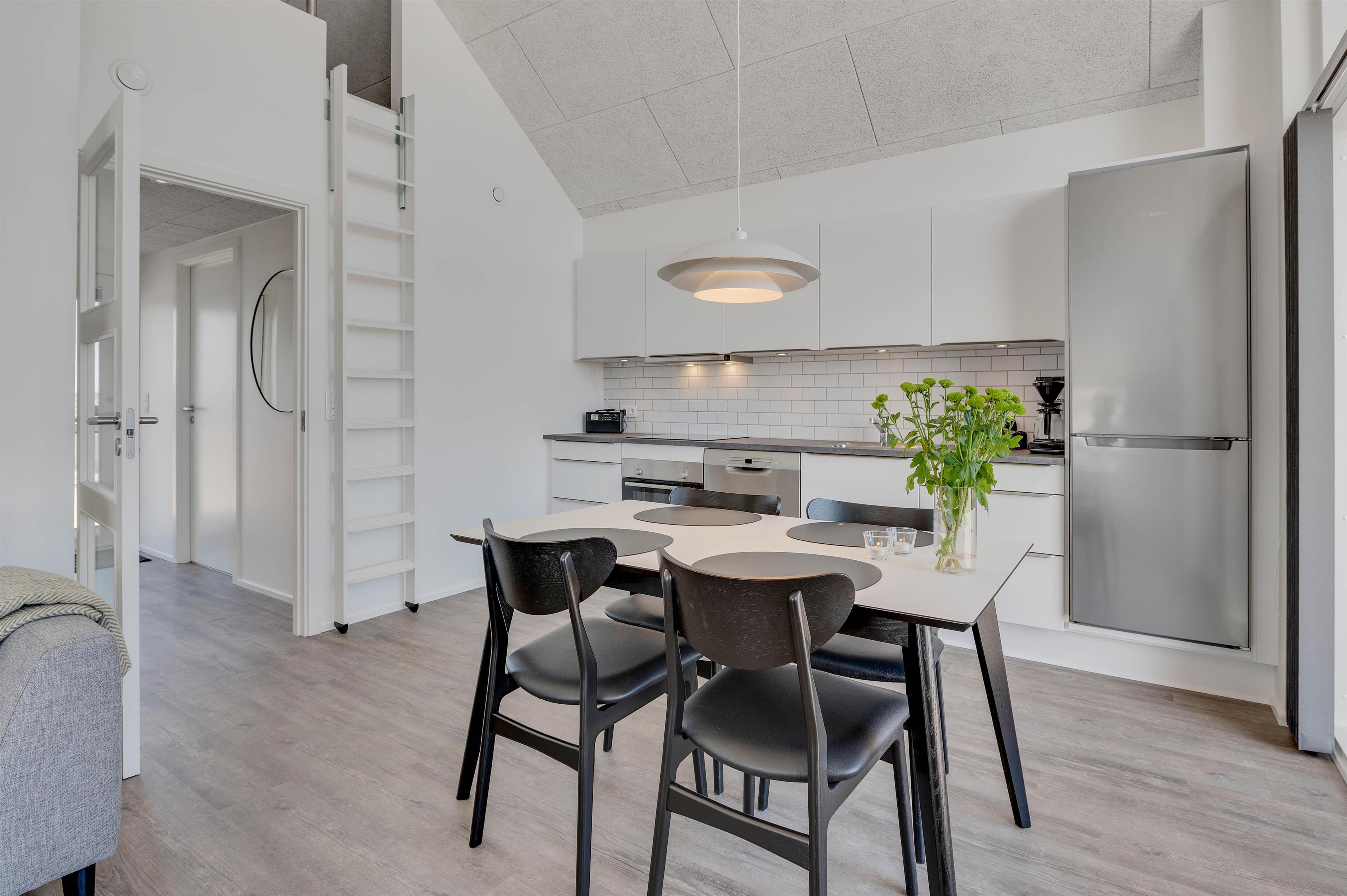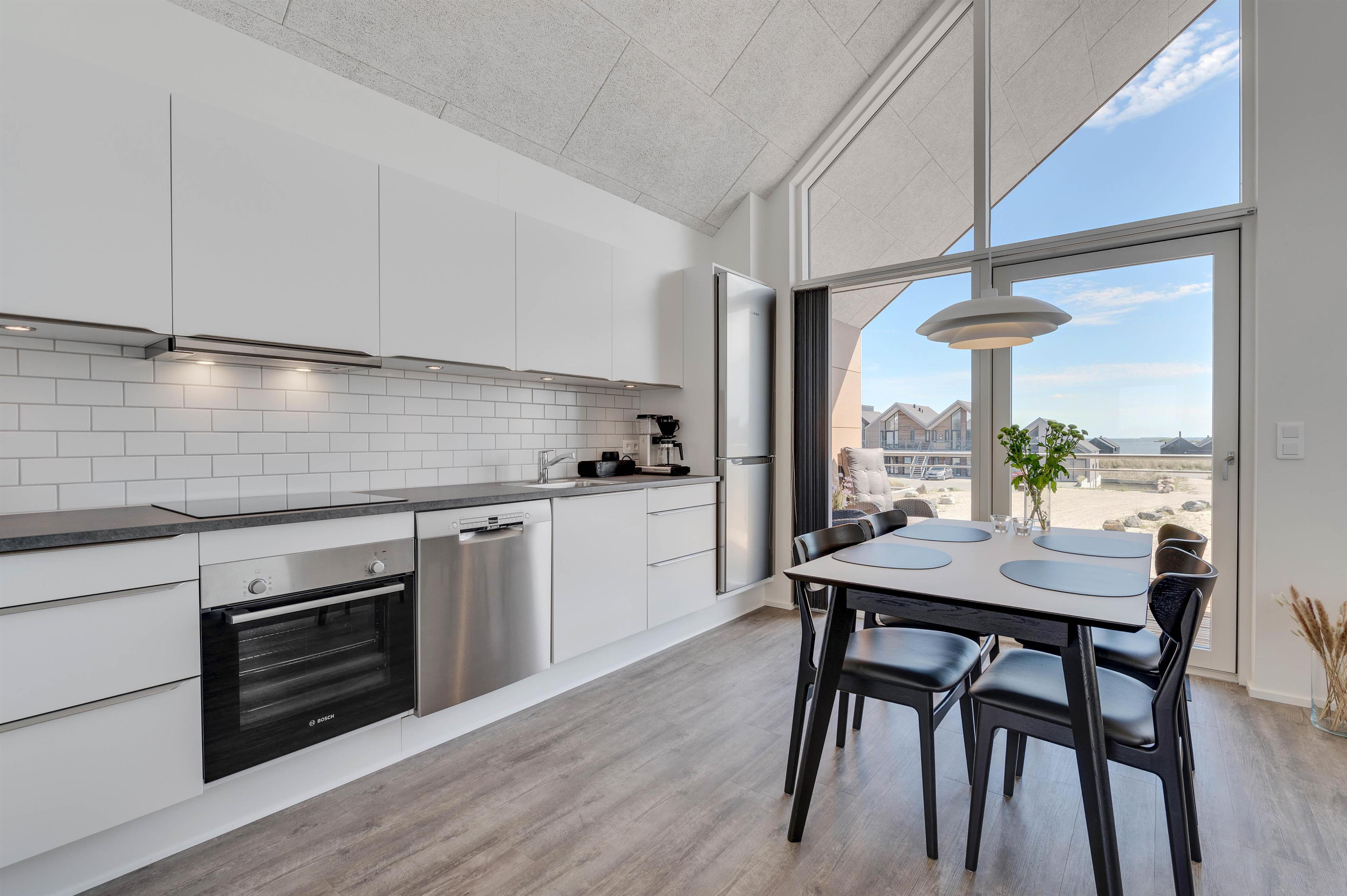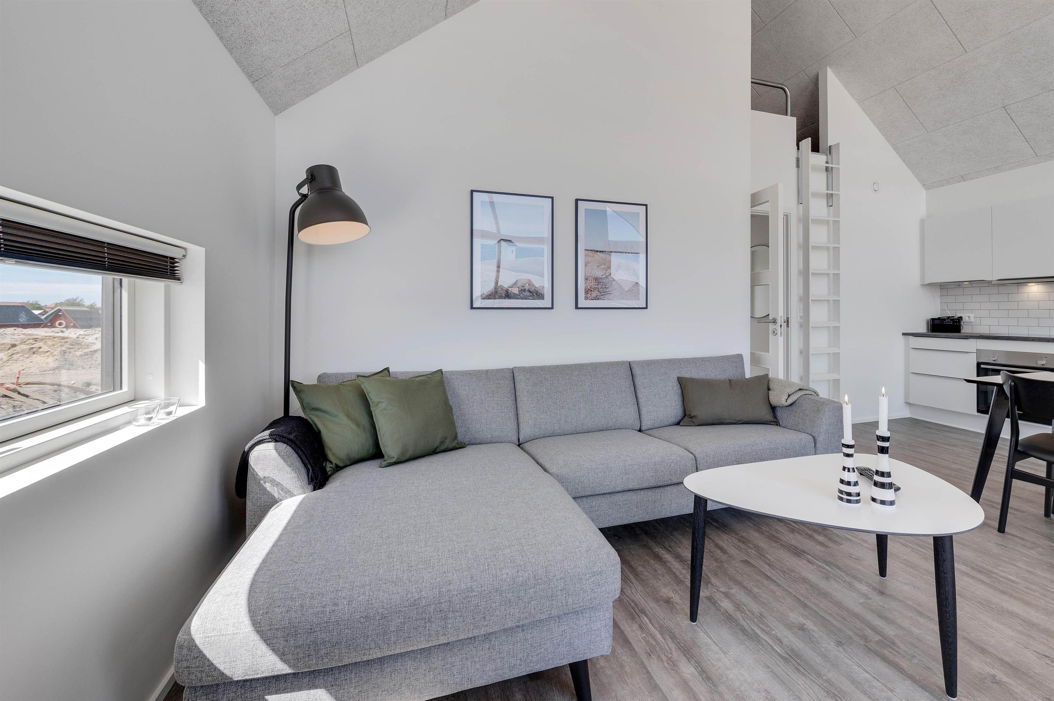 Køkken og stue er samlet i et stort opholdsrum, som er ferielejlighedens centrum. Stedet, hvor masser af gode stunder med hygge i sofaerne og madlavning i køkkenet, finder sted.