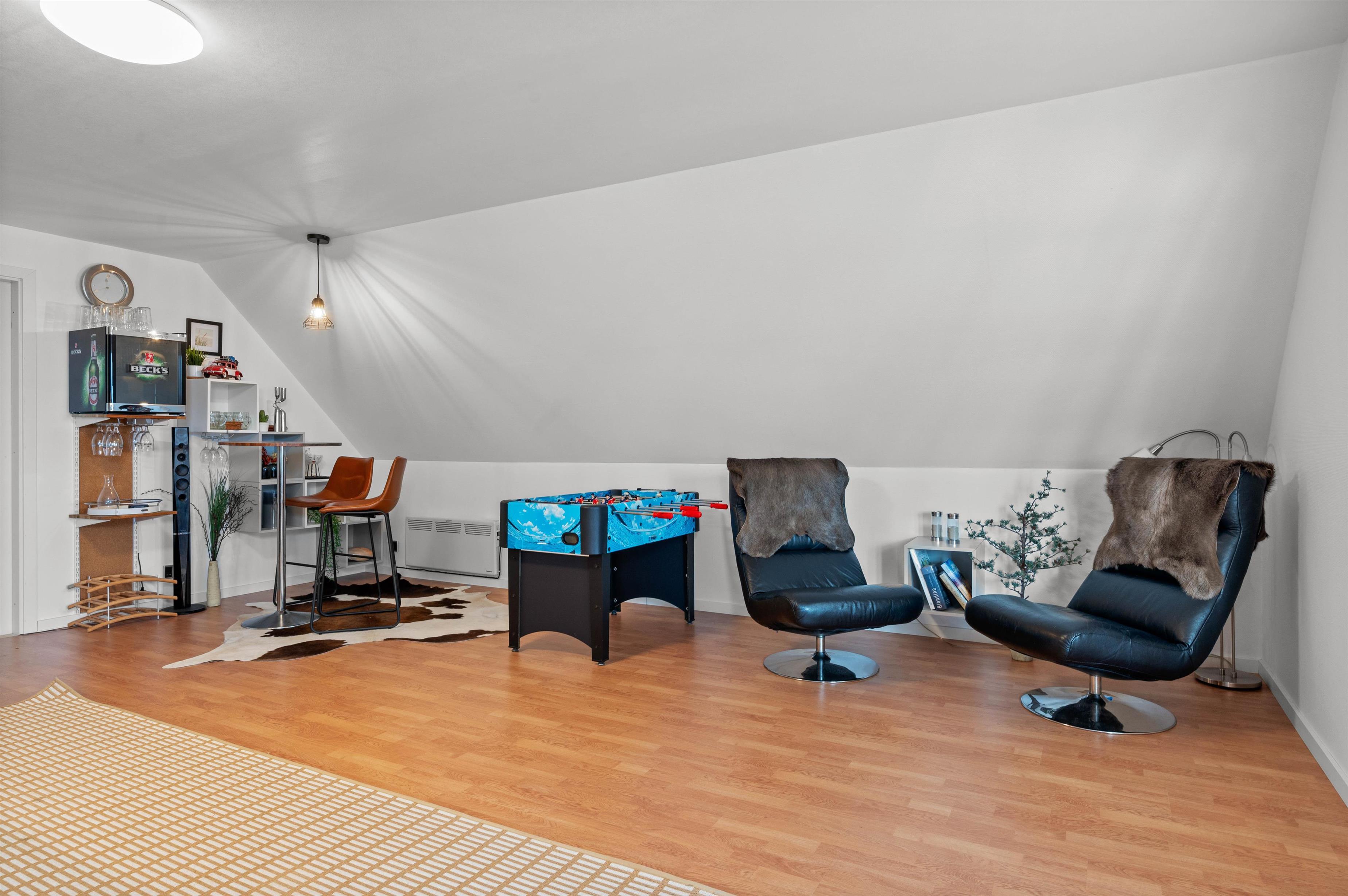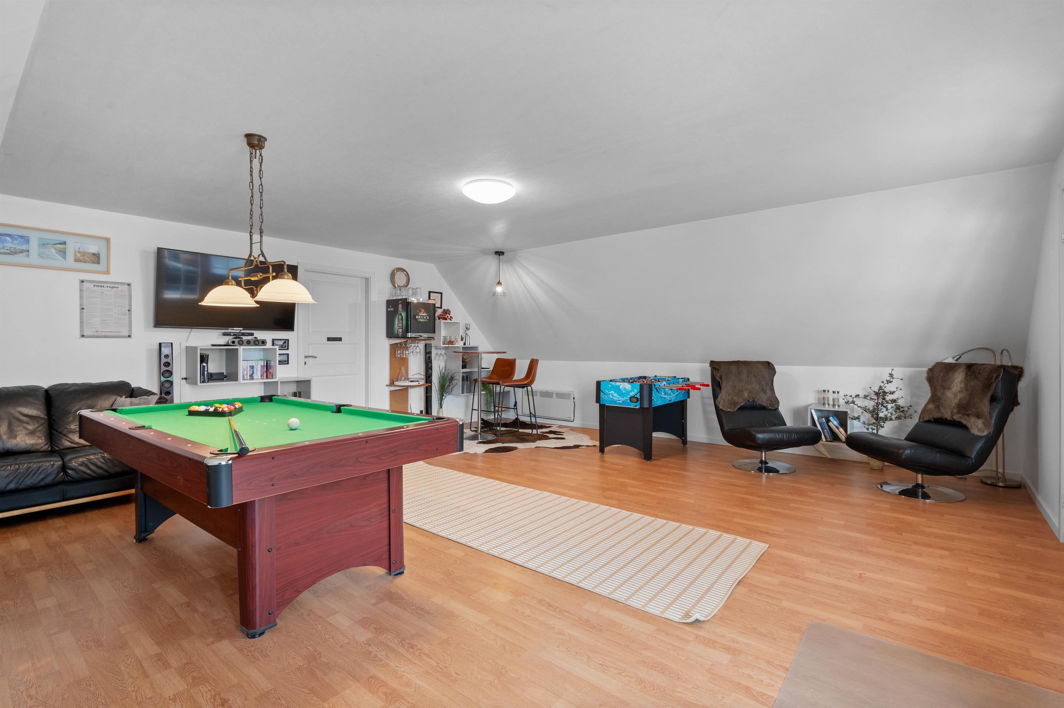 På første sal er der et hyggeligt aktivitetsrum med poolbord, dart og et sjovt spillebord til børnene. Her kan familien tilbringe mange sjove timer, måske endda lave en feriekonkurrence? Der er udgang til skøn, overdækket terrasse med vidunderlig udsigt.