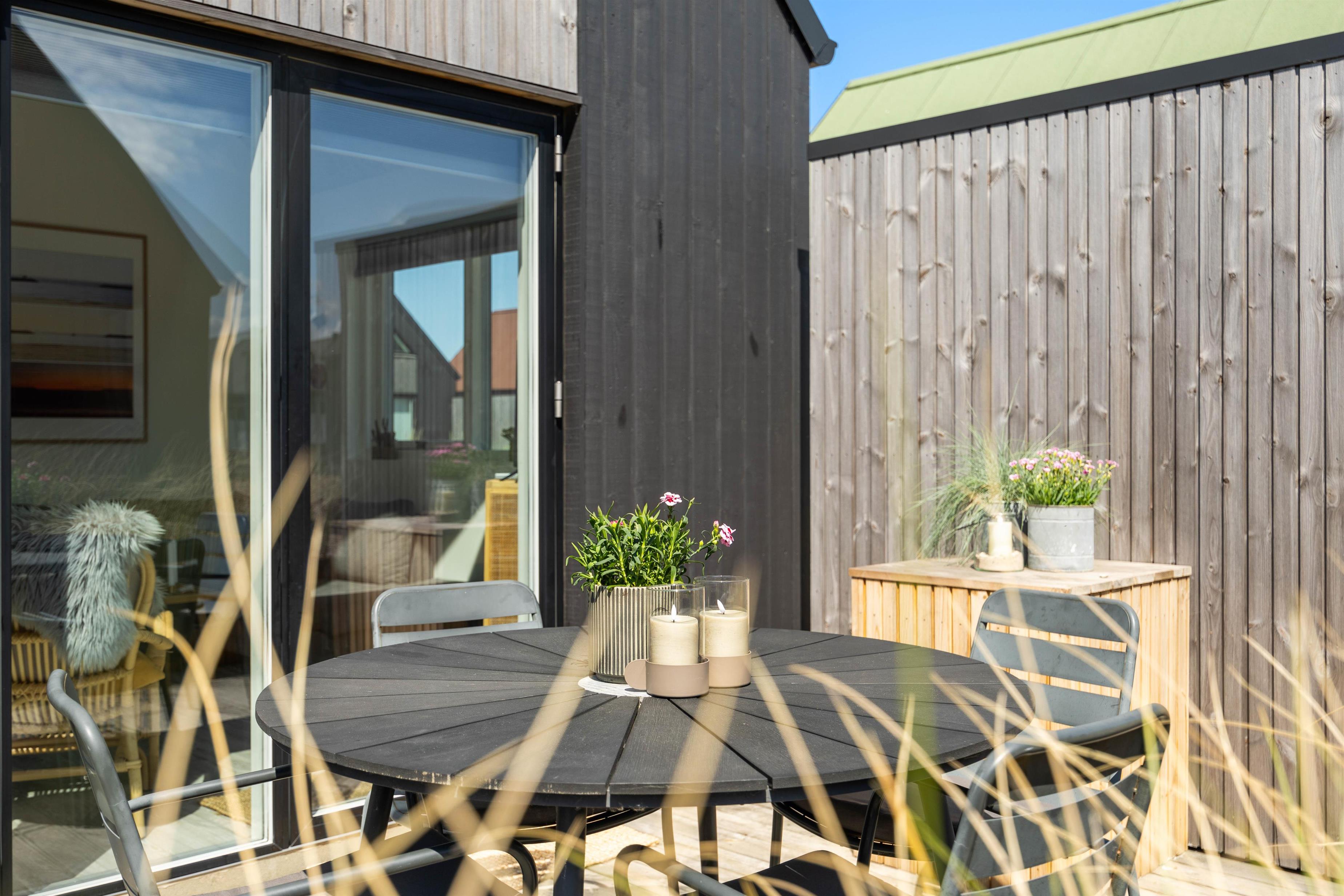 Dette nydelige feriehus er beliggende ved den gamle fjordhavn og tæt på Hvide Sandes lystbådehavn. Den afskærmede terrasse er sydvendt, og her kan I nyde de varme sommerdage og aftener på husets havemøbler og liggestole. På terrassen er det også muligt at nyde en lækker aftensmad lavet på husets gasgrill, imens I kan nyde synet af solen, der går ned i Vest.