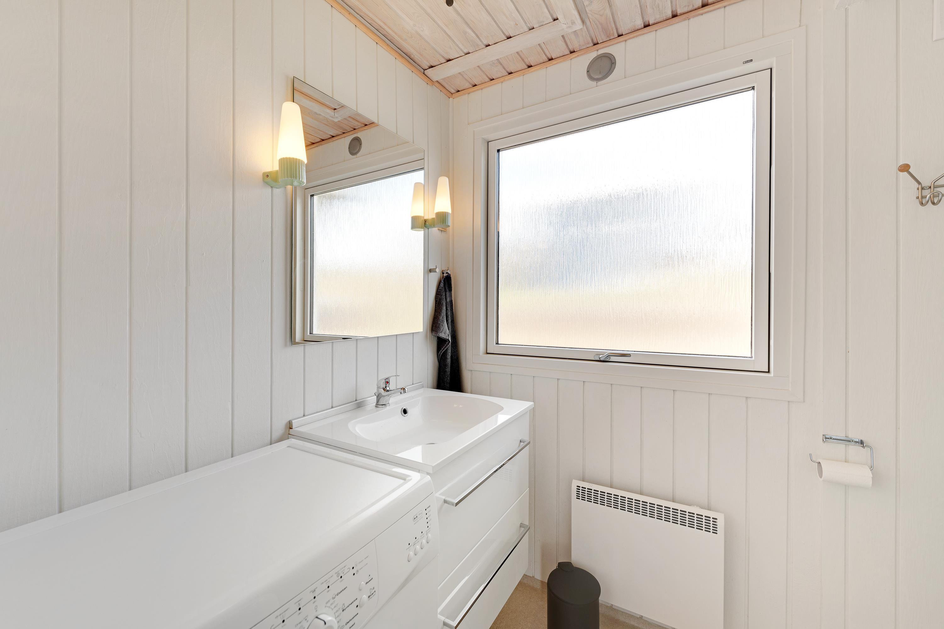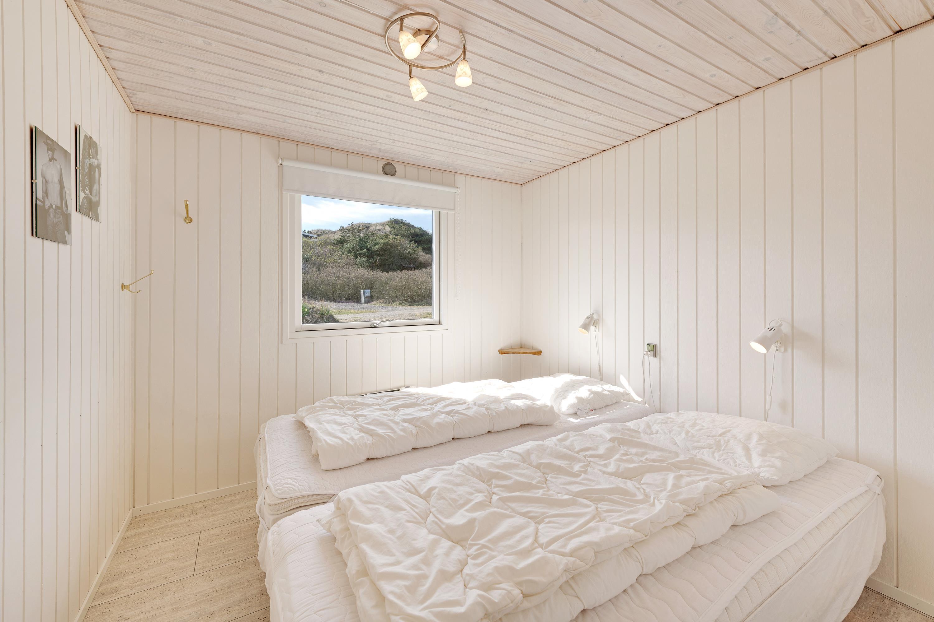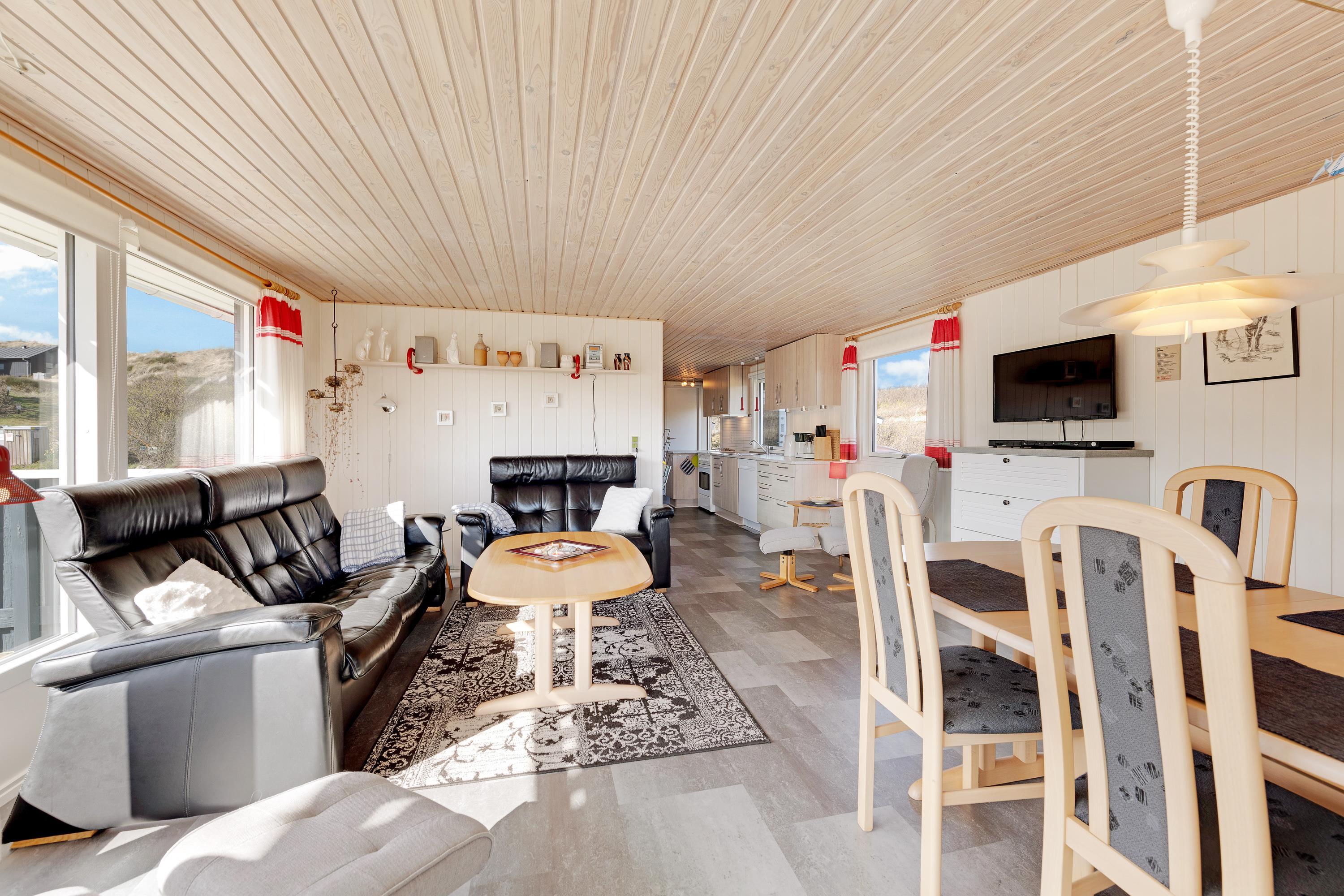 Allerede ved første øjekast mærker man feriestemningen i dette sommerhus: De lyse vægge og lofter og det store vinduesparti gør huset lyst og åbent. Stuen og værelserne er indrettet med hyggelige sommerhusmøbler, og I får tid til ekstra meget afslapning, når opvaskemaskinen og vaskemaskinen tager sig af det praktiske.