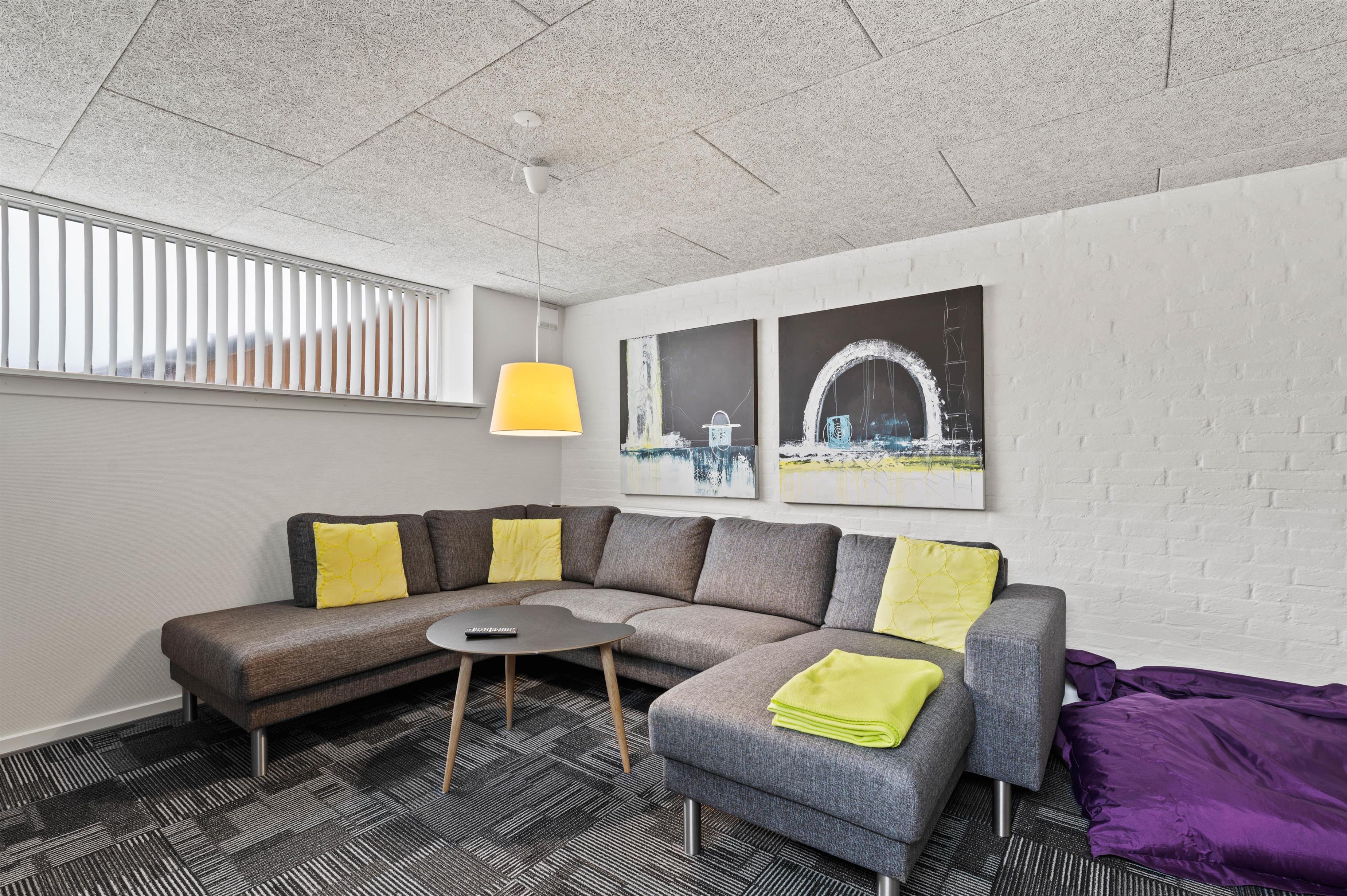 I den nederste etage finder du det andet badeværelse med vaskemaskine og tørretumbler, samt endnu en stue med en behagelig sofa og tv. Praktisk, hvis I vil se forskellige tv-programmer samtidig. For dem, der gerne vil bruge ekstra energi på ferien, findes også aktivitetsrummet hernede.