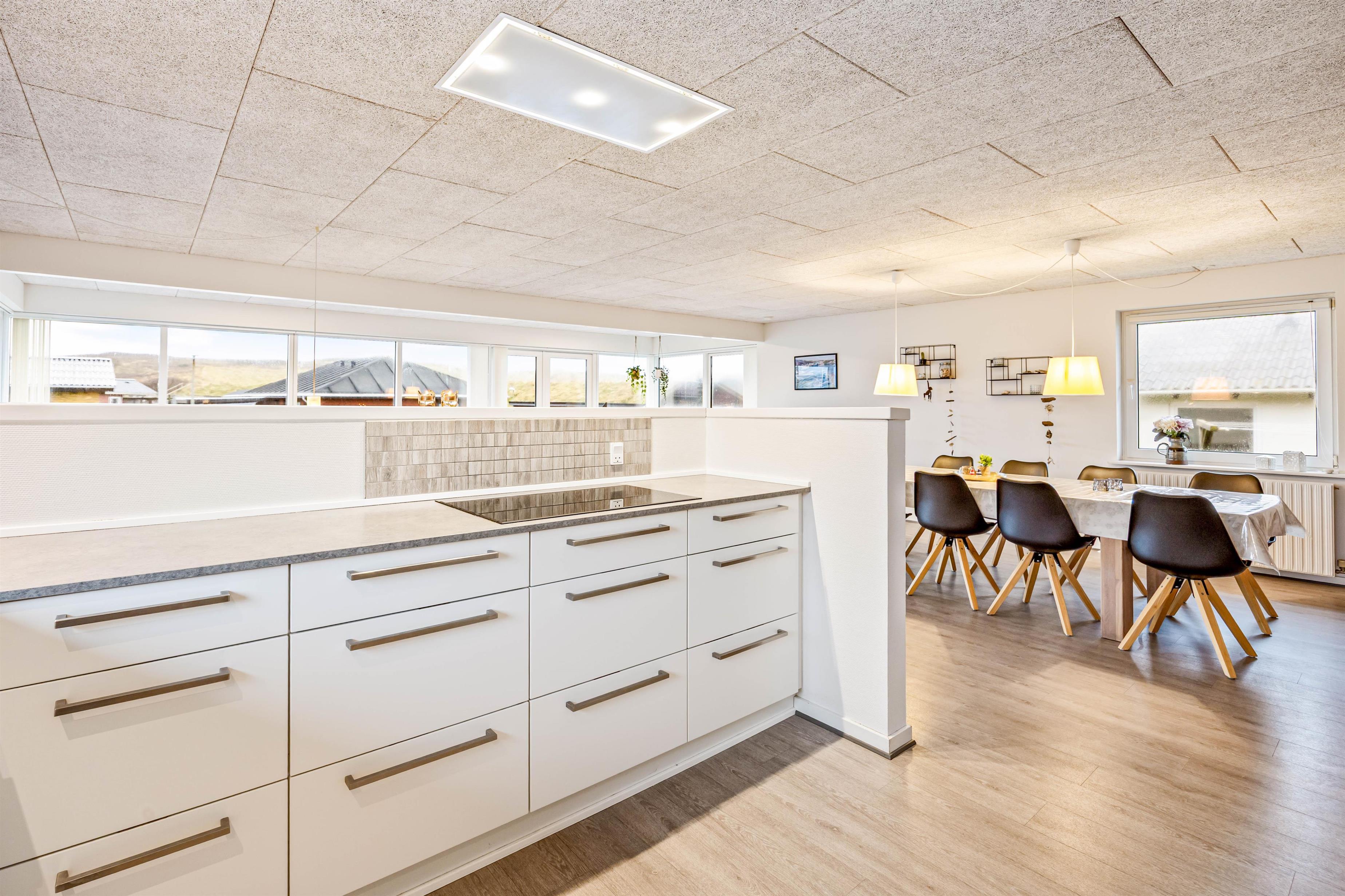 Sommerhuset er opdelt i en soveafdeling og en opholdsafdeling. I opholdsafdelingen er køkkenet åbent i forbindelse med alrum og stue. I det veludstyrede køkken finder du opvaskemaskine, mikroovn, køleskab og induktionskomfur. Lystfiskere vil blive glade for en 60 liters fryser. Her kan I sammen fremtrylle et lækkert måltid i det åbne køkken, eller se en film i stuen senere om aftenen. Det fine lysindfald giver et smukt og lyst udtryk, og indbyder til at hygge sig her.