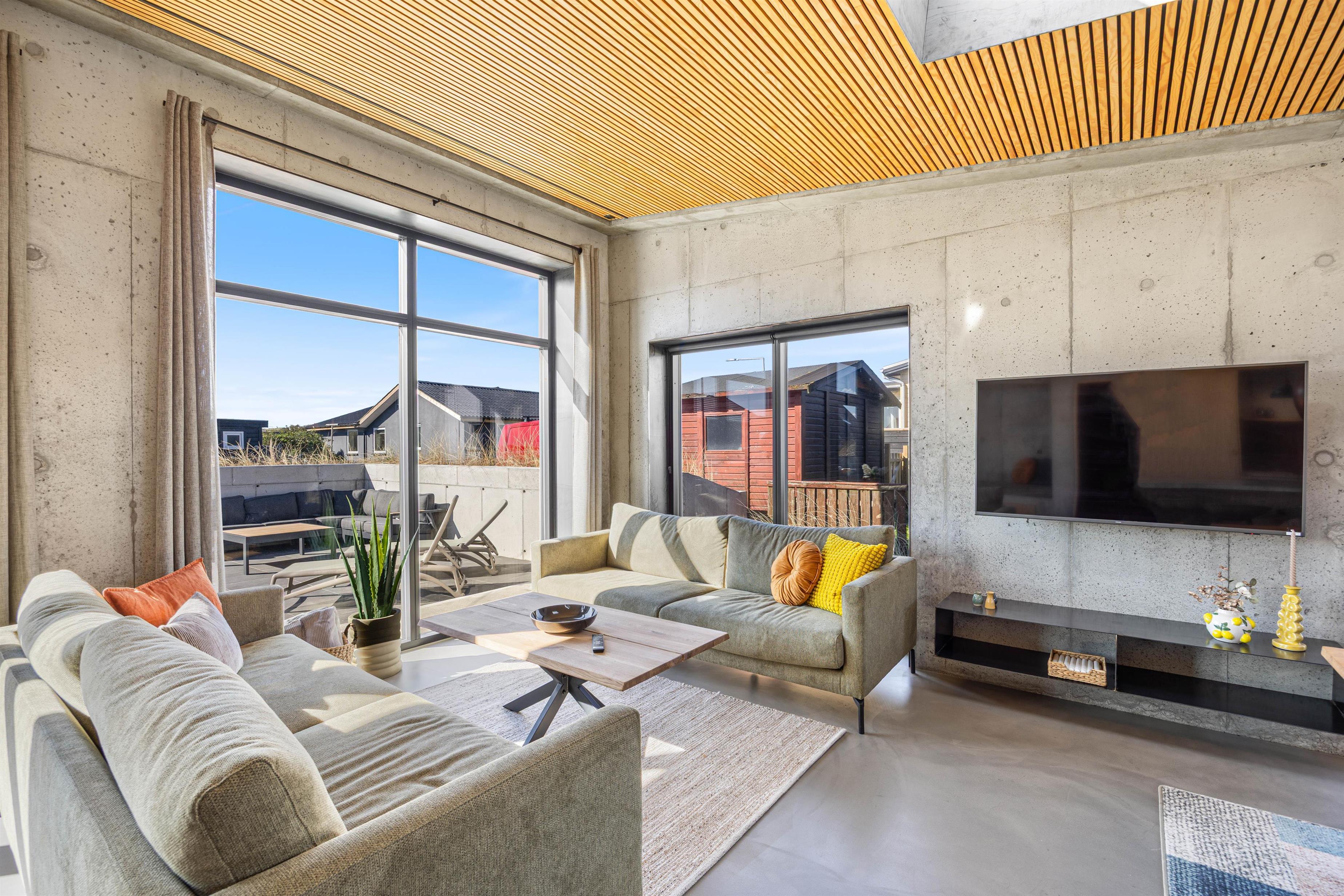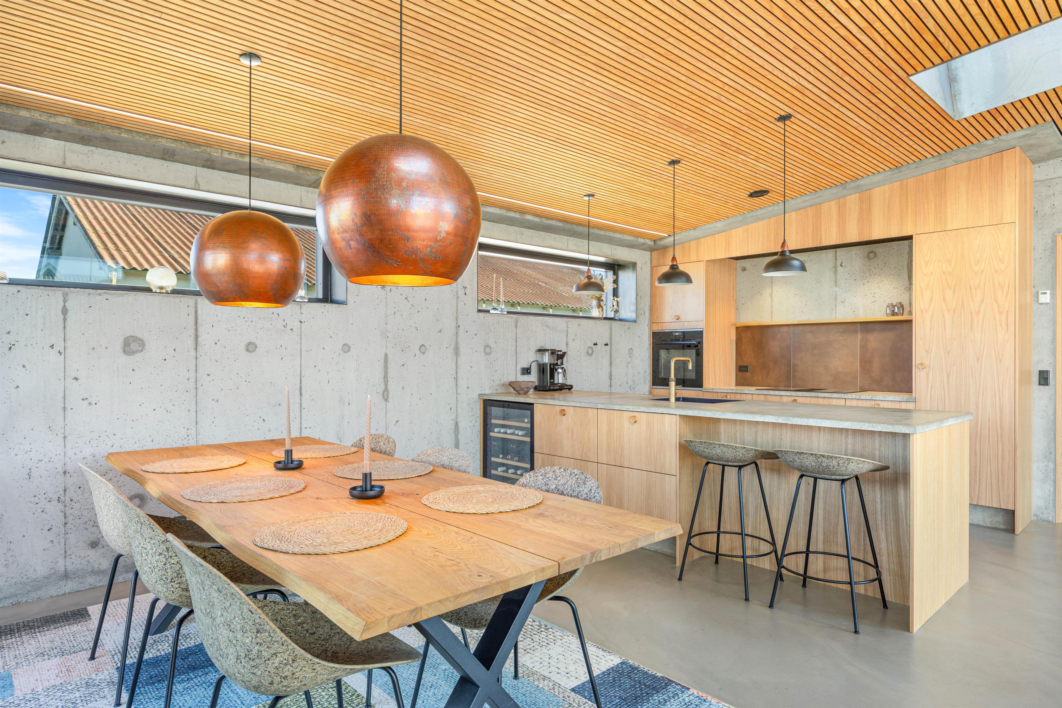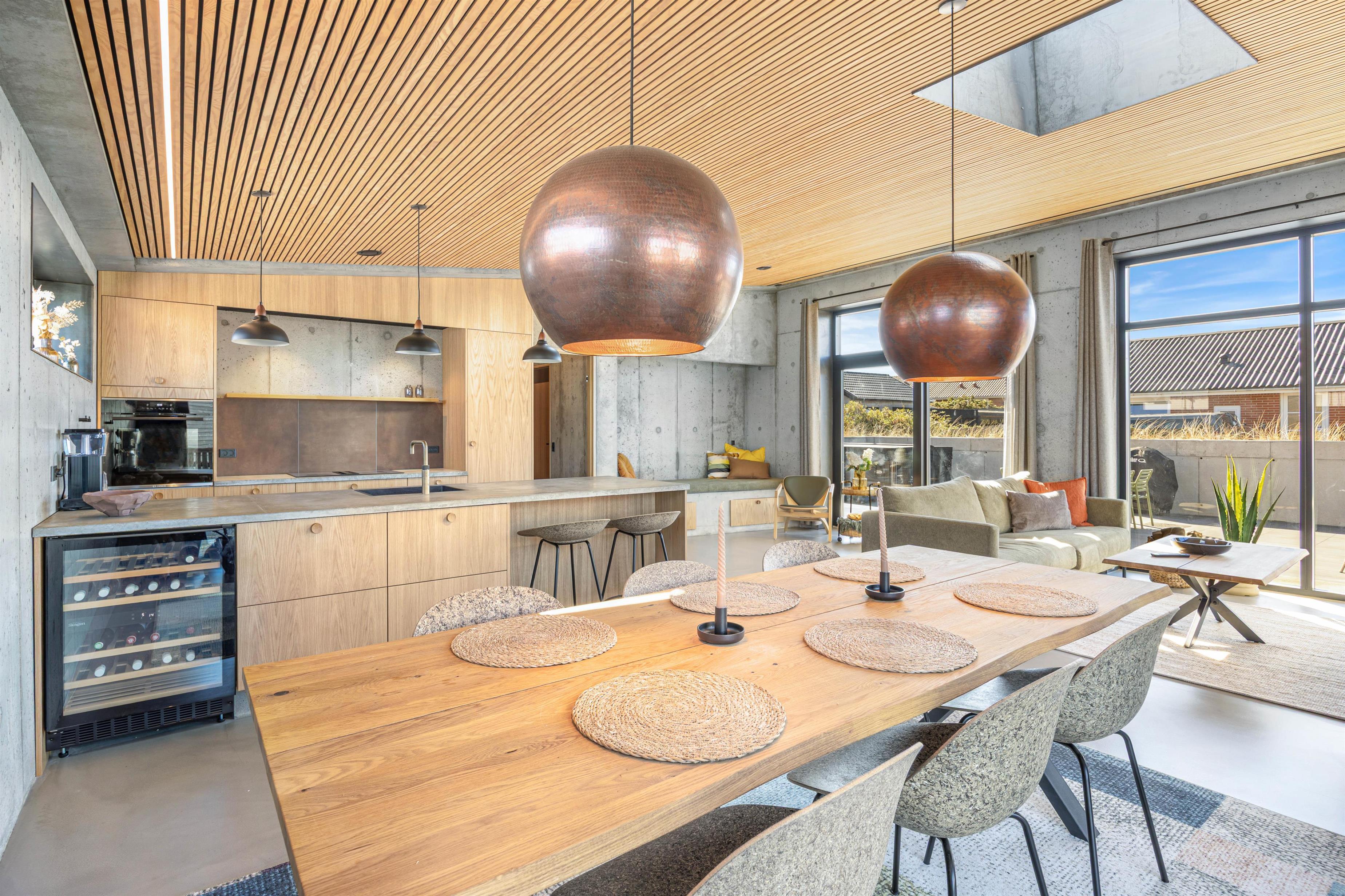 Indretningen er moderne og i skandinavisk stil. Det smukke træ står smukt mod det rustikke betongulv, og her skabes en afslappende atmosfære. Hjerterummet er åbne køkkenalrum, hvor de store vinduer inviterer dagslyset indenfor. Det veludstyrede køkken, stue samt spiseplads smelter her sammen i ét. Med plads til hele familien kan I samles til hyggeligt samvær - uanset om det er afslapning på sofaen, tilberedning af lækre måltider eller hyggelige brætspilsaftner. Fra alrummet er der direkte udgang til terrassen.
