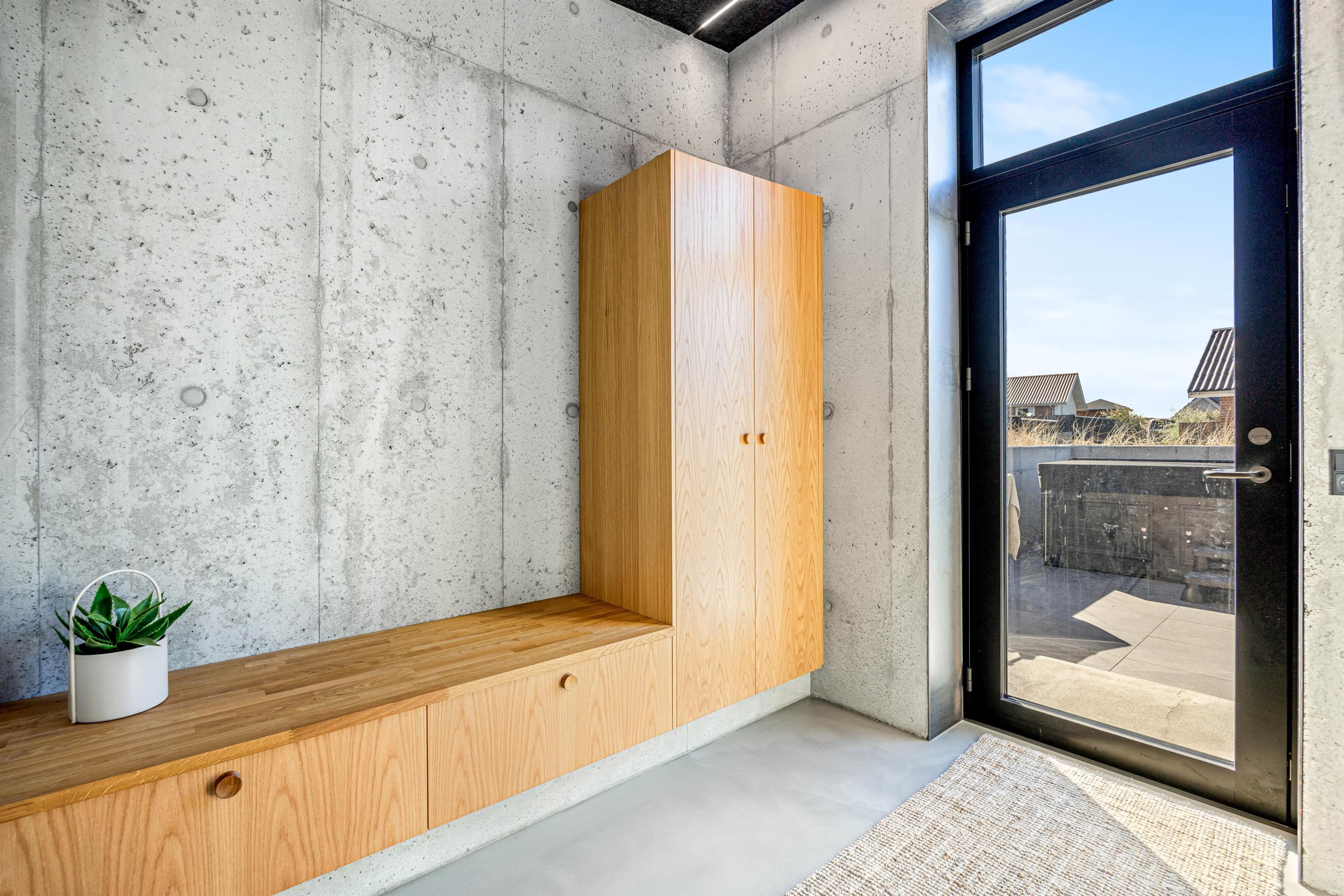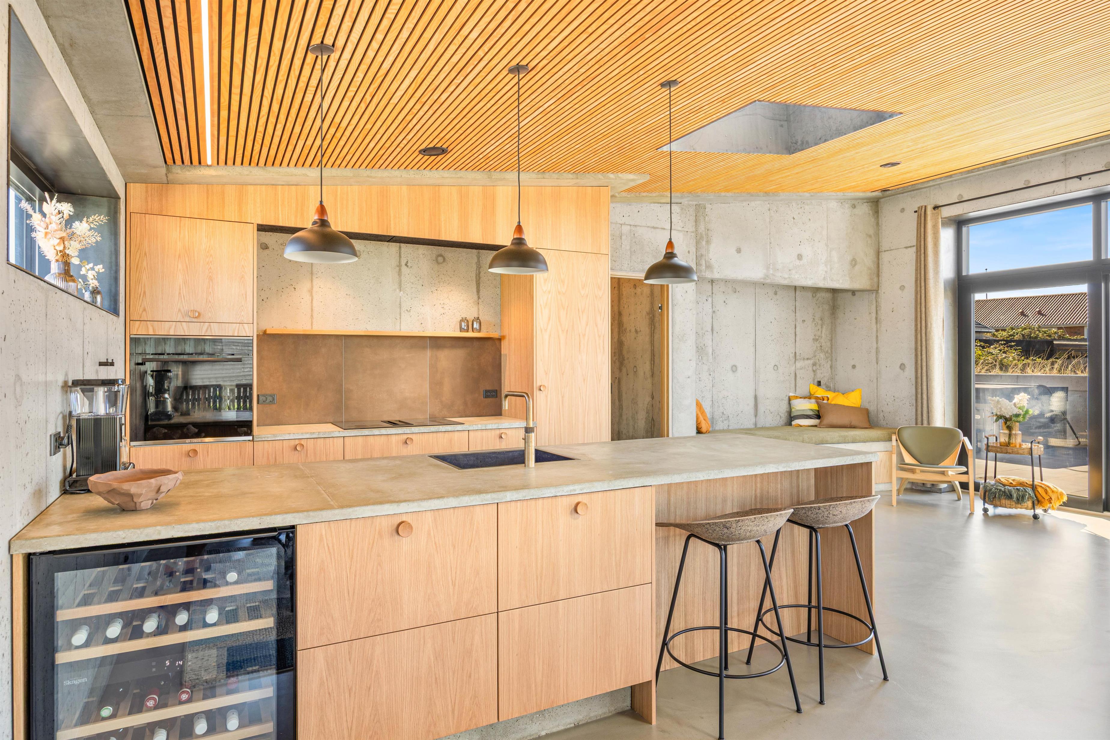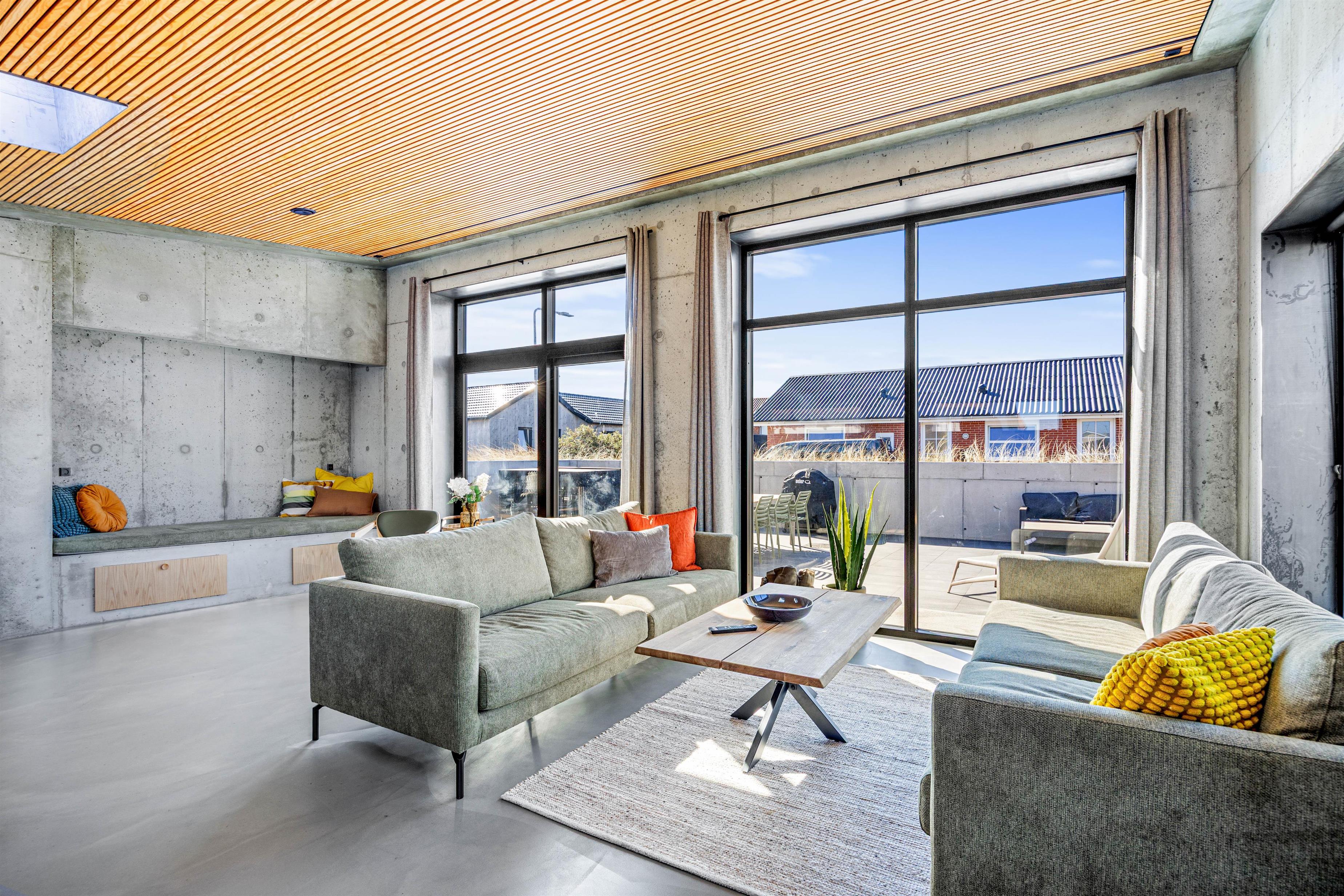 Indretningen er moderne og i skandinavisk stil. Det smukke træ står smukt mod det rustikke betongulv, og her skabes en afslappende atmosfære. Hjerterummet er åbne køkkenalrum, hvor de store vinduer inviterer dagslyset indenfor. Det veludstyrede køkken, stue samt spiseplads smelter her sammen i ét. Med plads til hele familien kan I samles til hyggeligt samvær - uanset om det er afslapning på sofaen, tilberedning af lækre måltider eller hyggelige brætspilsaftner. Fra alrummet er der direkte udgang til terrassen.