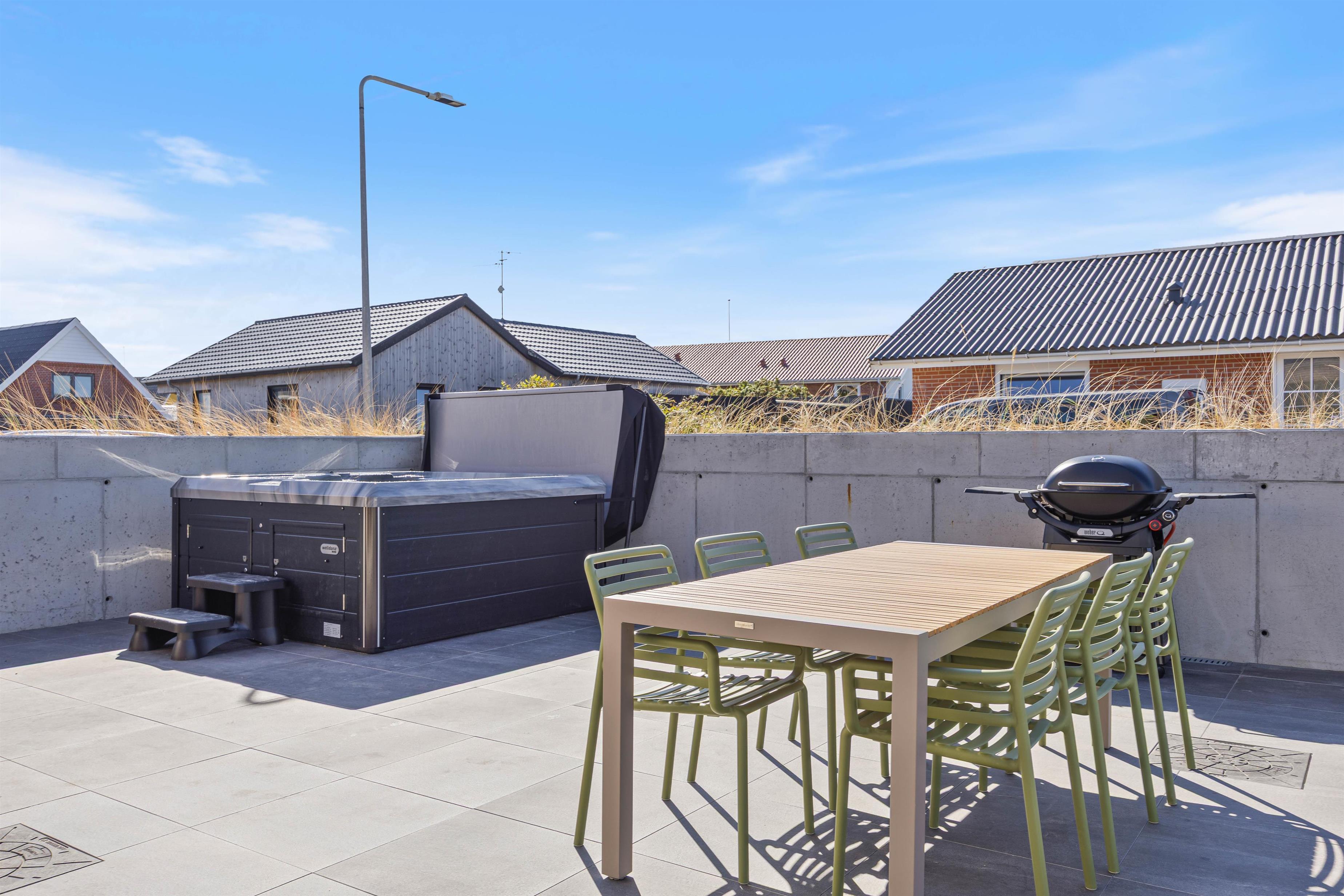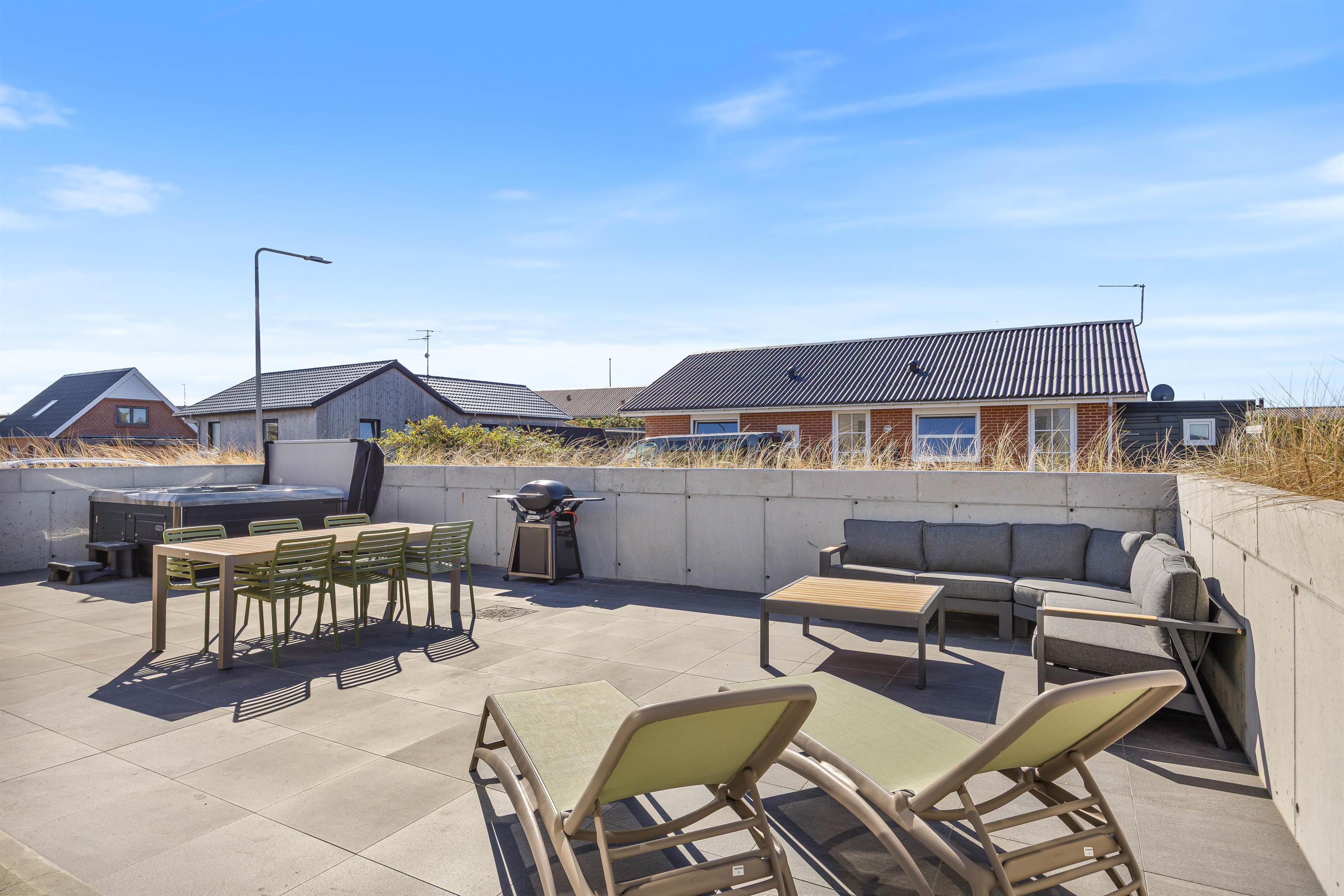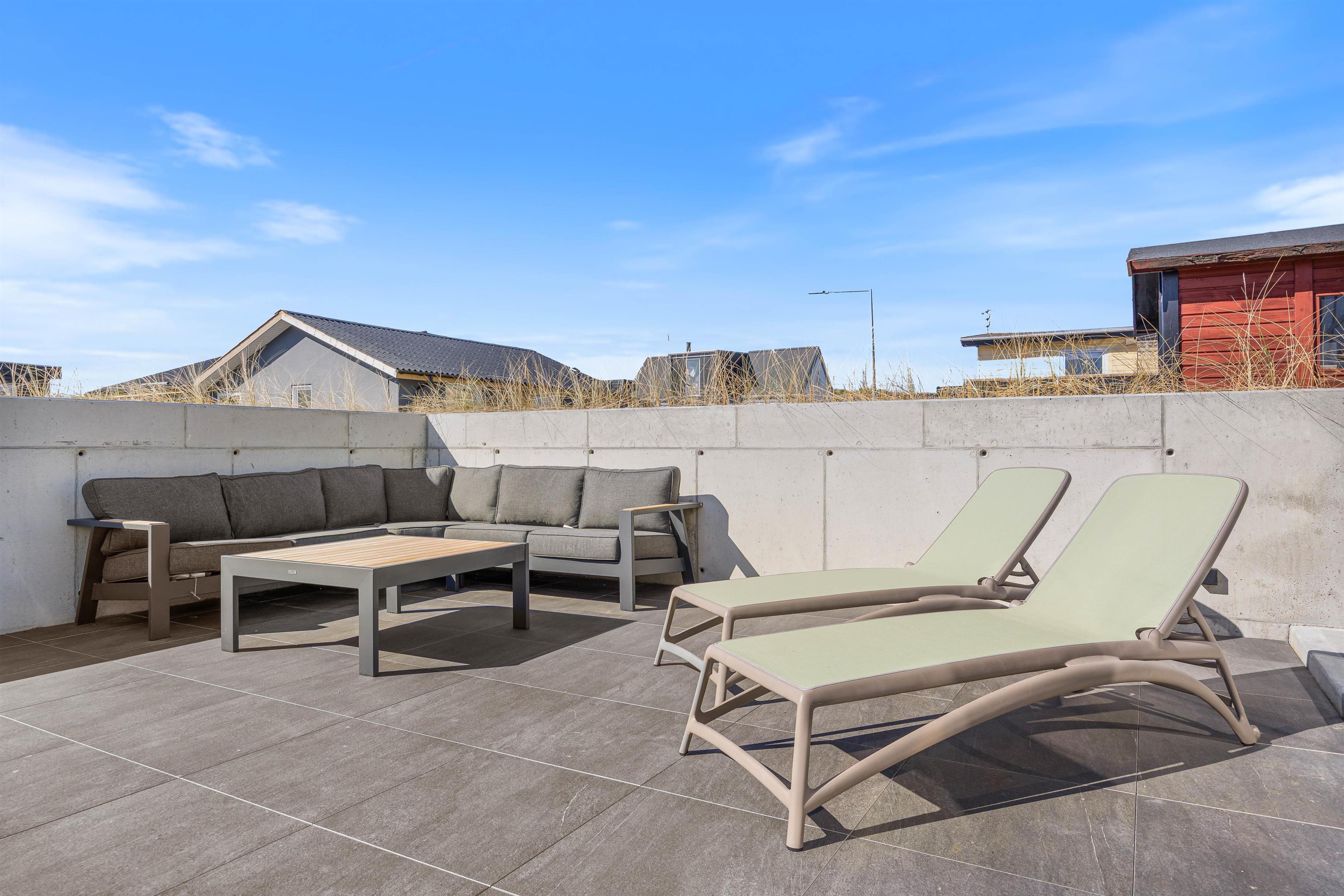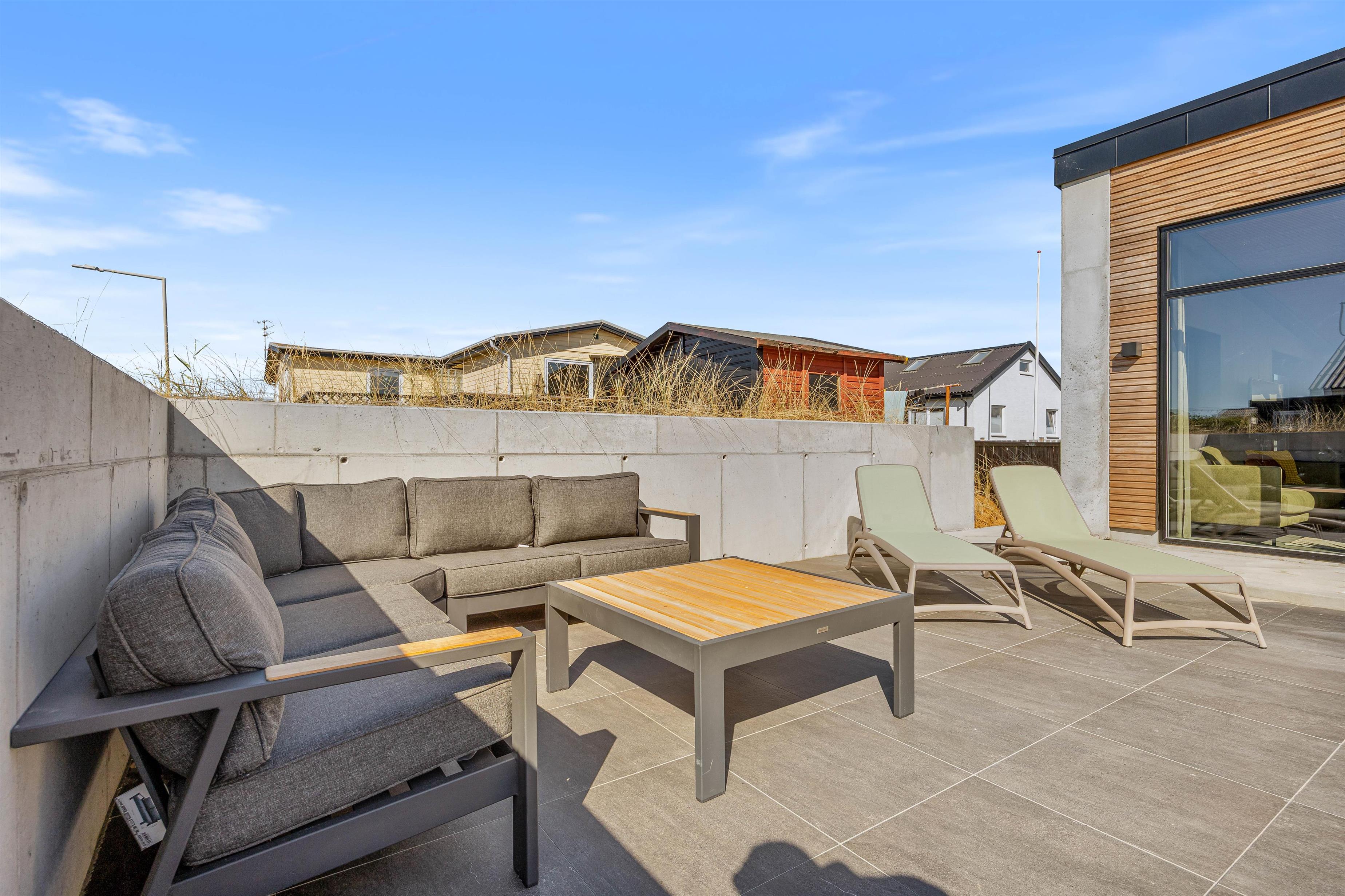 Feriehusets terrasse er lukket, hvilket skaber et trygt sted for både børn og hunde at lege. Her kan I nyde solskinstimerne, starte dagen med en kop kaffe og afslutte en dejlig dag med lækker aftensmad og et glas vin. Havemøbler, liggestole og en gasgrill står til jeres rådighed.