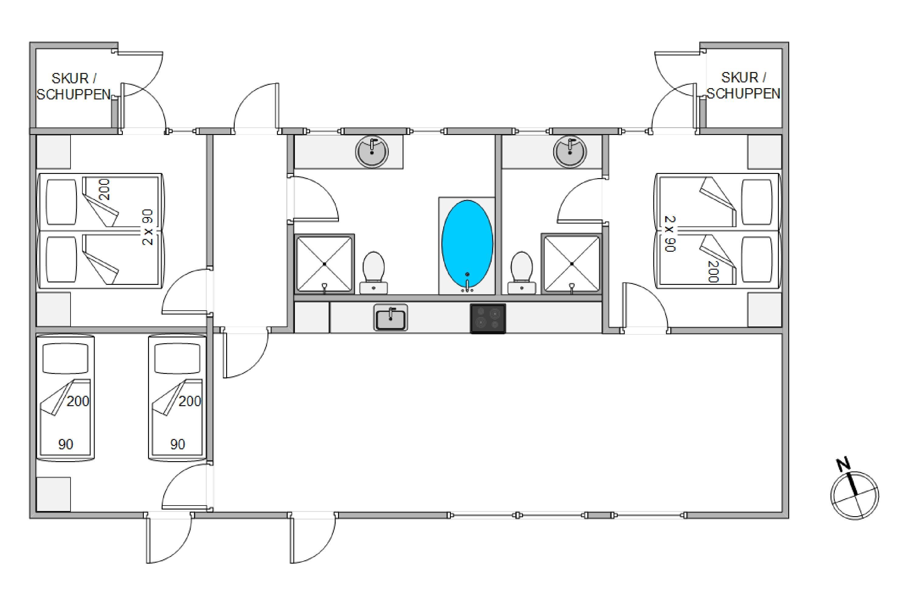 De godt 100 kvadratmeter er desuden indrettet med 2 badeværelser, så I undgår kø til badet om morgenen – og det ene gemmer endda på et spabad, så der er mulighed for at tilføre et ekstra strejf af wellness og gøre ferieopholdet endnu mere afslappende.