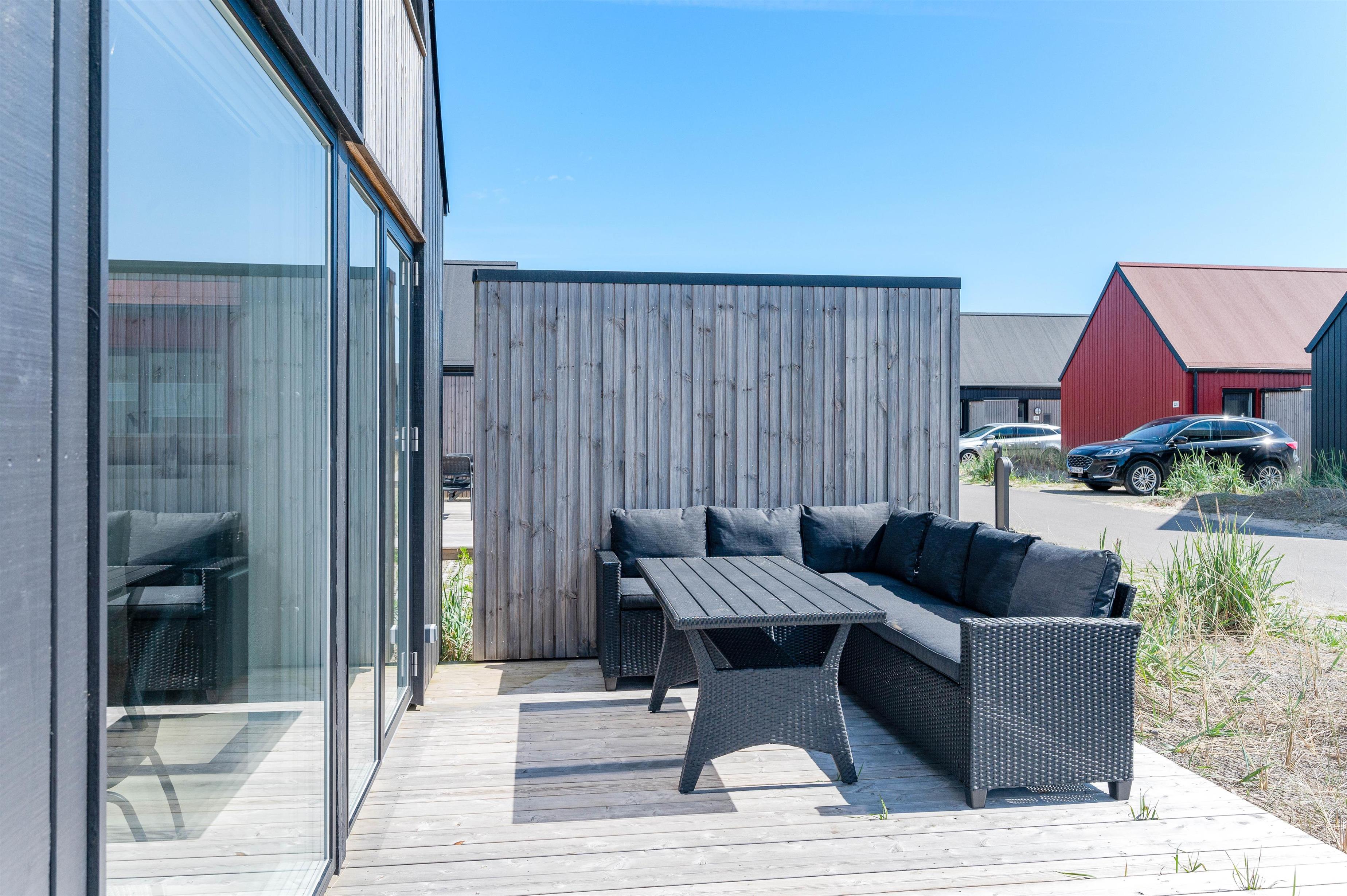Tilhørende sommerhuset er der en afskærmet og åben terrasse. Denne terrasse er oplagt til en hyggelig aften med et lækkert grillmåltid. Desuden er der havemøbler klar til jer, så I altid kan finde et komfortabelt sted at nyde vejret.