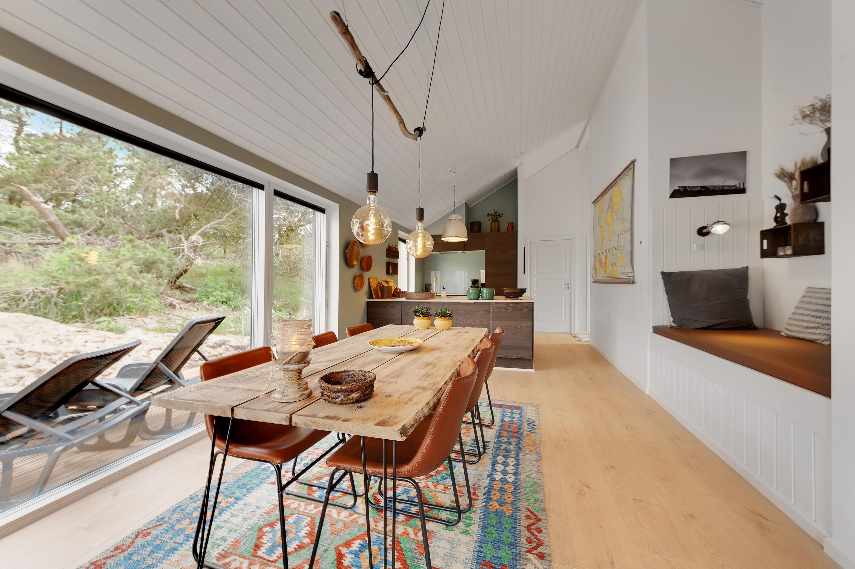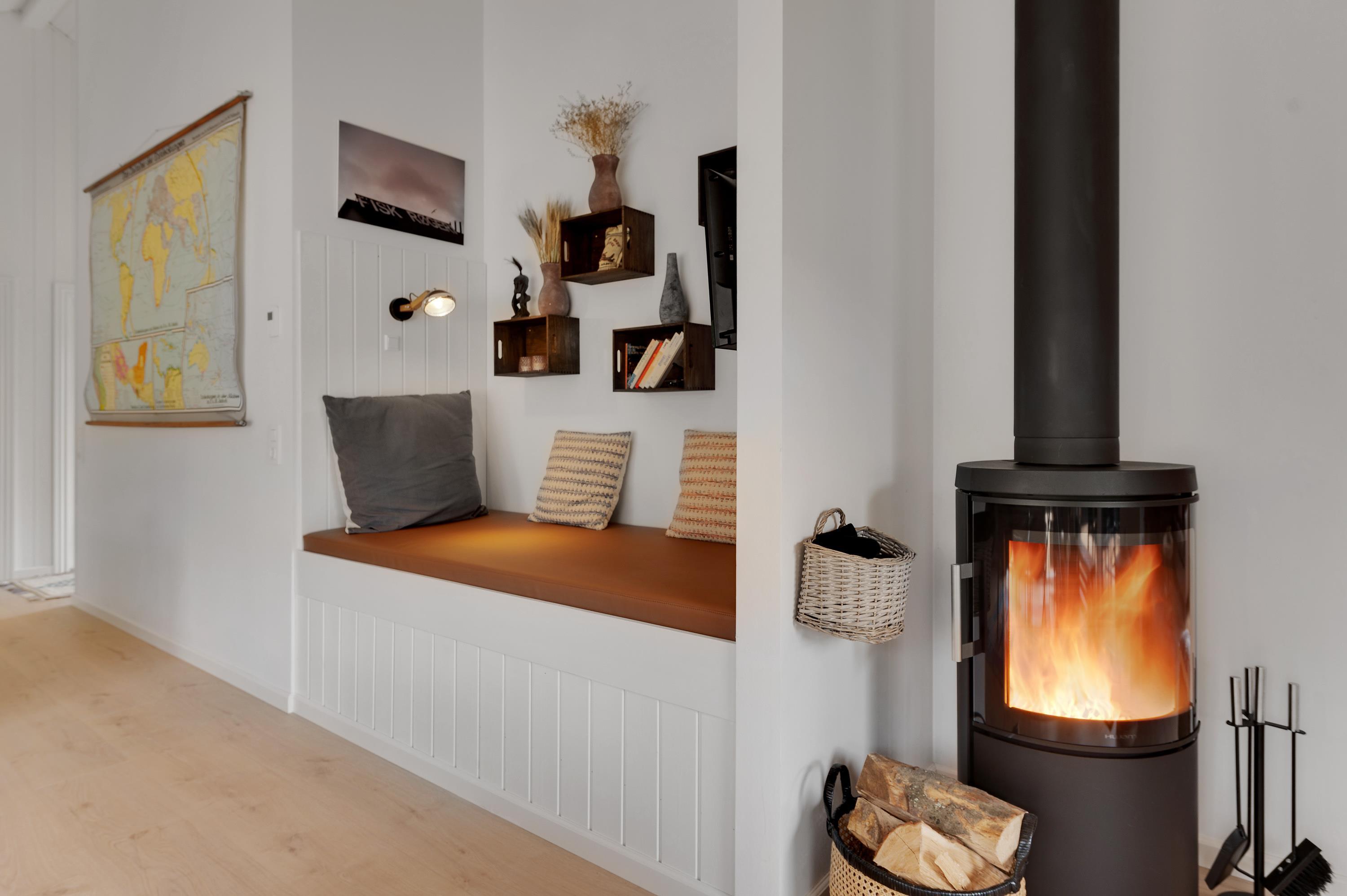 De store vinduespartier bringer naturen og solen helt ind i huset. Nyd hinandens selskab, mens I dyster i diverse familiespil ved spisebordet eller råhygger i alkoven med en god bog imens ilden knitrer i brændeovnen. Perfekt hygge efter en lang dag ved stranden i naturen.