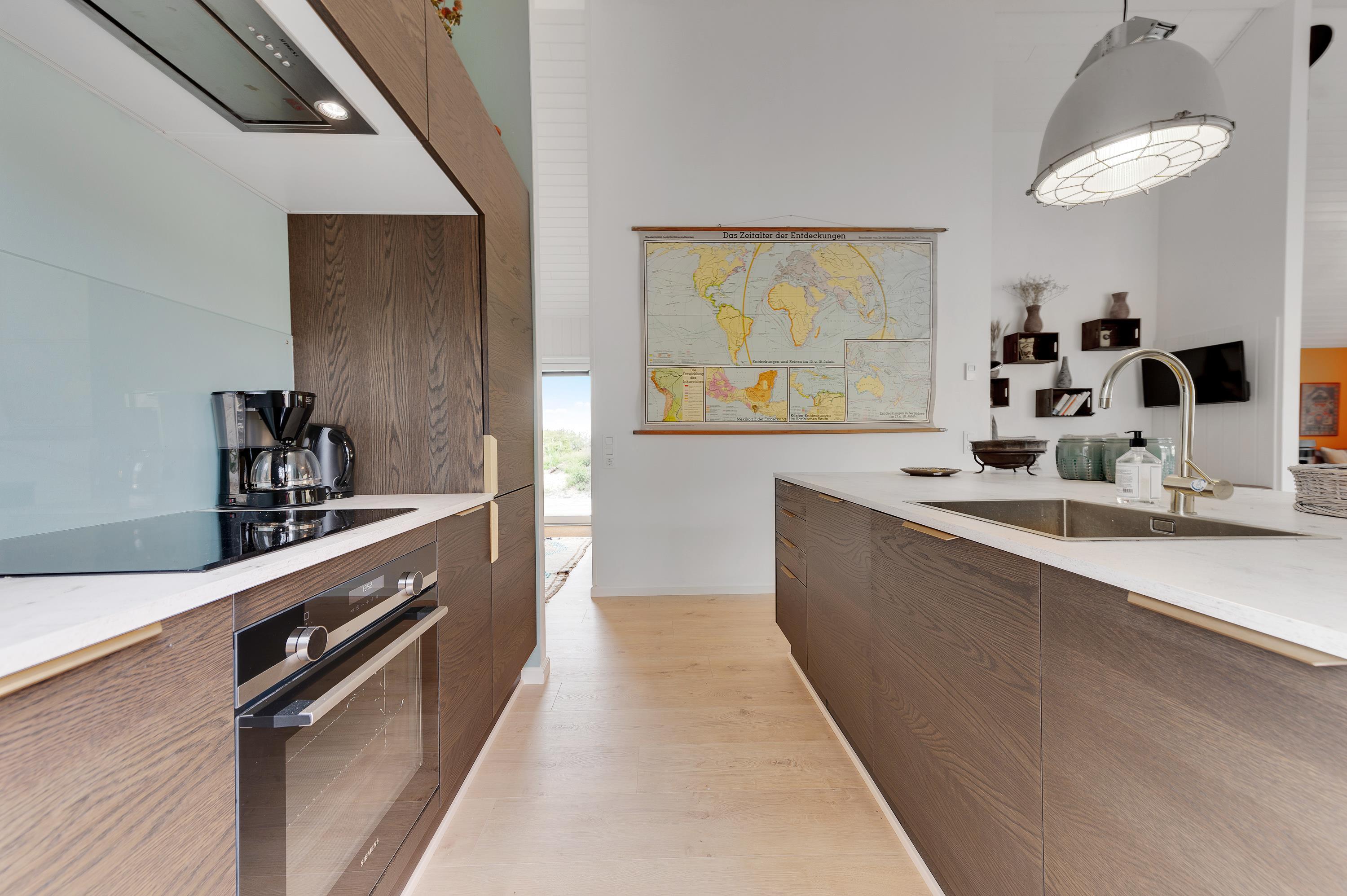 Overalt er der åbent op til kip, hvilket giver en dejlig fornemmelse af plads i det skønne sommerhus. Nyd fællesskabet i husets hjerte, det store opholdsrum med den flotte og veludrustede køkkenafdeling i den ene ende med en åben forbindelse til den hyggelige stueafdeling.