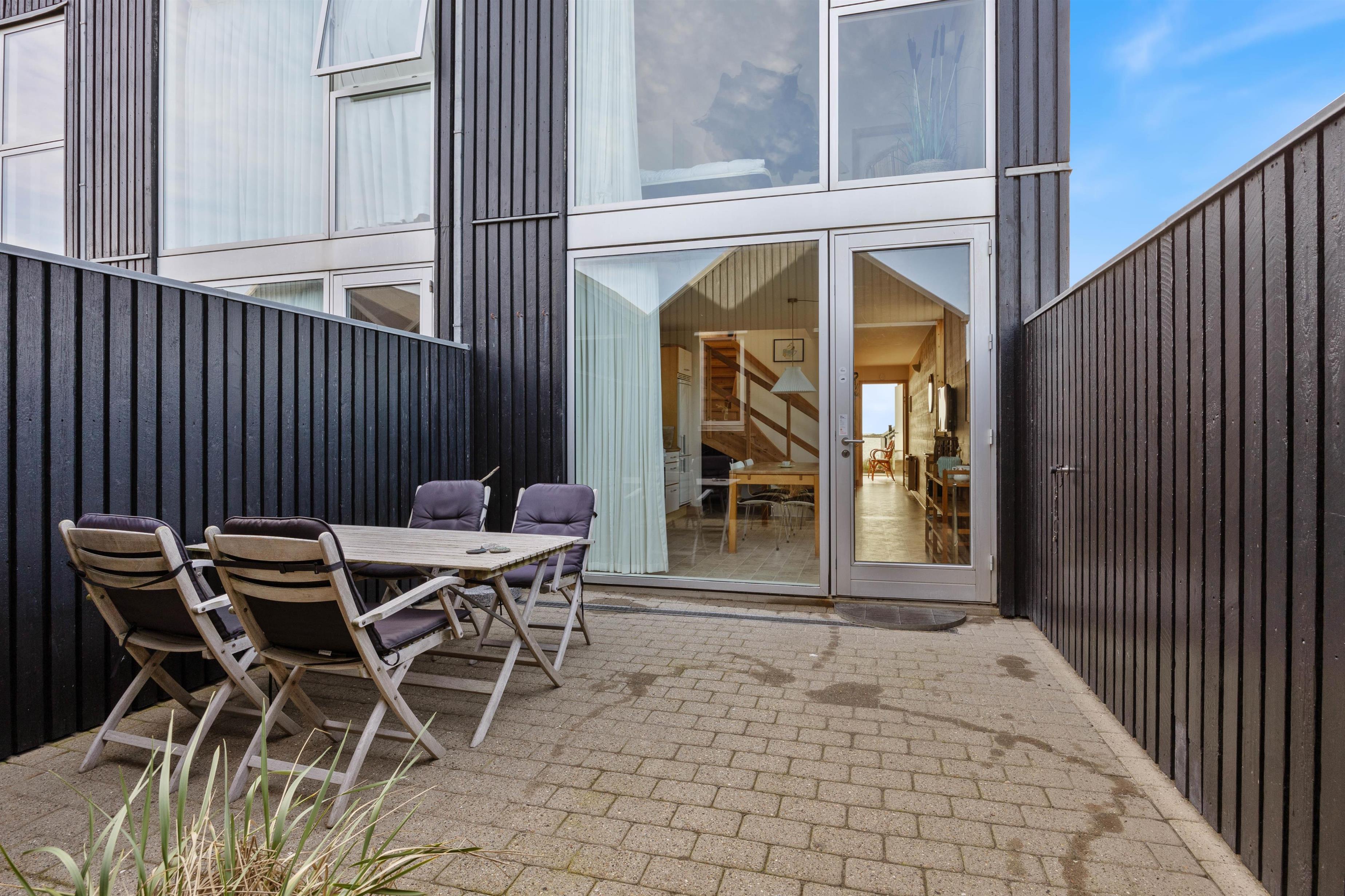 På den anden side af ferielejligheden mellem den tilhørende garage og redskabsrum, har I en dejlig lukket terrasse, hvor du kan nyde de hyggelige grillaftener. Her kan I tilberede de lækreste måltider og nyde dem med en god vin – måske I selv har fanget fiskene på molen, der ikke ligger langt fra derfra?