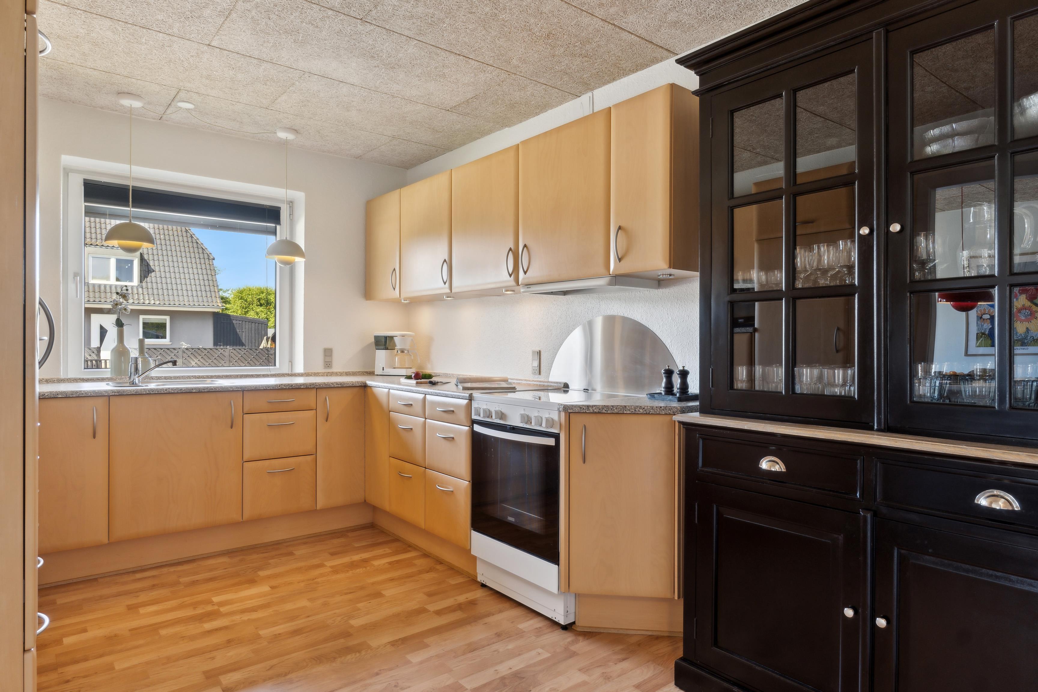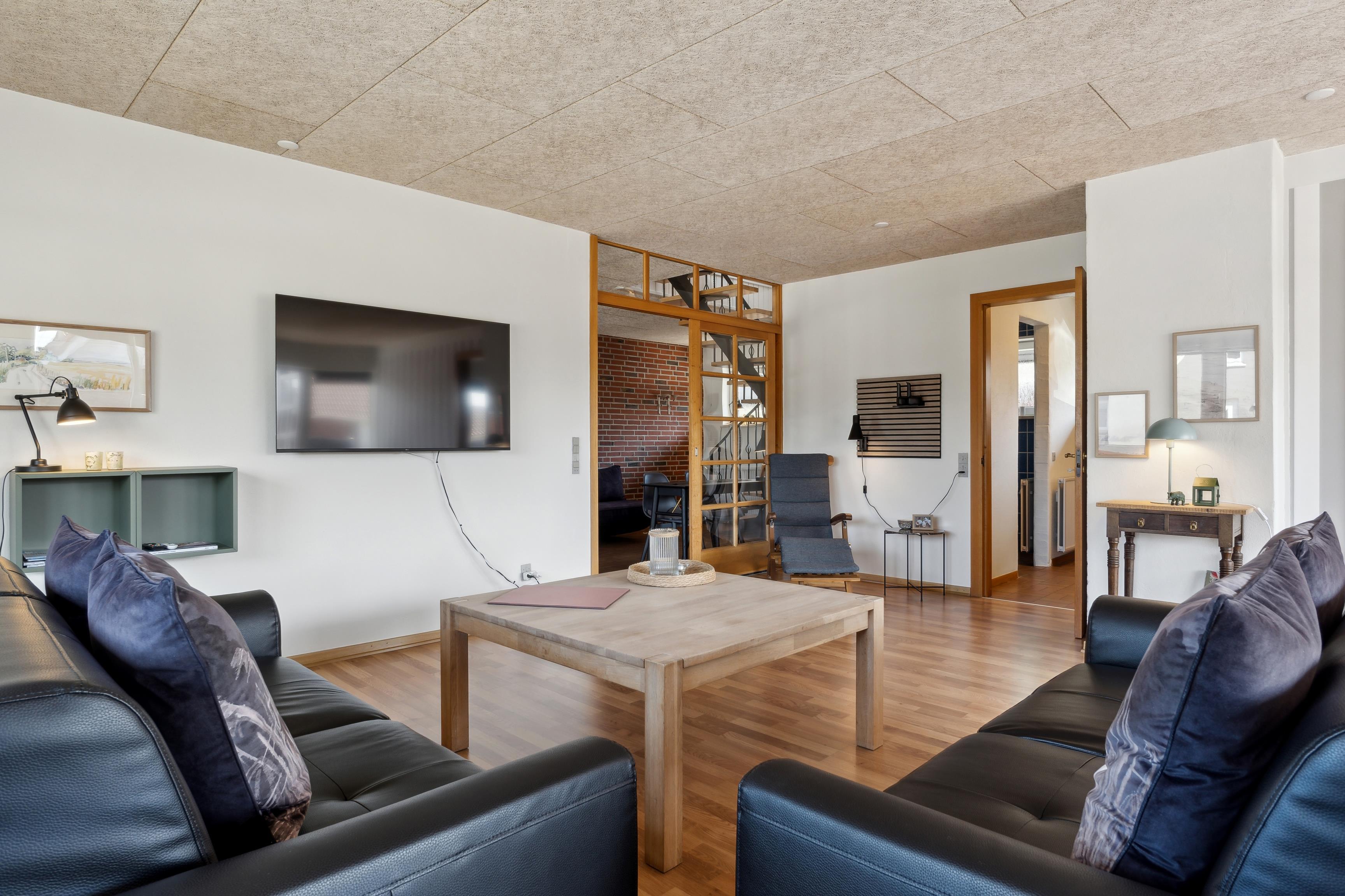 I den lyse og rummelige vinkelstue er der plads til både afslapning og fællesskab. Her kan I nyde måltiderne sammen, se Film, spille spil eller bare slappe af. I åben forbindelse ligger alrum og køkken, som er fuldt udstyret med alt, hvad I har brug for – inkl. opvaskemaskine, ovn, mikroovn og stor fryser. Fra køkkenet er der adgang til et praktisk bryggers med vaskemaskine, tørretumbler.