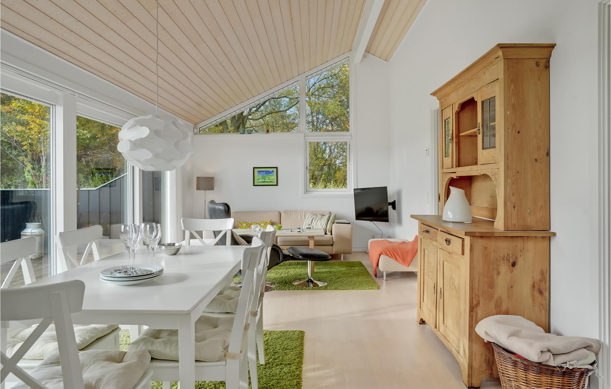 Huset er åbent og venligt indrettet med store vinduespartier, som inviterer lyset og de grønne rammer indenfor. Farveskalaen er rolig og matcher omgivelserne, så her får I hurtigt følelsen af at være landet et naturskønt sted, hvor I kan sænke skuldrene og slappe af.