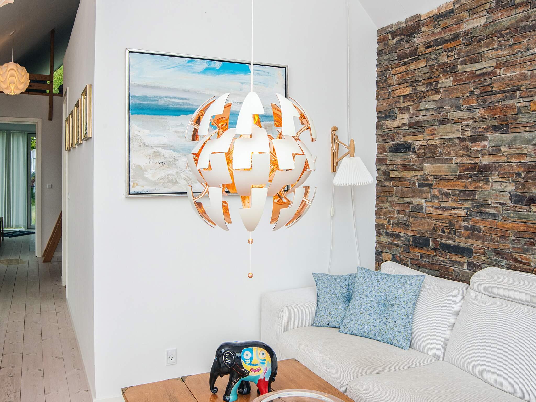 Feriehuset har en moderne indretning med masser af farver. I stueetagen finder du entré og gang, som er åbne til køkken-alrum. Køkkenet er veludstyret med blandt andet en 60-liters fryser. Herfra er der udsigt til vandet. I tilknytning til køkkenet er en spiseplads og en sovesofa til to personer. Der er et tv med Chromecast til streaming af dine egne tjenester. Fra køkkenet er der terrassedør med udgang til terrassen foran huset.