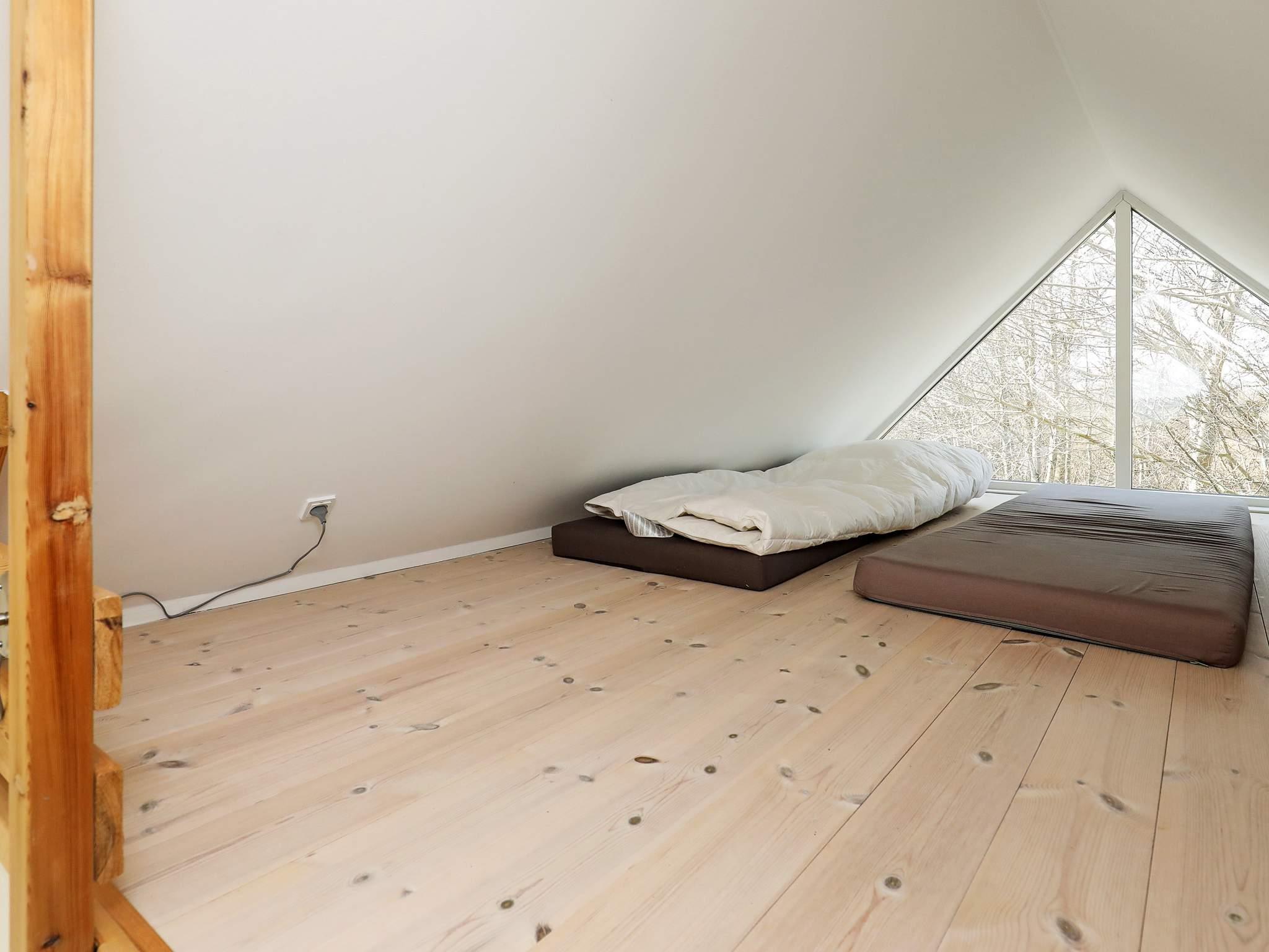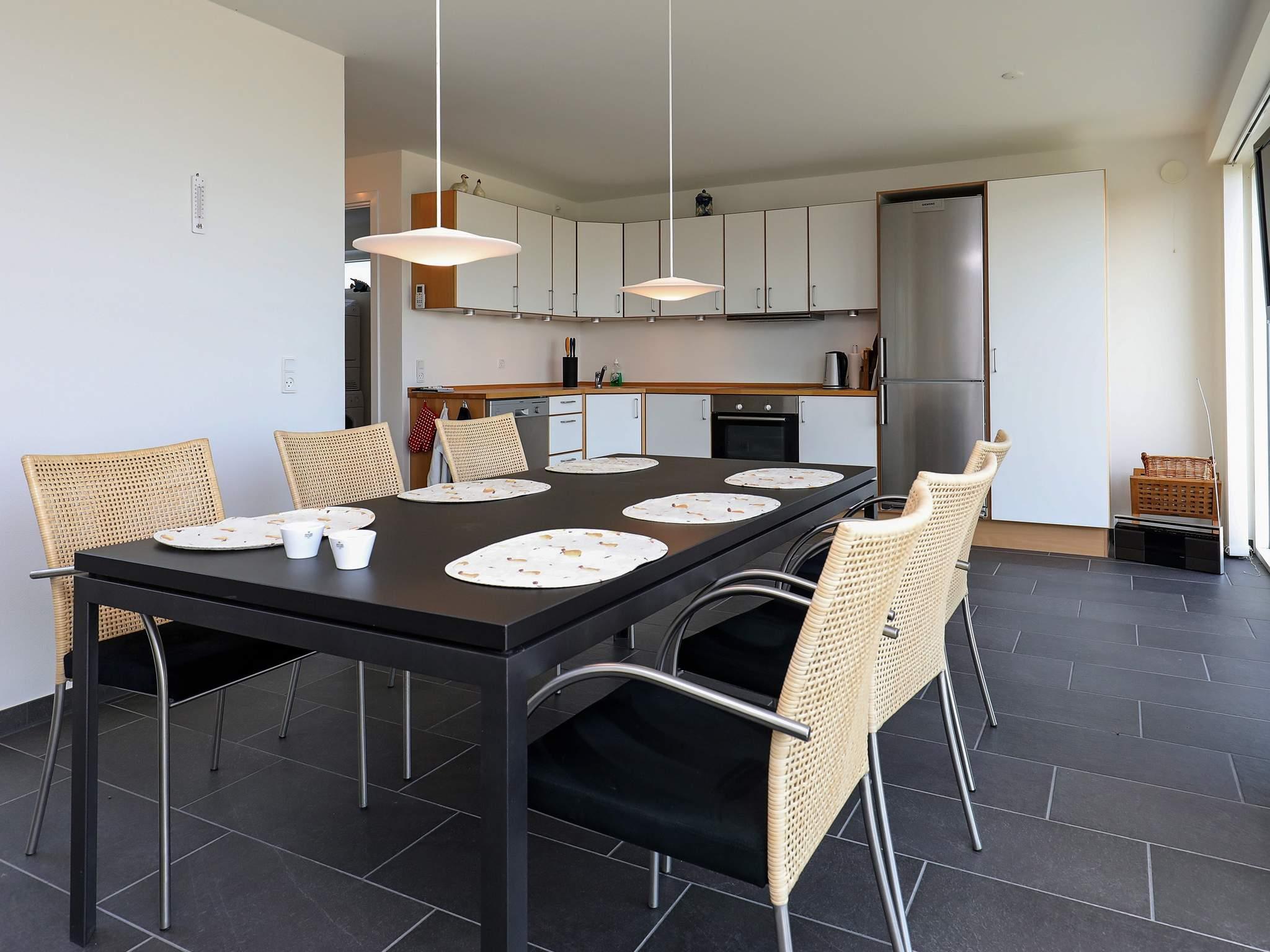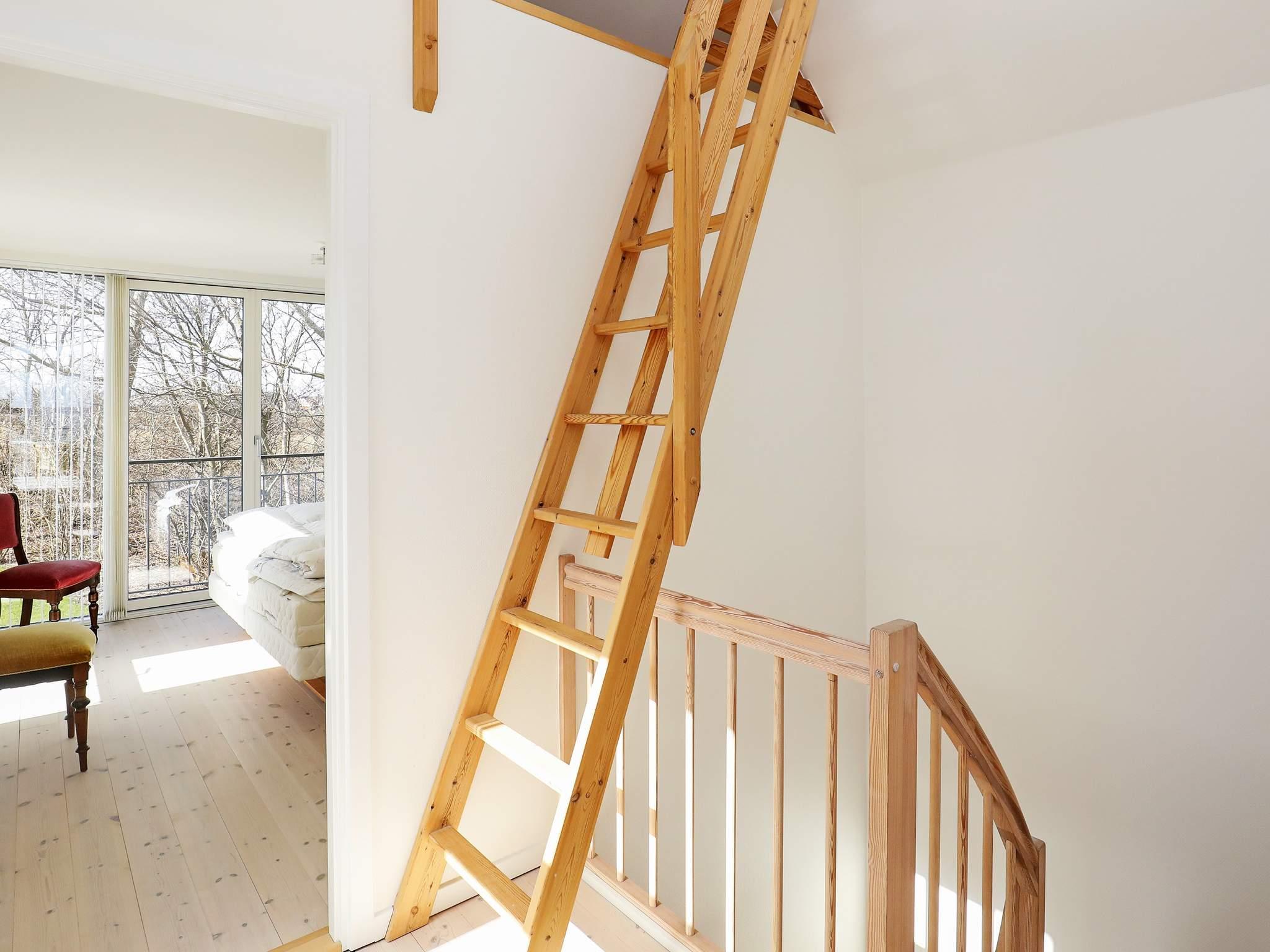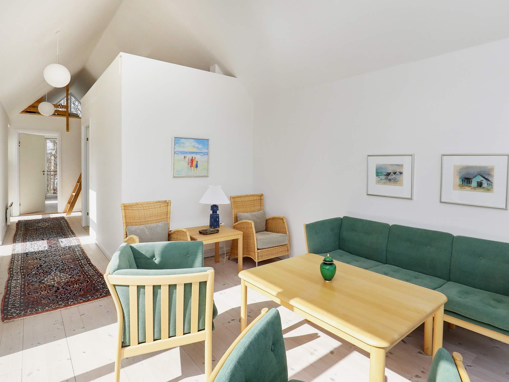 Opholdsstuen på 1. sal er udstyret med sofagruppe og lænestole. Herfra er adgang til dejlig stor tagterrasse. På 1. sal findes endnu et rummeligt soveværelse med dobbelt elevationsseng samt badeværelse med toilet, vask, brusekabine, vaskemaskine og tørretumbler. Husets to sidste sovepladser er madrasser på hemsen, hvortil der er adgang fra 1. sal.