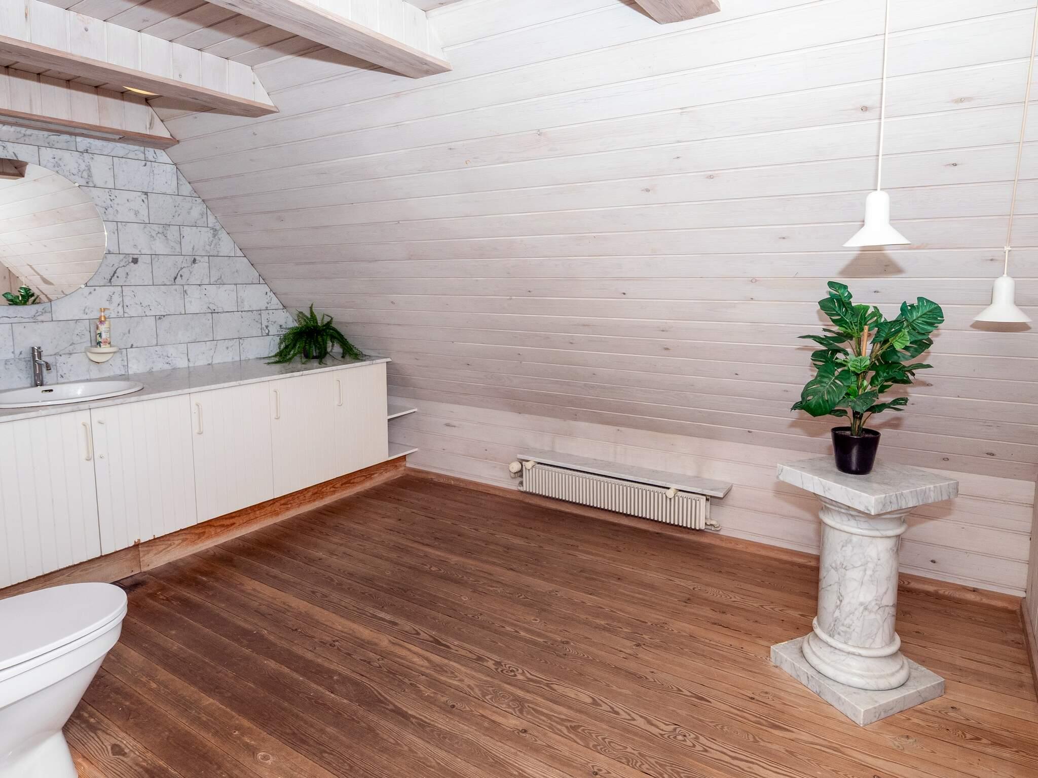 3 badeværelser: 1 med toilet, håndvask og bruseniche, hvor der er indgang til saunaen, og 1 med toilet, håndvask og badekar samt 1 gæstetoilet.