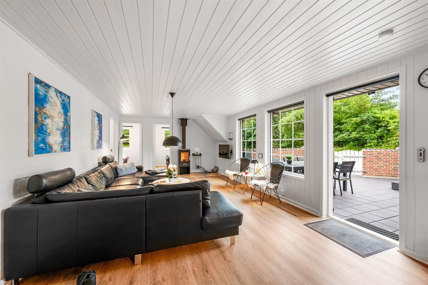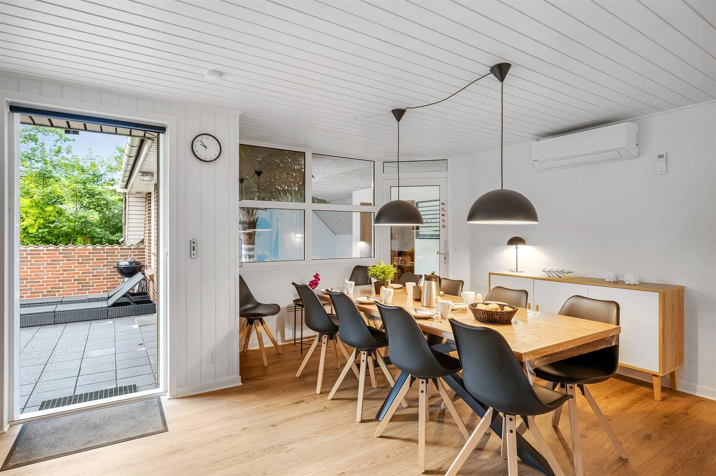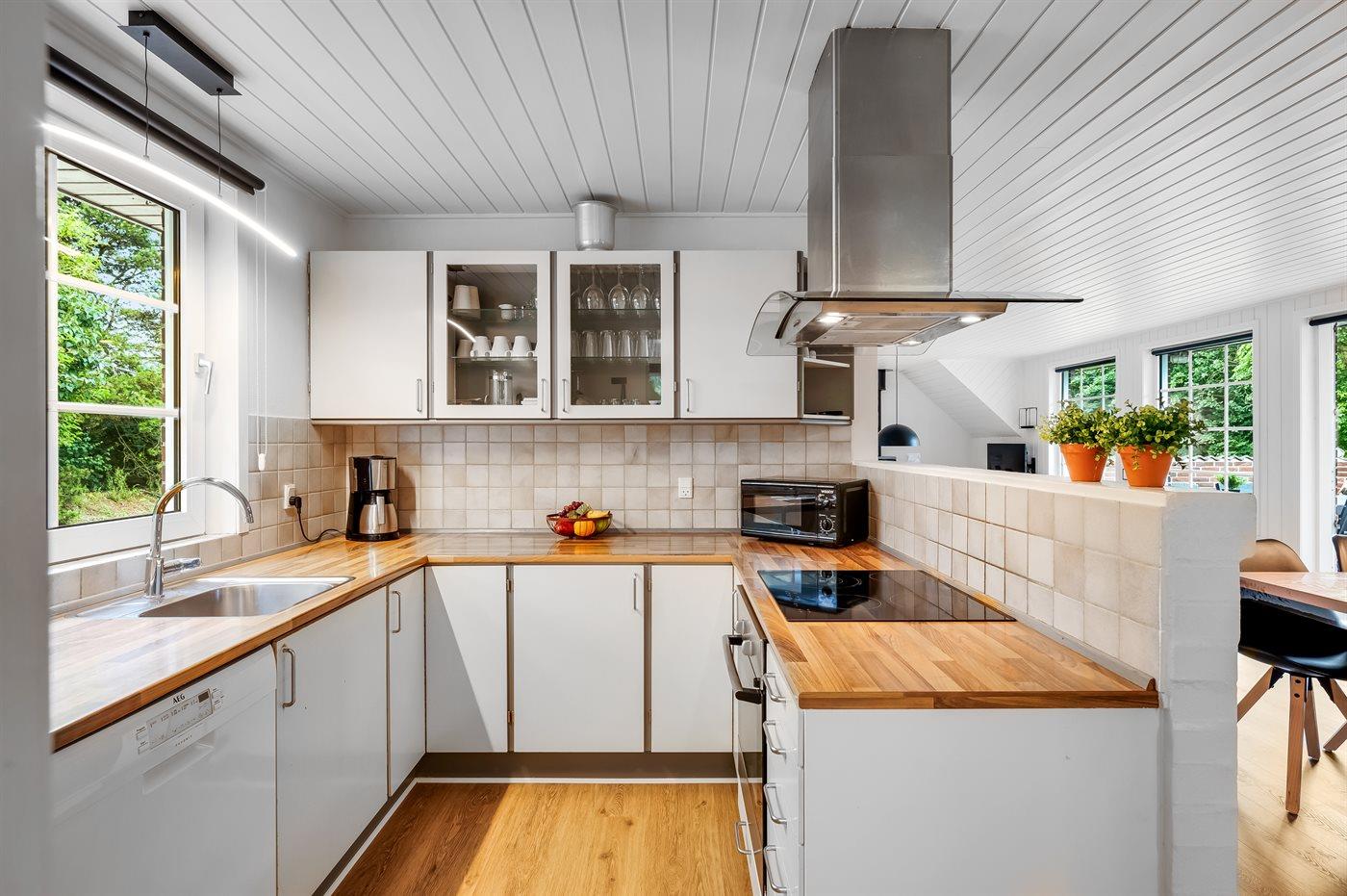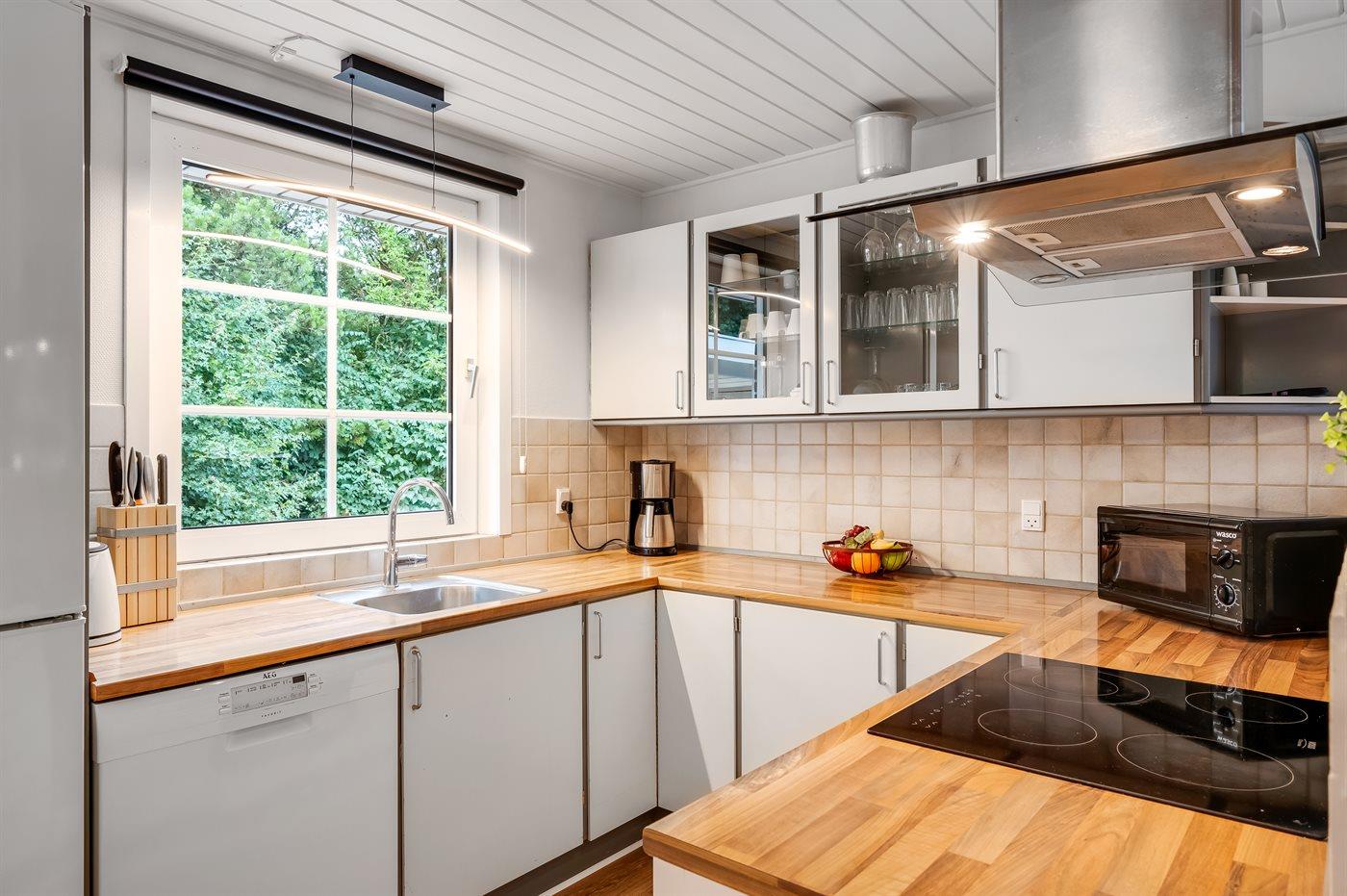 Der findes et stort, lukket og nyt terrasseareal med gode havemøbler, udendørs pejs og udendørs sauna. Veludstyret køkkenafdeling, som er kombineret med opholdsstuen. Der er køleskab, varmluftsovn og opvaskemaskine i rustfrit stål, frithængende emfang i stål/glas, fryser, mikrobølgeovn og induktionskogeplader.