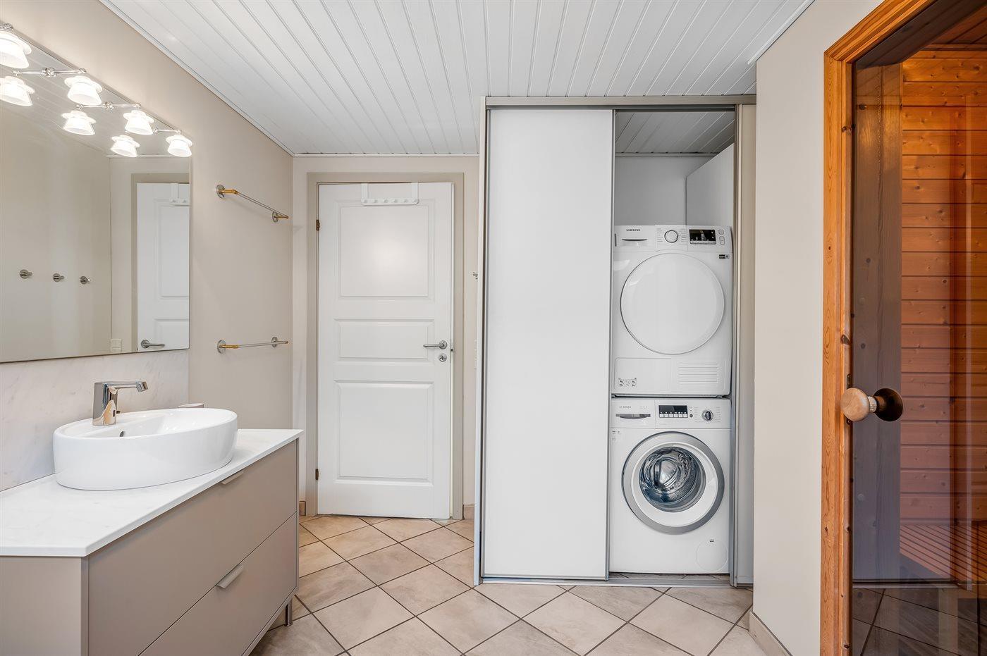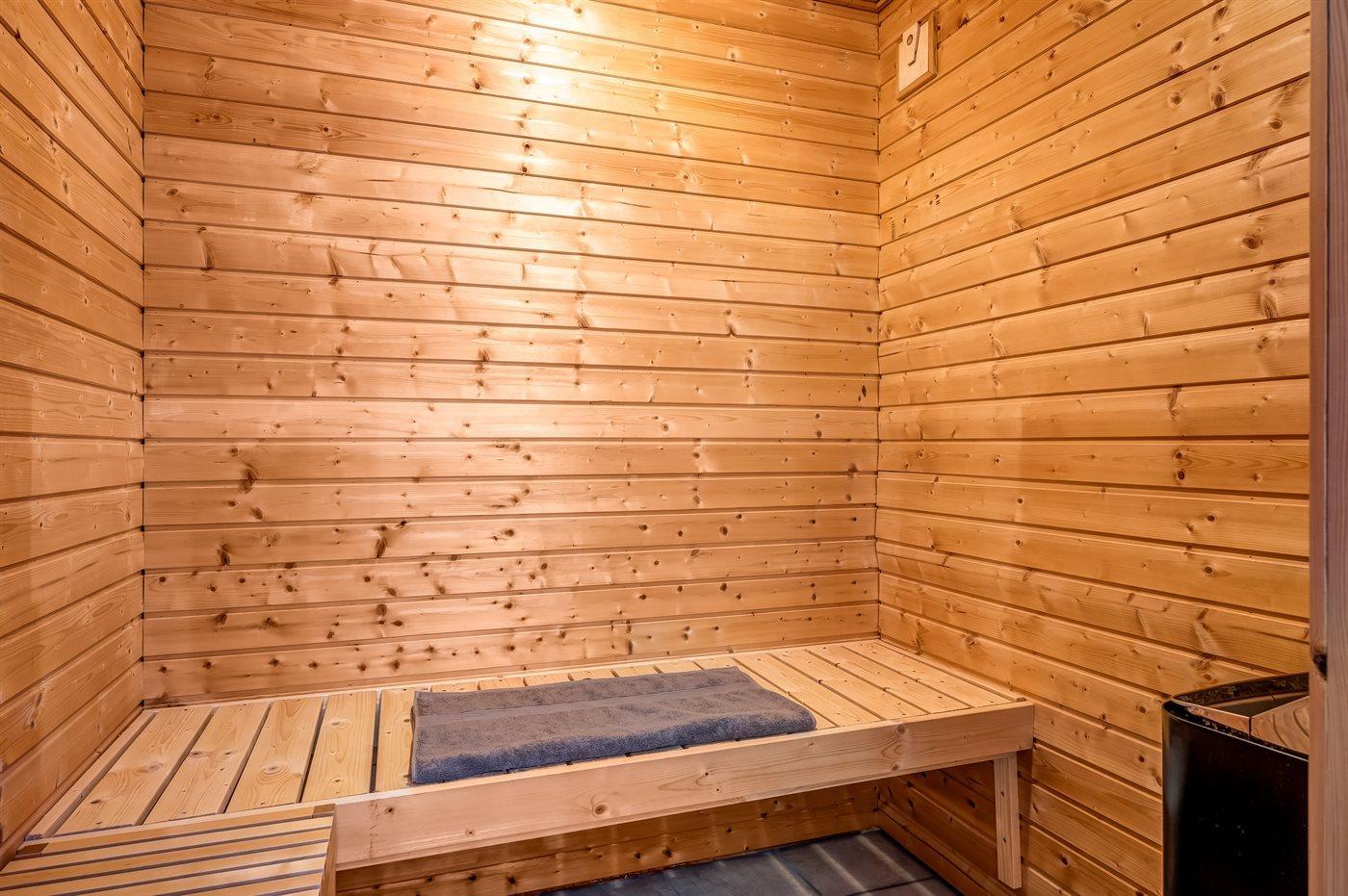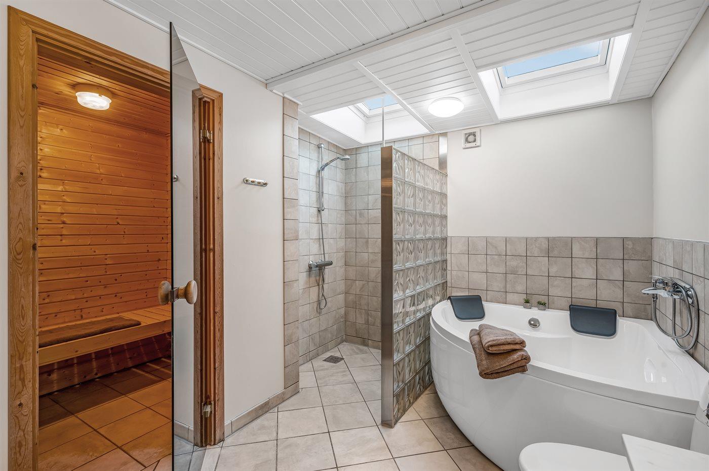 Der er 2 badeværelser med bruseniche og 2 toiletter. Der er gulvvarme på 2 badeværelser.. Badekar. I saunaen er der mulighed for afslapning.