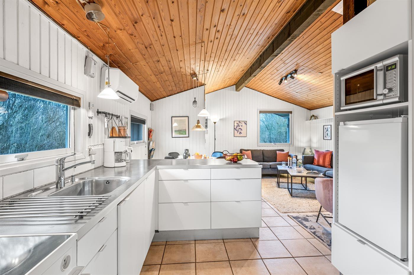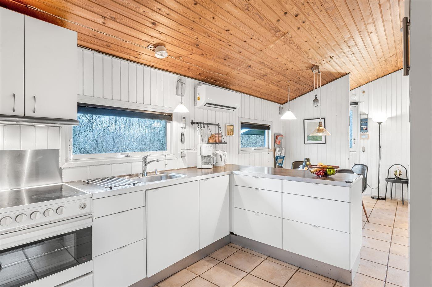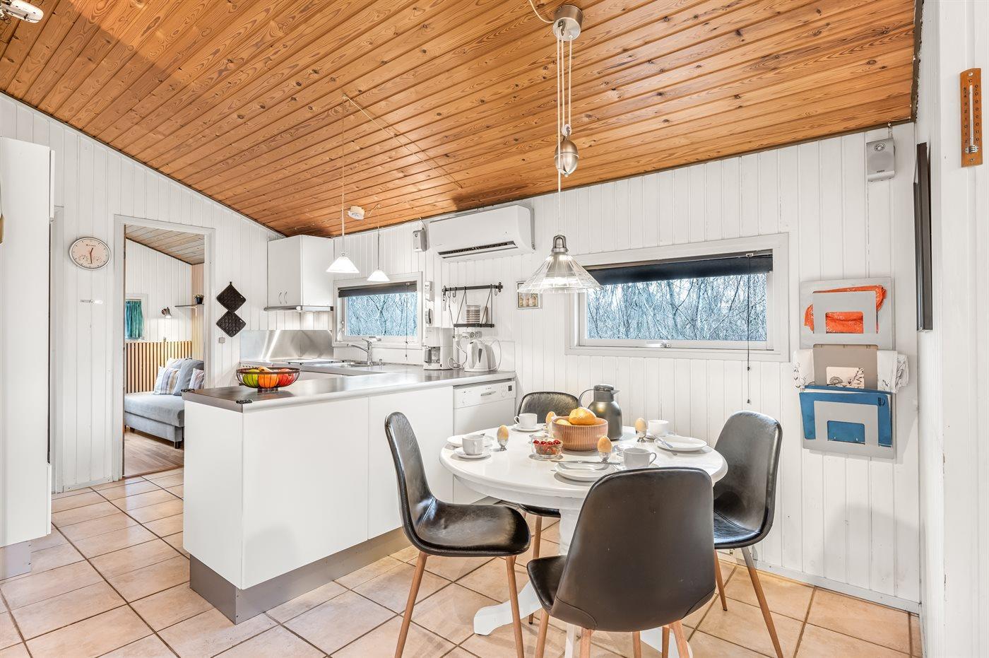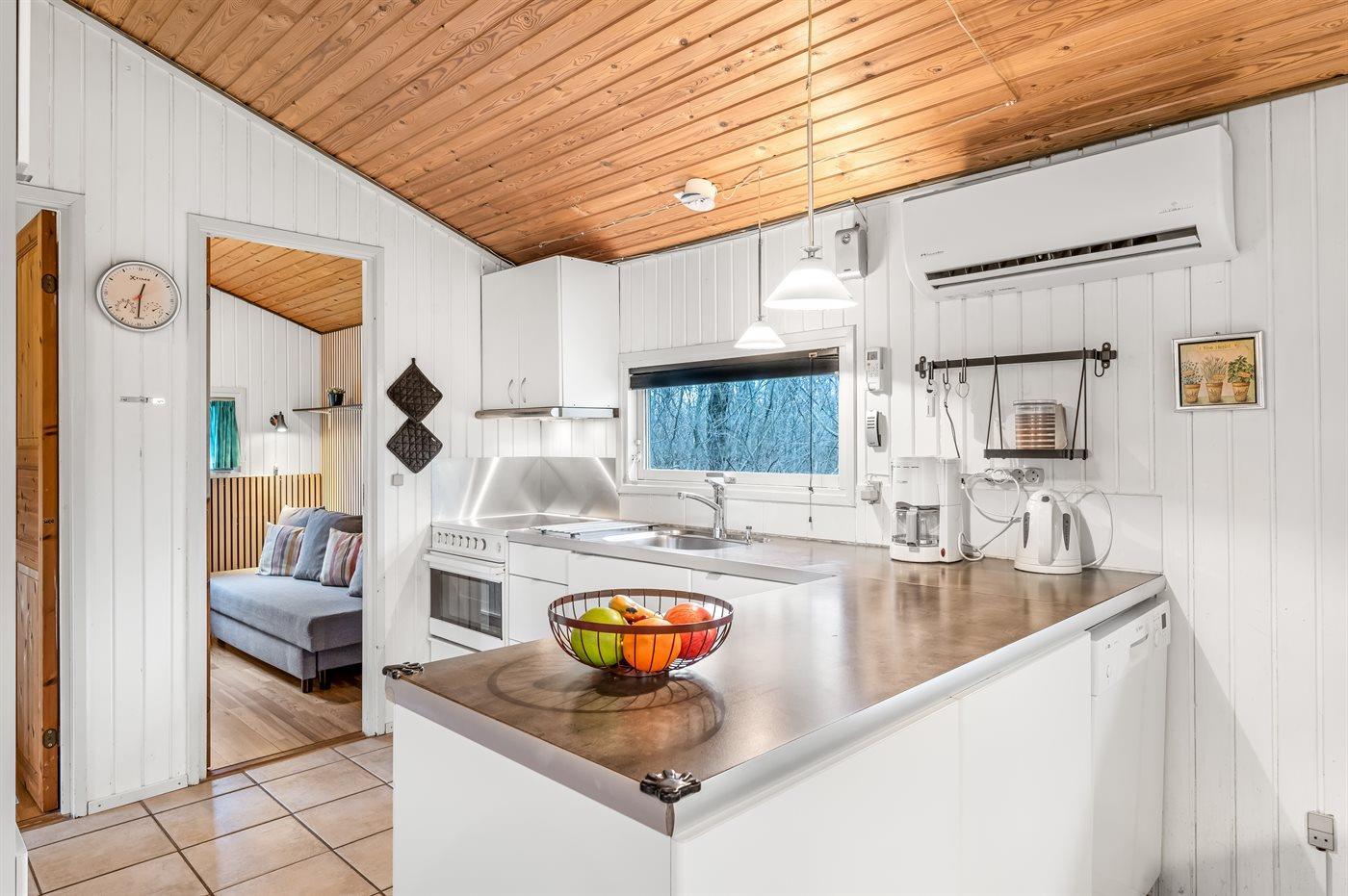 Køkkenet er udstyret med 1 køleskab. Der er 4 keramiske kogeplader, varmluftovn, mikrobølgeovn samt opvaskemaskine.