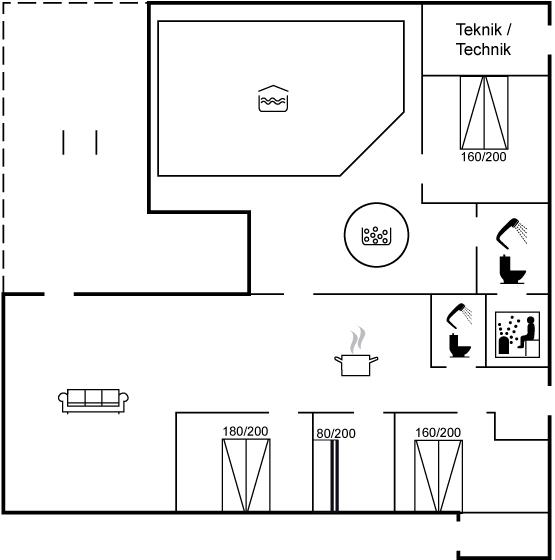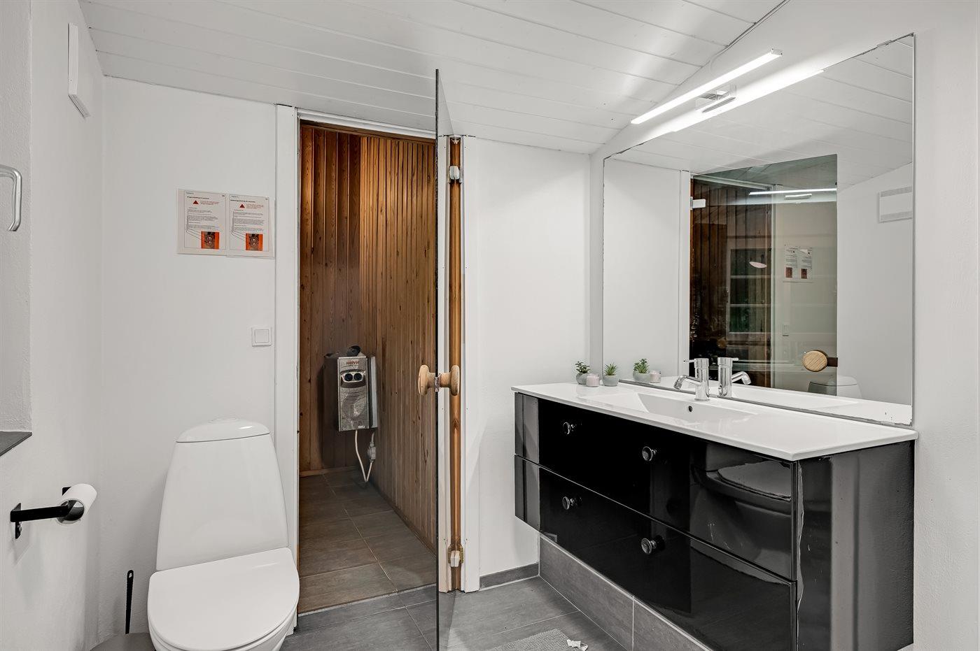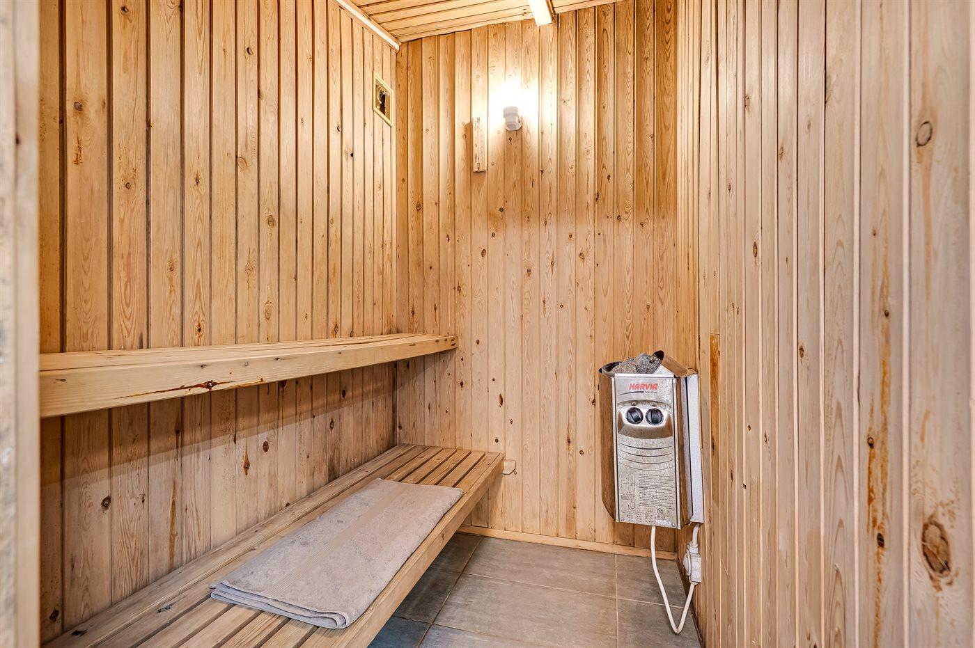 Der er 2 badeværelser med bruseniche og 2 toiletter. Der er gulvvarme på 2 badeværelser. I saunaen er der mulighed for afslapning.