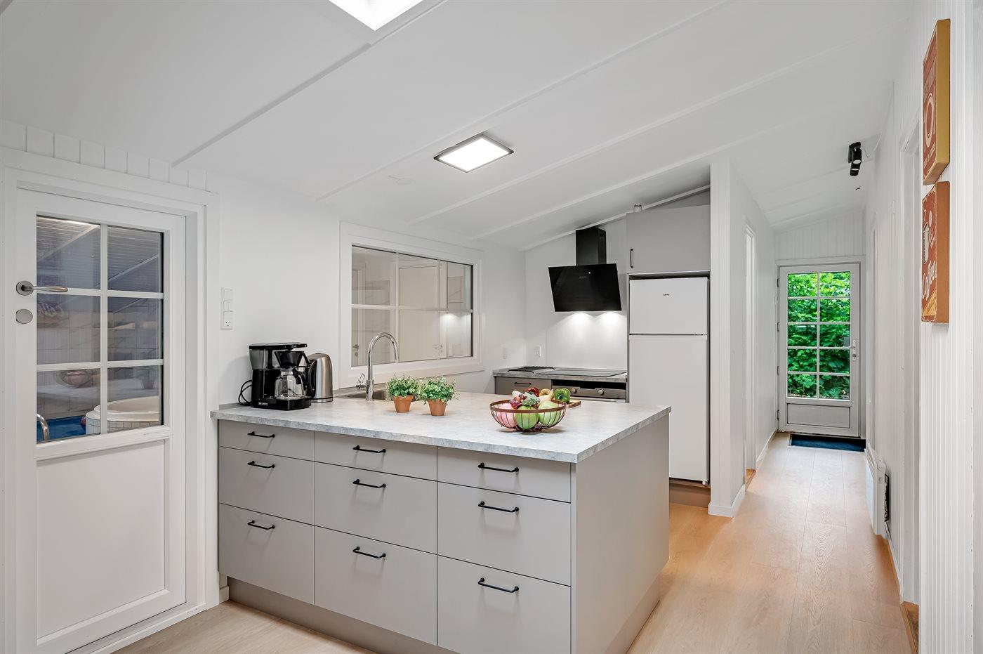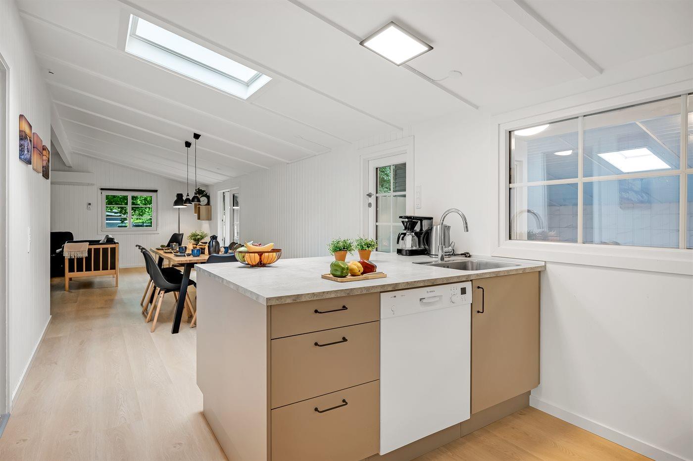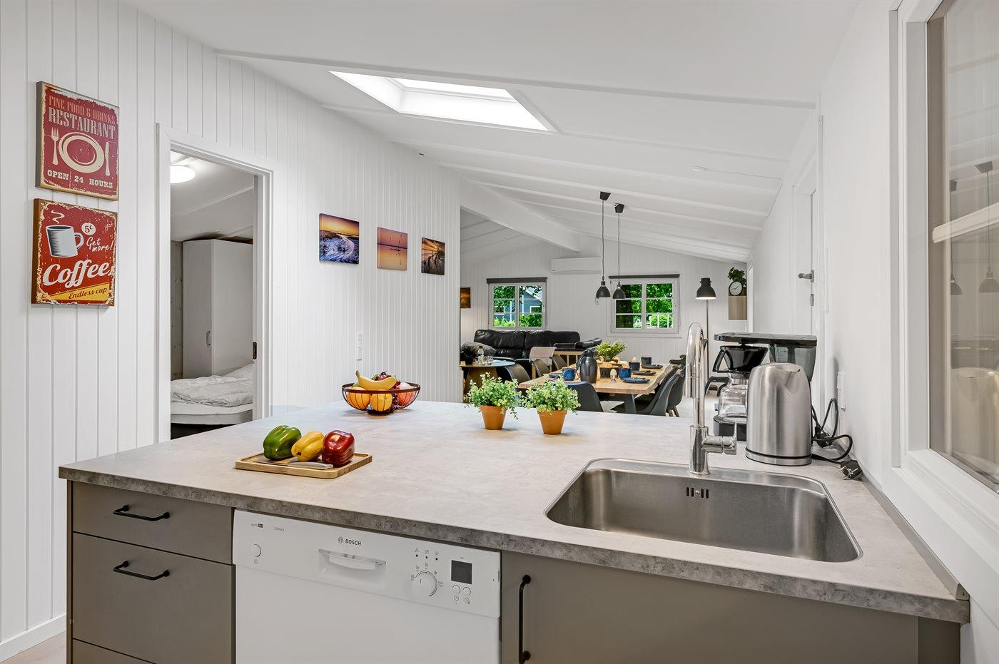 Køkkenet er udstyret med 1 køleskab. Der er 4 keramiske kogeplader, miniovn, varmluftovn samt opvaskemaskine.