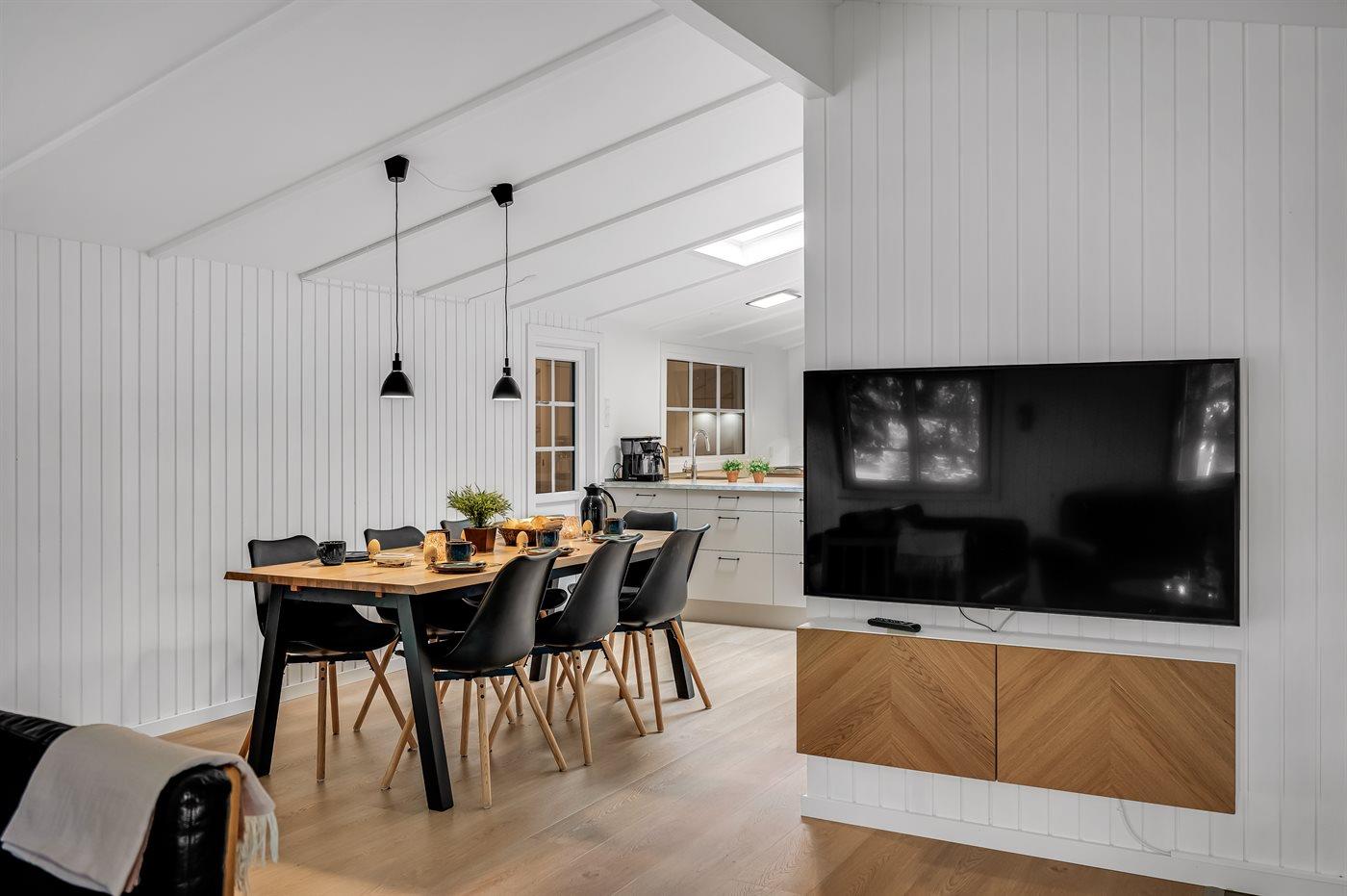 Huset er velindrettet med et lyst køkken, som er udstyret med alle de moderne bekvemmeligheder du har brug for, når der skal tilberedes lækre måltider. Køkkenet ligger i åben forbindelse med den hyggelige stue, som er smagfuldt indrettet med komfortable møbler og en brændeovn. Her har du også mulighed for at streame dine egne kanaler.