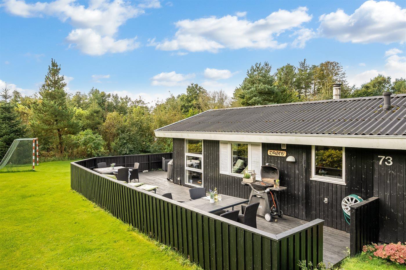 Her oser det af feriestemning både inde og ude med terrasser rundt om huset, shelter, trampolin, sansegynge osv.
