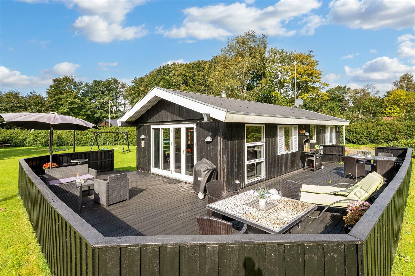 Hyggeligt sommerhus i rolige omgivelser med terrasser, shelter, trampolin og internet, tæt på legeplads og natur.