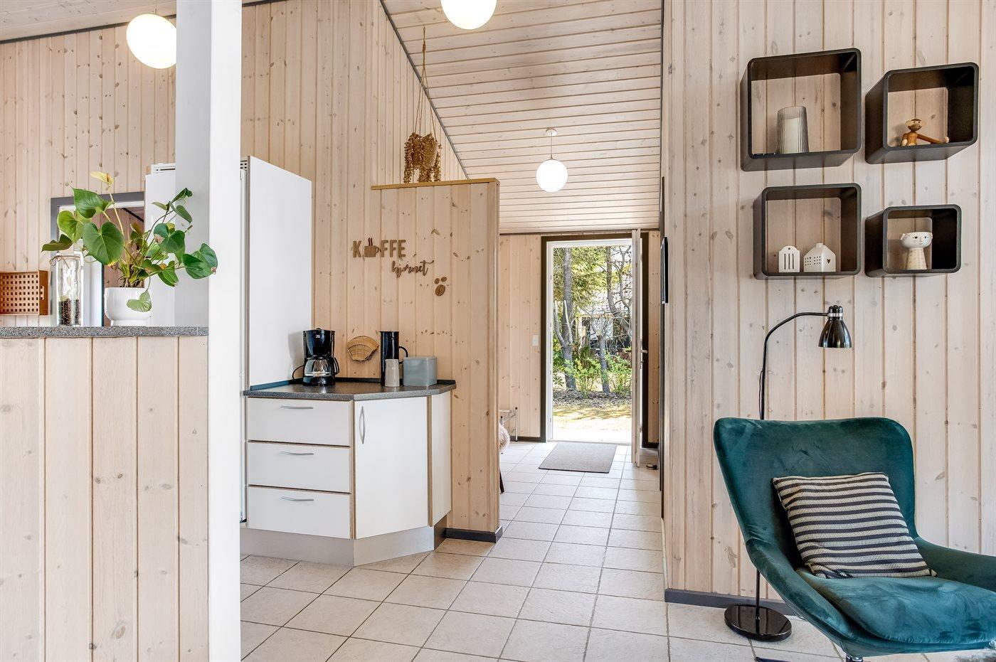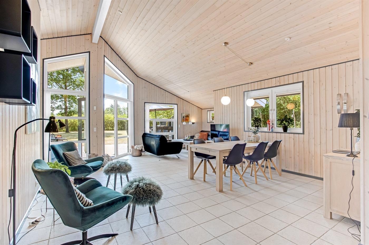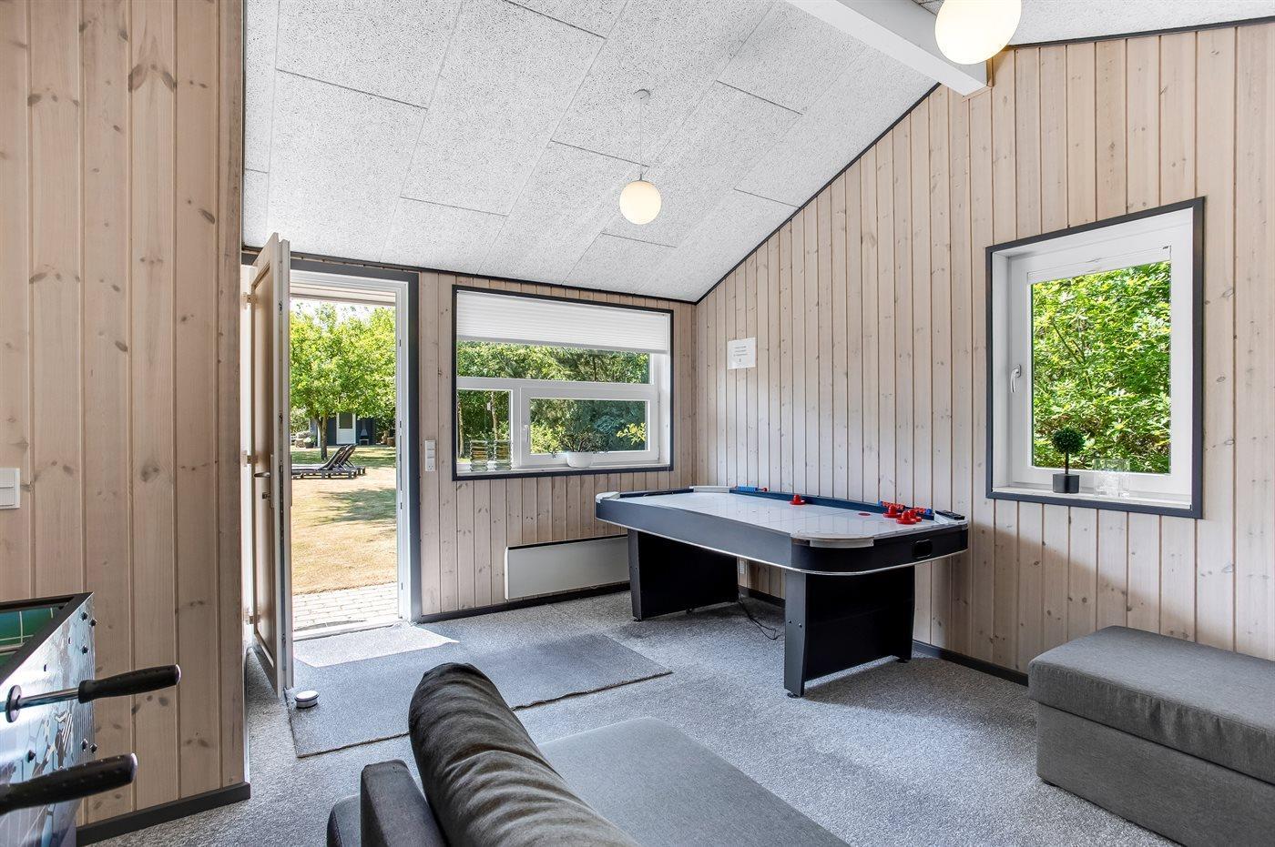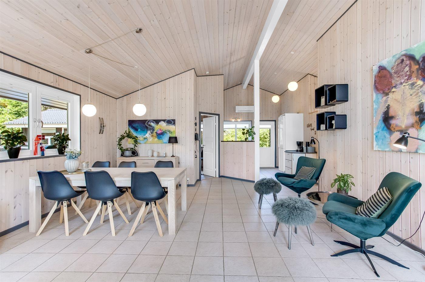 Rummeligt sommerhus beliggende på en ugenert naturgrund med græsplæne. Der er gulvvarme i hele huset, og gulvene er dels belagt med klinker, dels med træ. I en tilbygning til huset ligger et aktivitetsrum med egen indgang og tilhørende gæstetoilet. Her kan man spille airhockey, bordfodbold og dart.