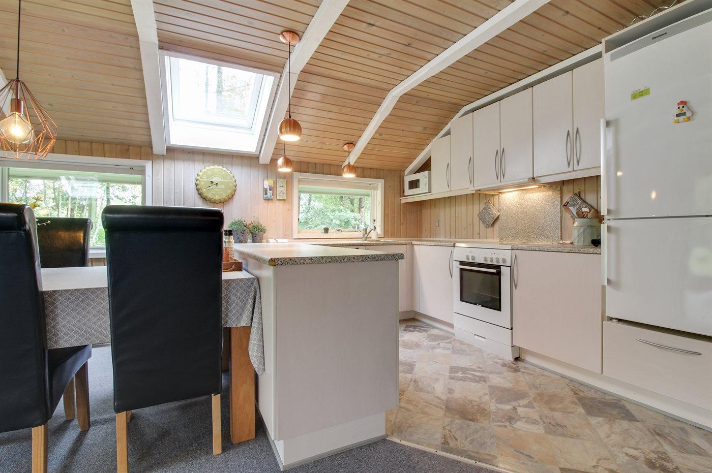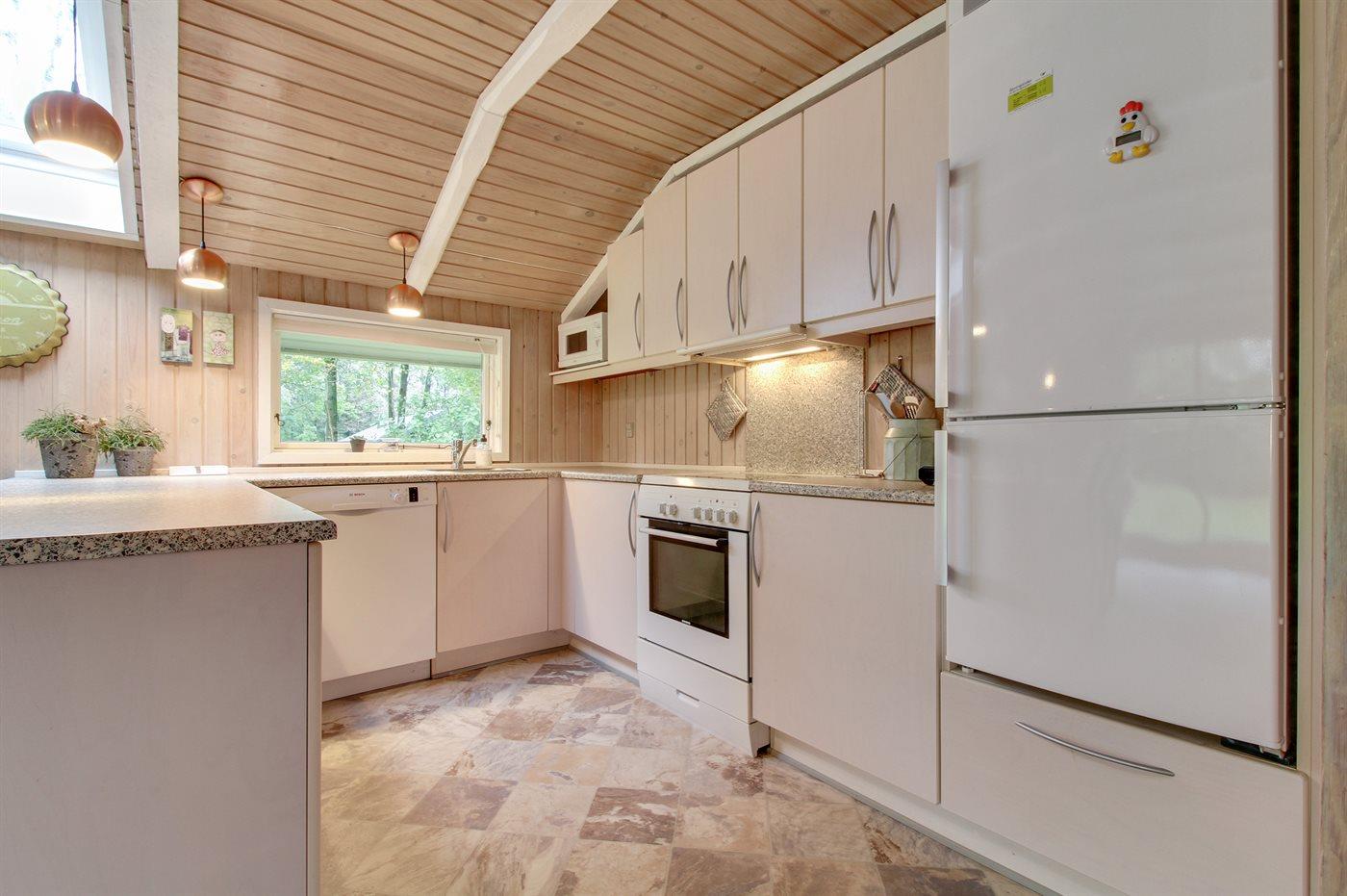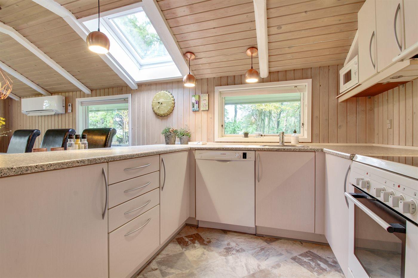 Køkkenet er udstyret med 1 køleskab. Der er 4 keramiske kogeplader, varmluftovn, mikrobølgeovn samt opvaskemaskine.