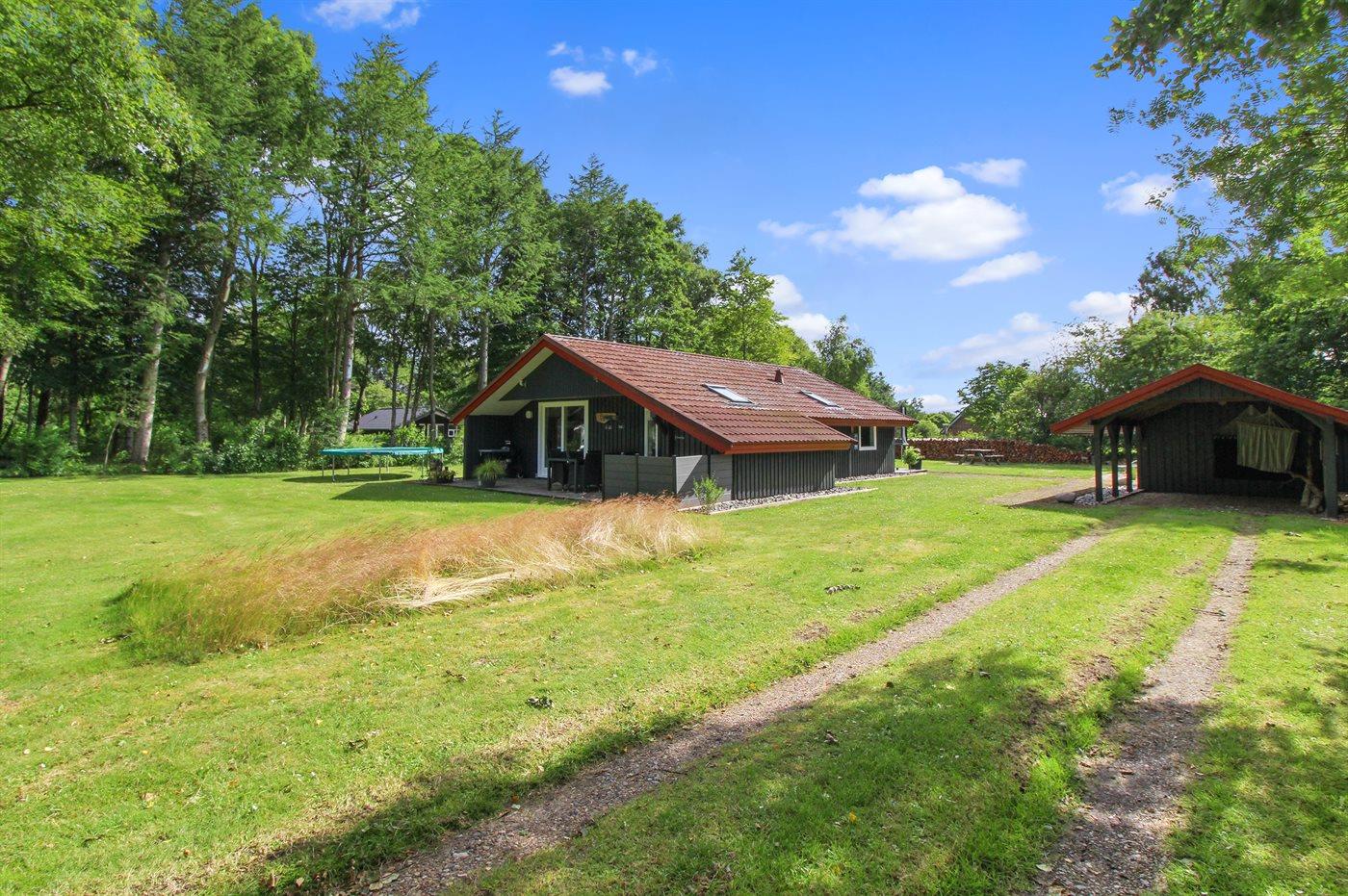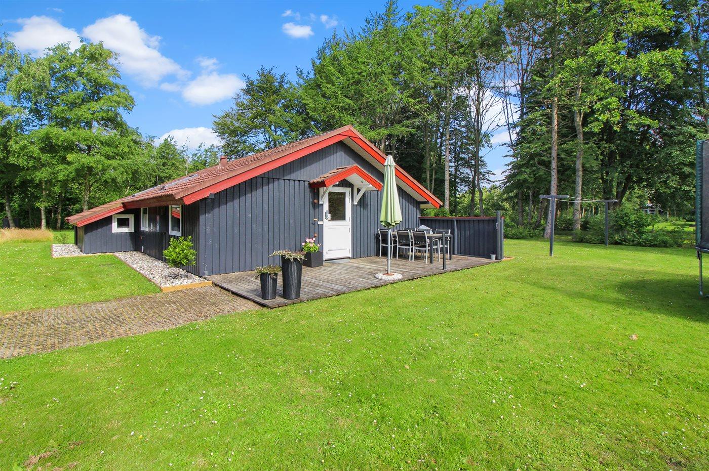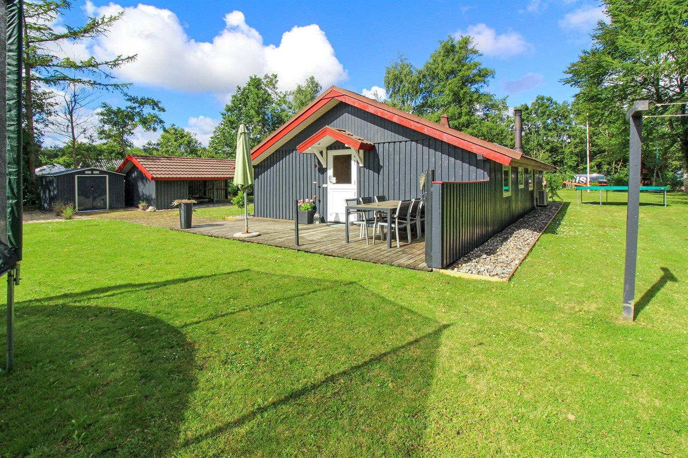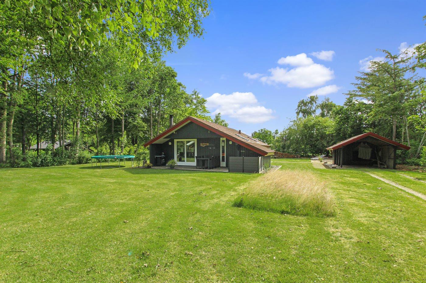 Ferieboligen er beliggende på en 1500 m² stor naturgrund. Der er 10000 m til havet. Nærmeste forretning er beliggende i en afstand af 500 m. Til ferieboligen hører 40 m² terrasseareal. Desuden er der 10 m² overdækket terrasse. Sandkasse. Trampolin. Bålsted. Shelter. Grill til rådighed. Der er carport til rådighed. Parkering ved ferieboligen.