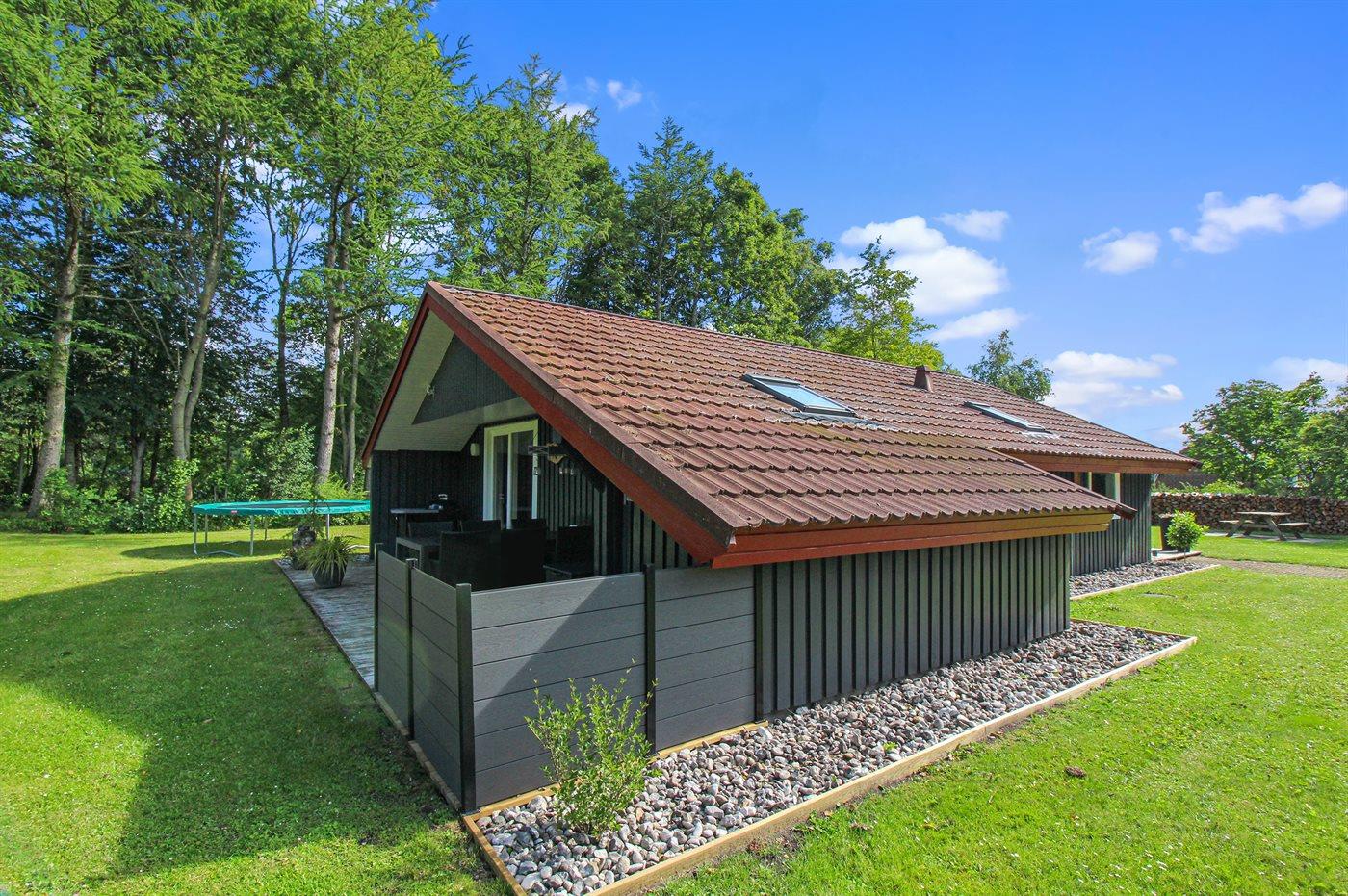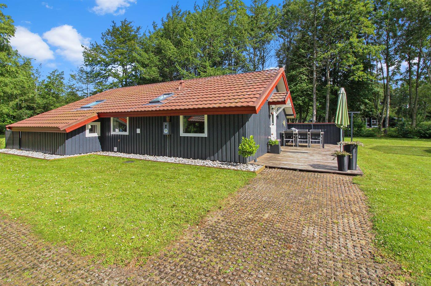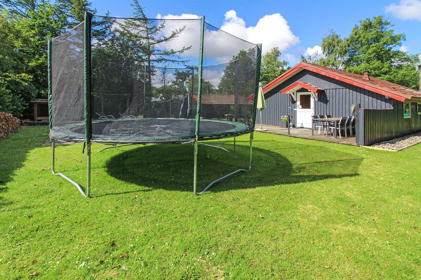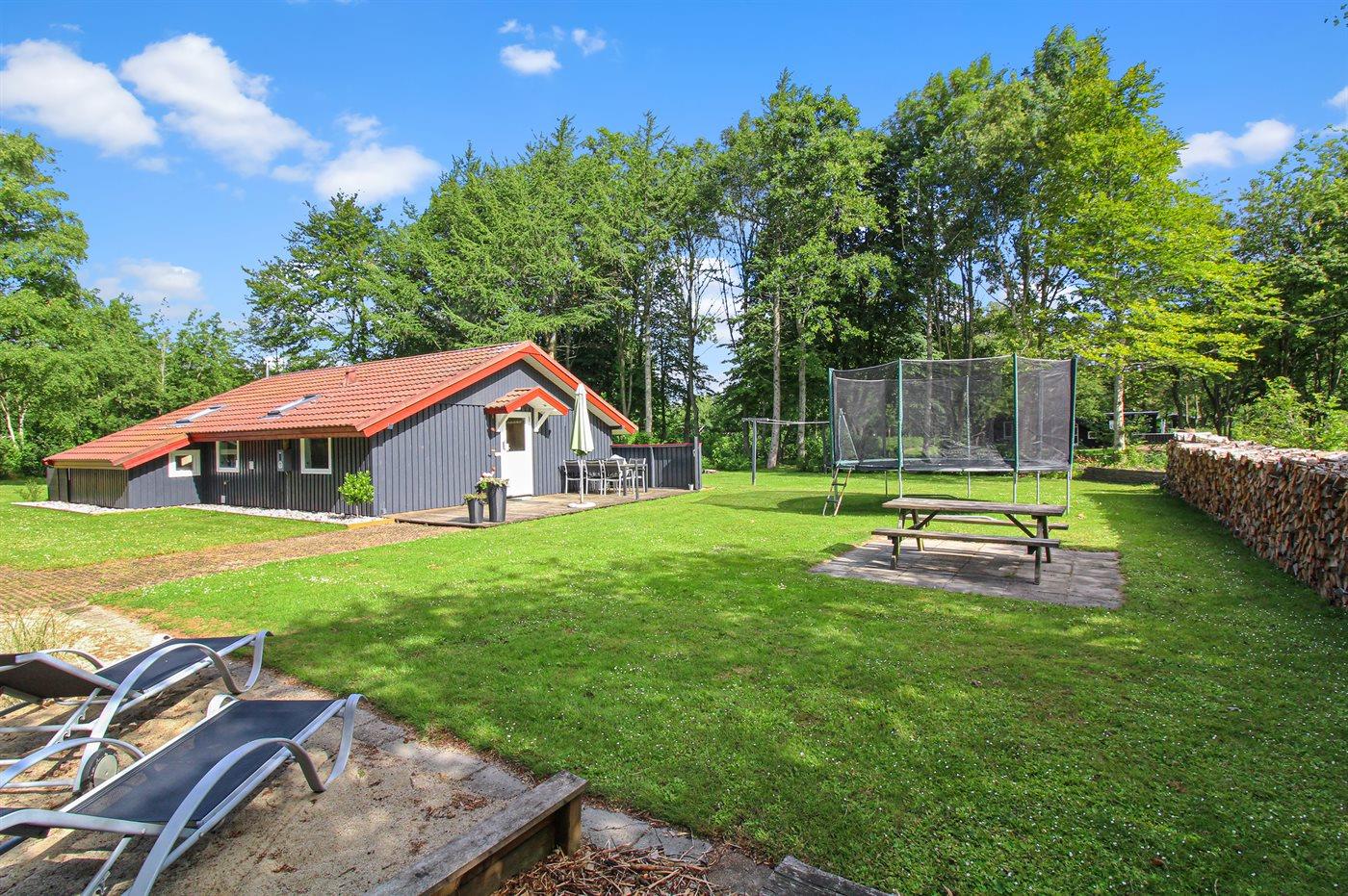 Ferieboligen er beliggende på en 1500 m² stor naturgrund. Der er 10000 m til havet. Nærmeste forretning er beliggende i en afstand af 500 m. Til ferieboligen hører 40 m² terrasseareal. Desuden er der 10 m² overdækket terrasse. Sandkasse. Trampolin. Bålsted. Shelter. Grill til rådighed. Der er carport til rådighed. Parkering ved ferieboligen.