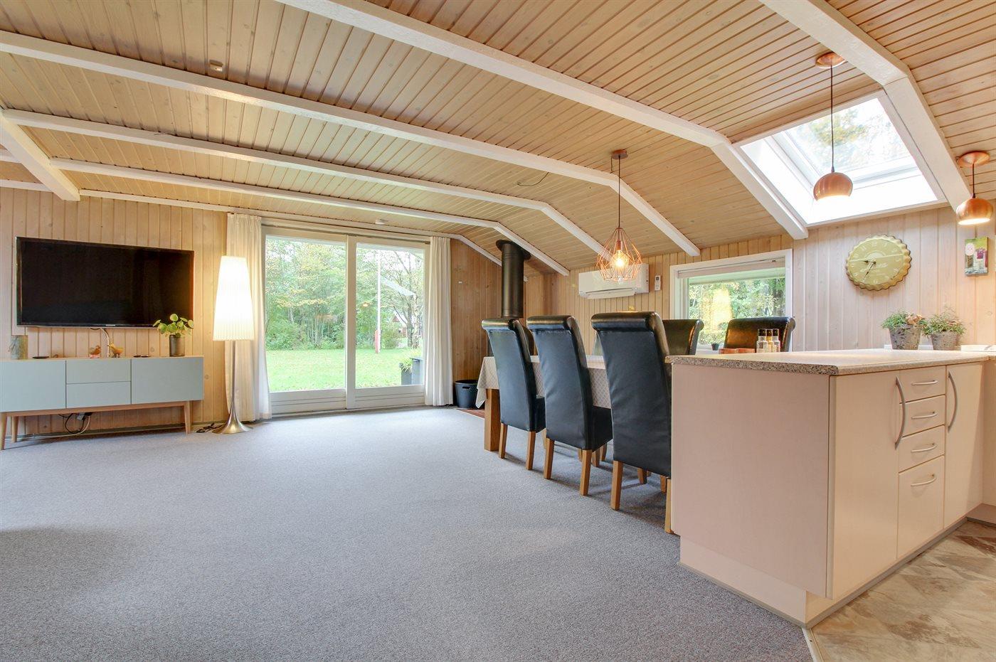 Dette pæne og lyst indrettede sommerhus ligger på en delvis lukket naturgrund med bålplads og shelter samt legeredskaber. Bemærk, at 2 af sovepladserne befinder sig i en alkove i opholdsstuen. Bemærk ingen husdyr.