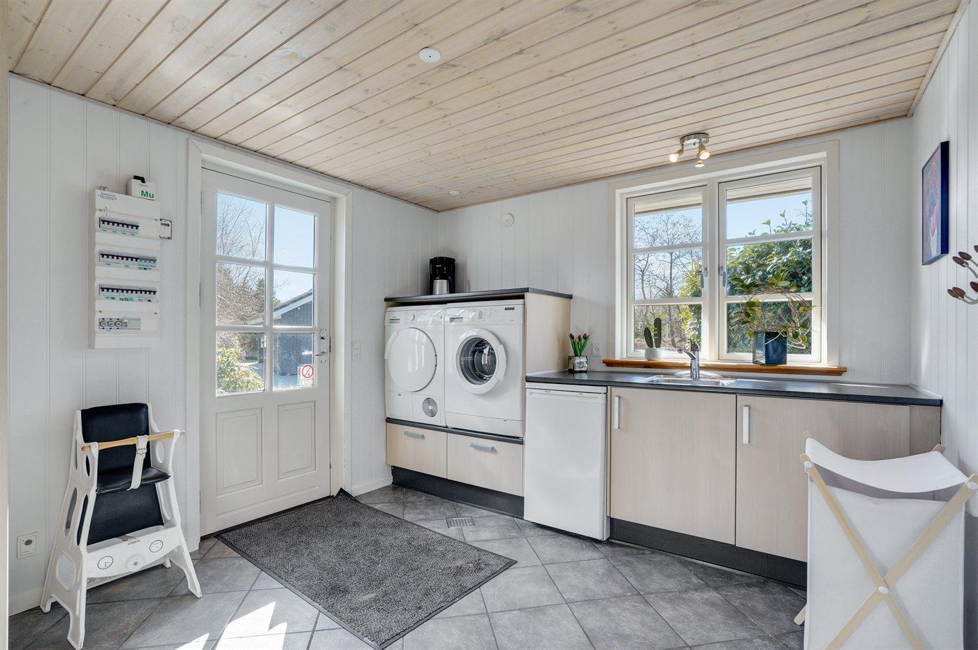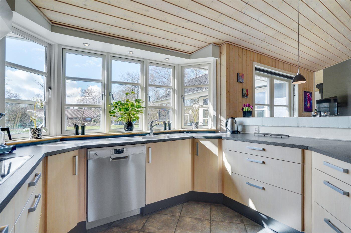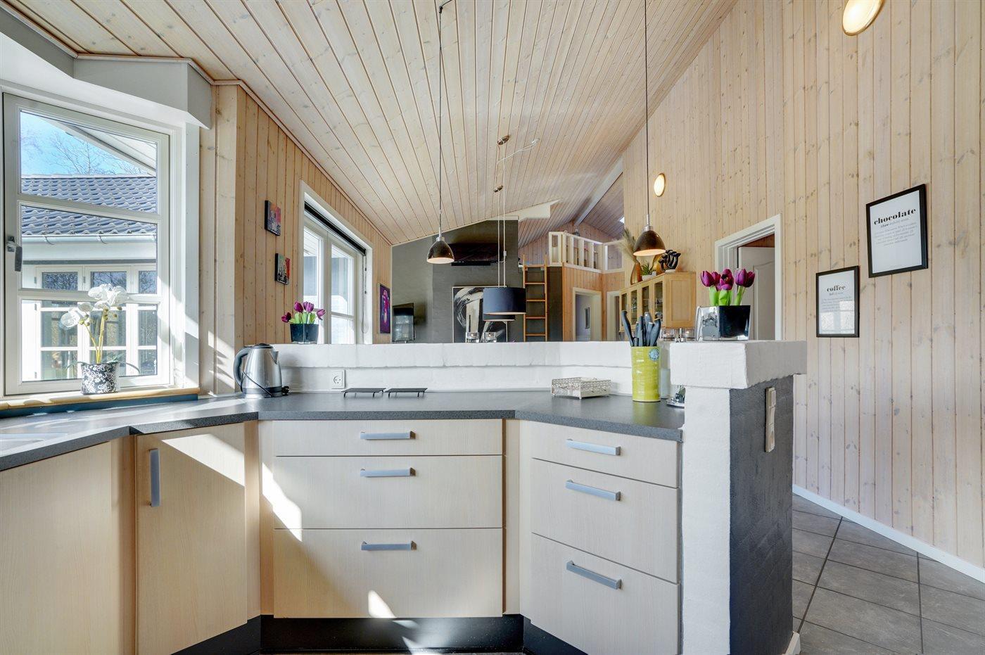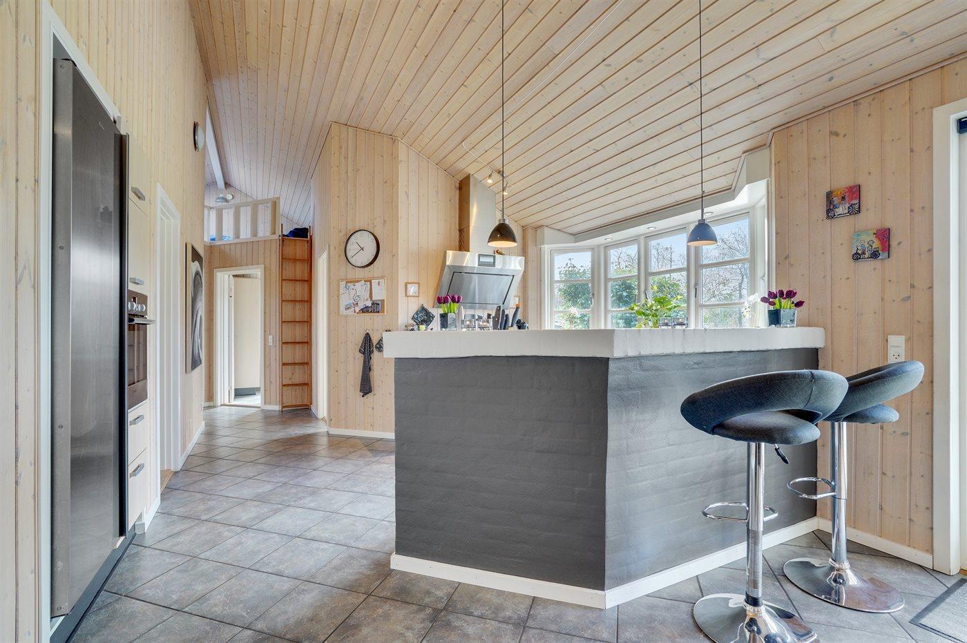 Køkkenet er udstyret med 1 køleskab. Der er 4 keramiske kogeplader, varmluftovn, mikrobølgeovn samt opvaskemaskine Der er gulvvarme i køkkenet.