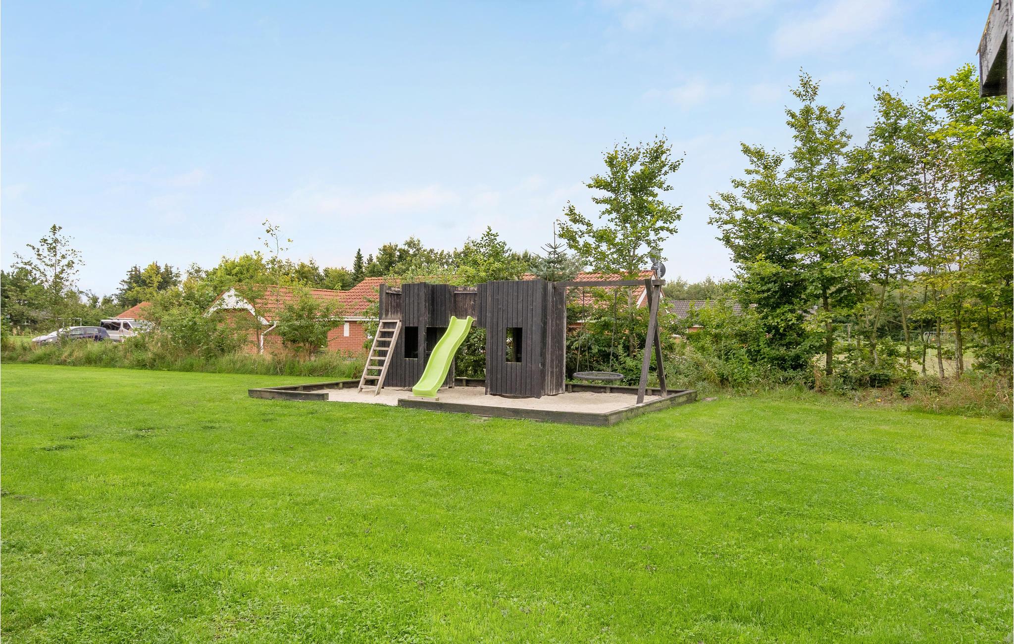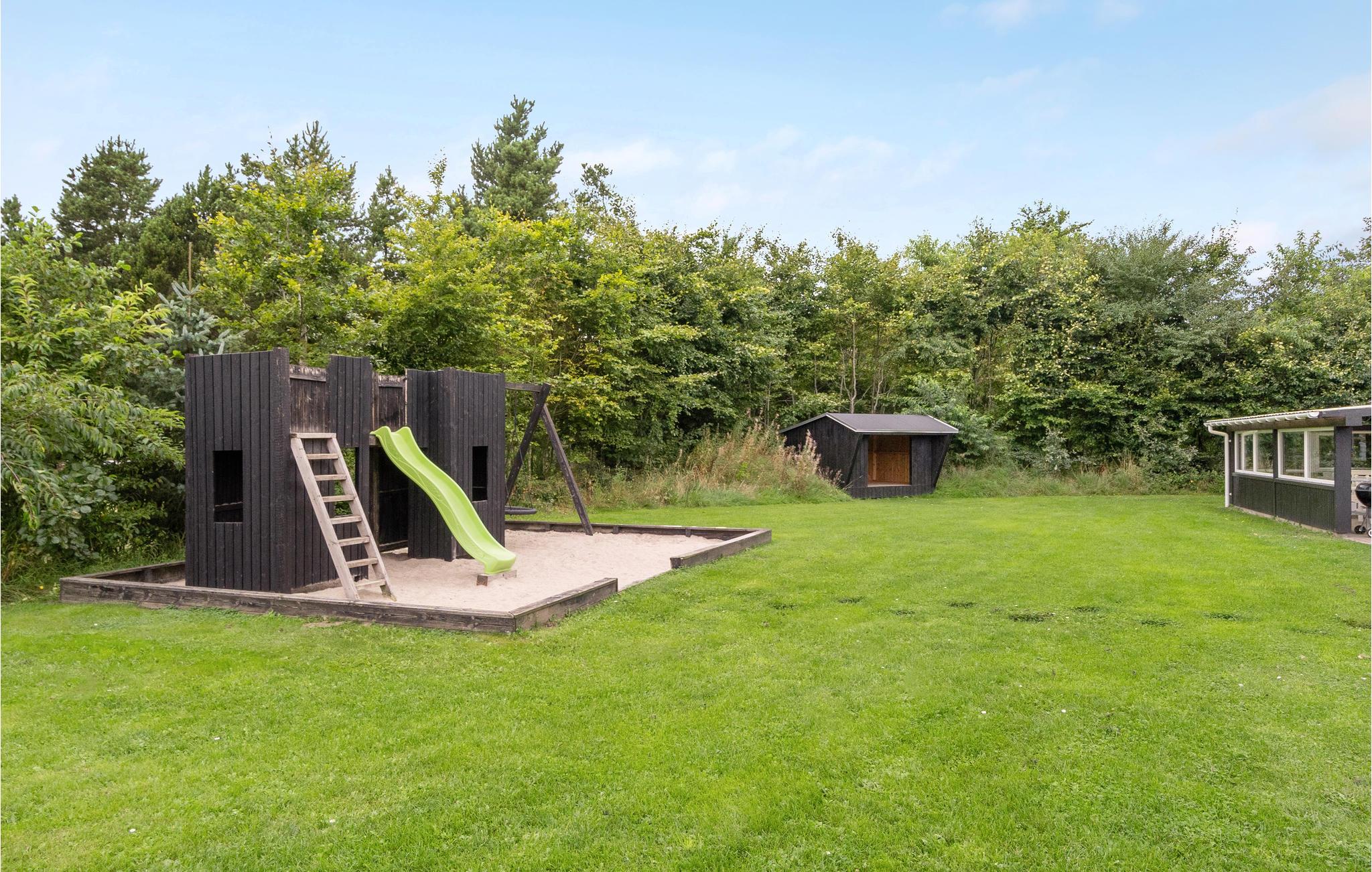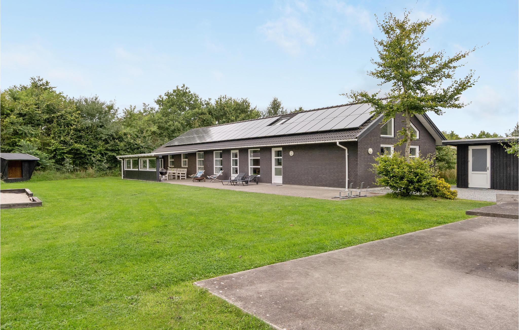 Feriehuset er praktisk indrettet med et større køkken/alrum med klinkegulv og gulvvarme samt udgang til en stor terrasse med et overdækket grillområde. Huset er opført i gode kvalitetsmaterialer og opvarmes med jordvarme. Der er et aktivitetsrum på 40 m2, med it arbejdsplads, internet, sofa, airhockey, ekstra TV samt bordfodboldbord, så der er mulighed for både underholdning og hjemmearbejde under jeres ophold. På grunden er der shelter, bålfad, legeborg med rutchebane, udendørs bordtennis og trampolin.