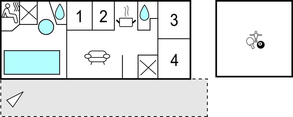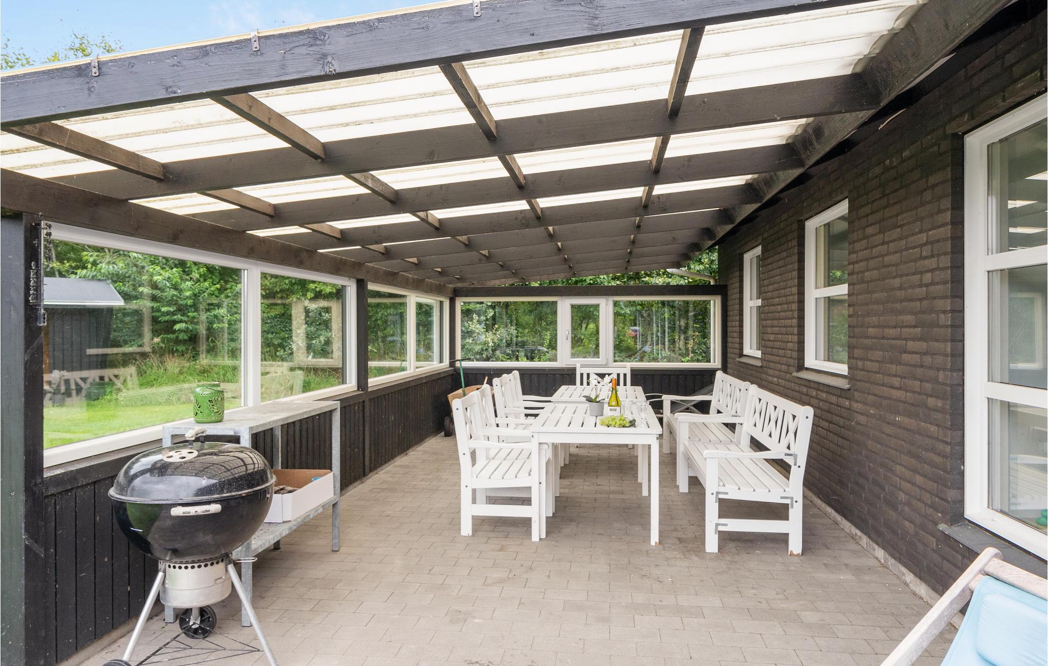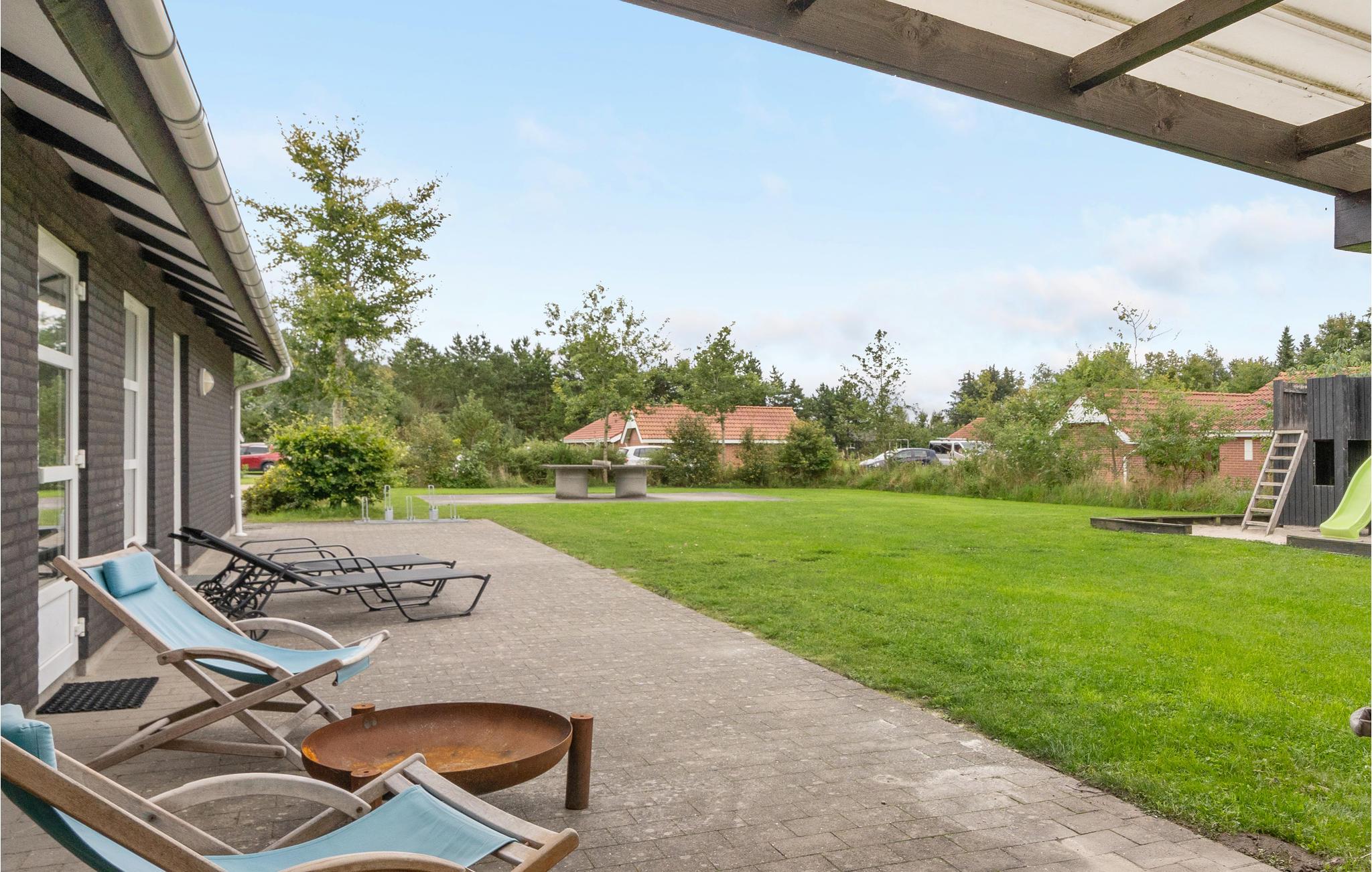 Feriehuset er praktisk indrettet med et større køkken/alrum med klinkegulv og gulvvarme samt udgang til en stor terrasse med et overdækket grillområde. Huset er opført i gode kvalitetsmaterialer og opvarmes med jordvarme. Der er et aktivitetsrum på 40 m2, med it arbejdsplads, internet, sofa, airhockey, ekstra TV samt bordfodboldbord, så der er mulighed for både underholdning og hjemmearbejde under jeres ophold. På grunden er der shelter, bålfad, legeborg med rutchebane, udendørs bordtennis og trampolin.