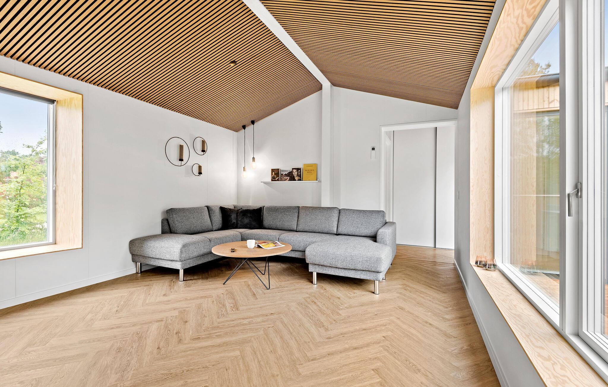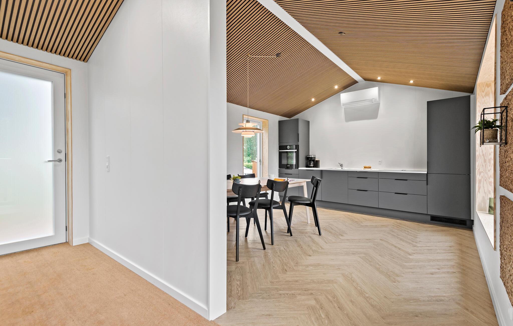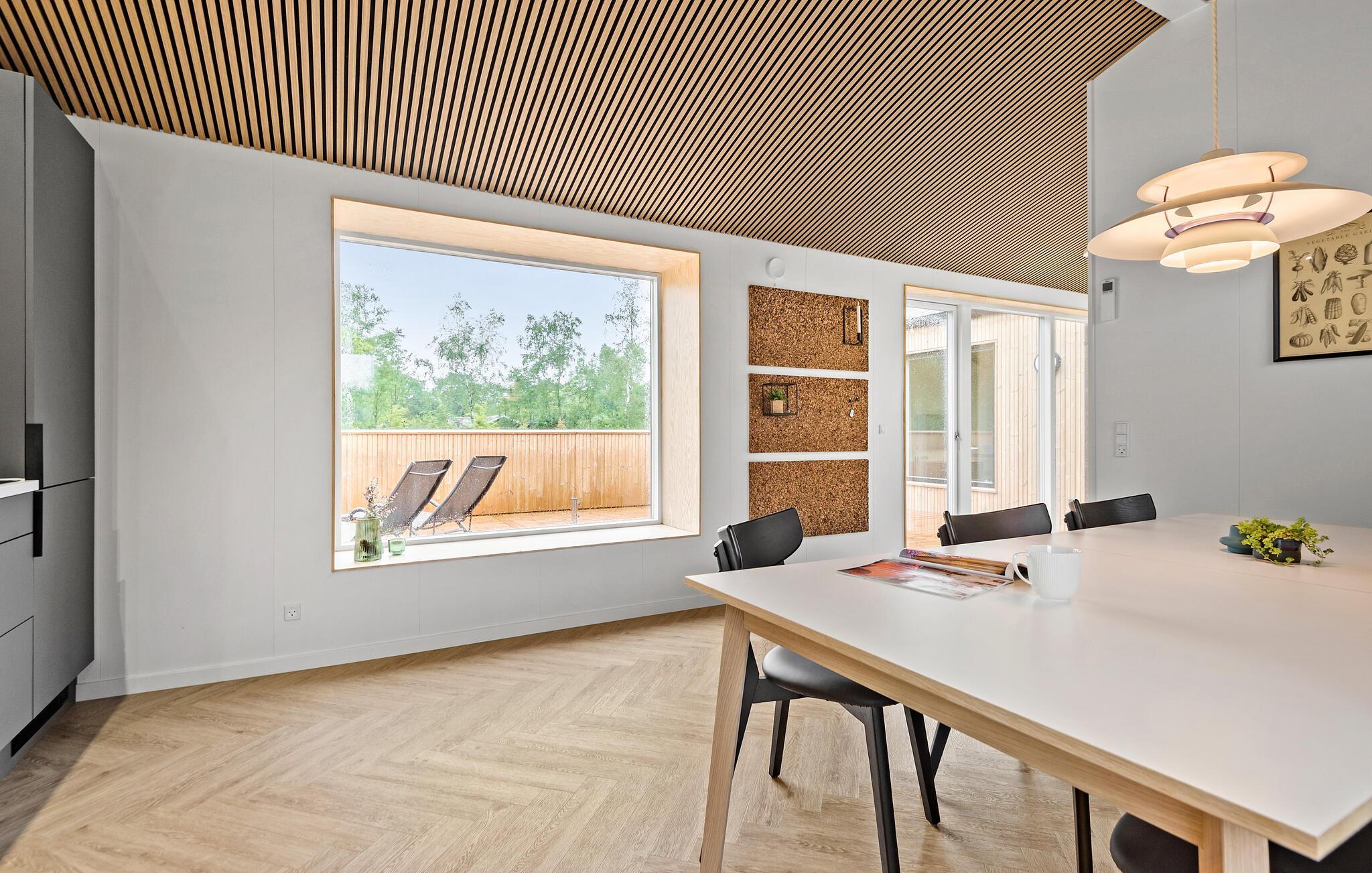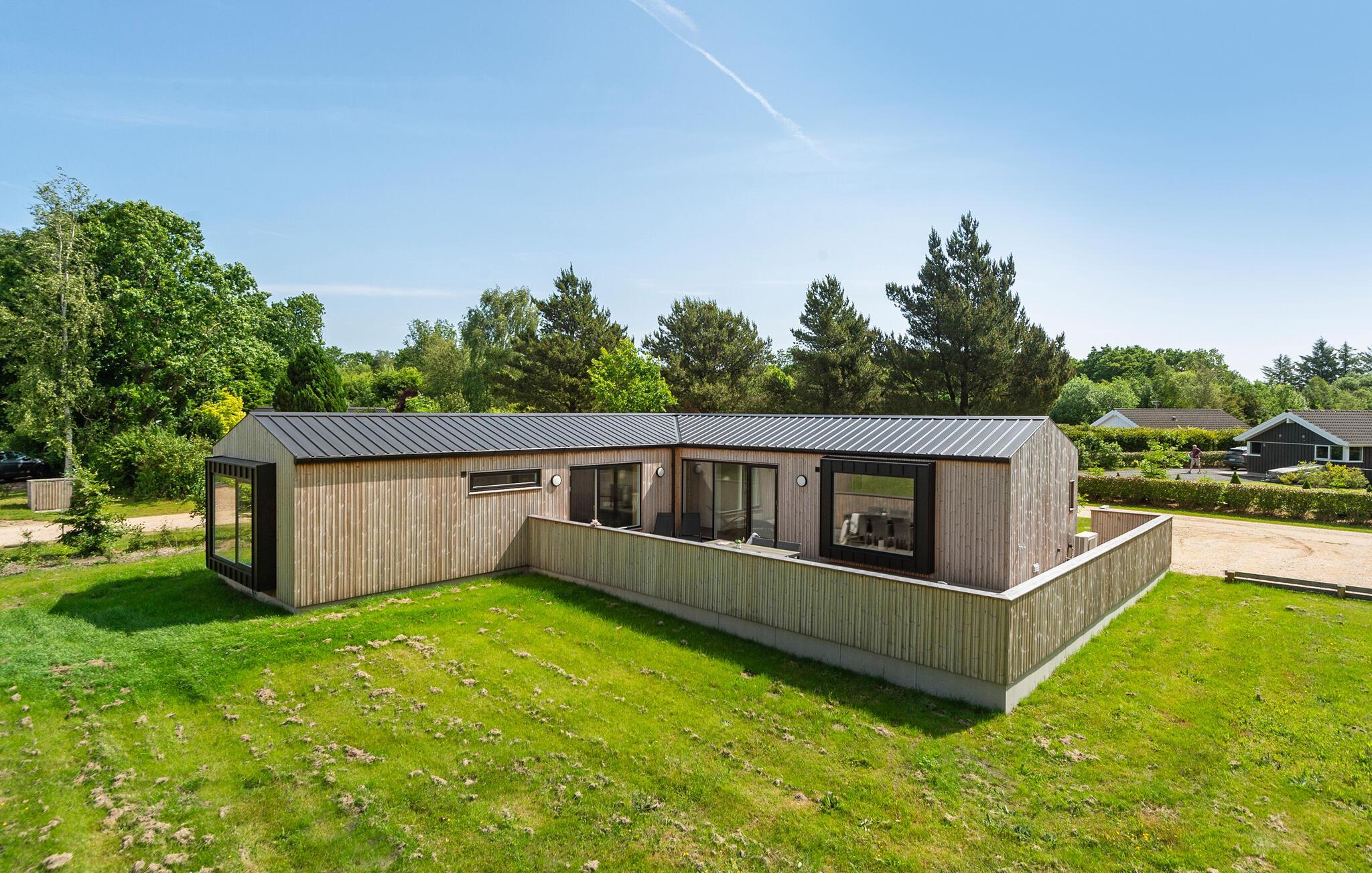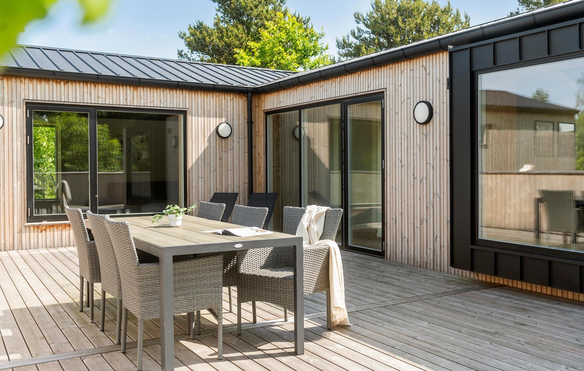 Moderne træhus i Jegum Ferieland med stilfuld indretning og dejlig terrasse i naturskønne omgivelser.