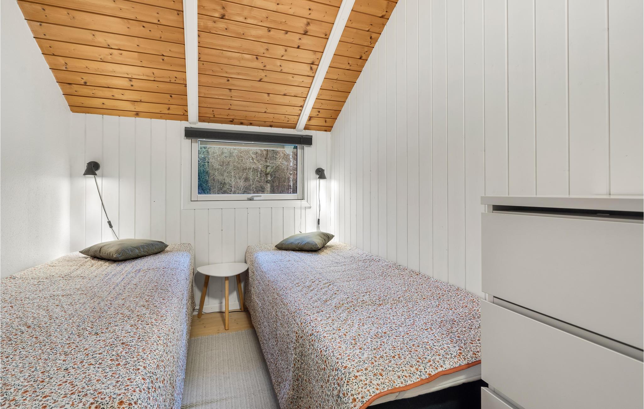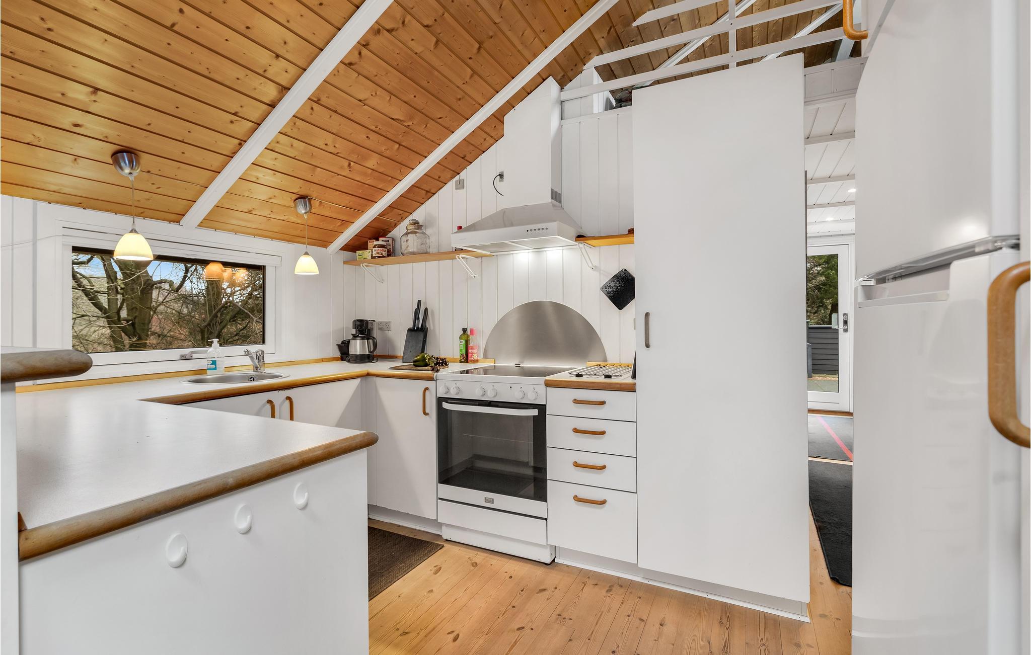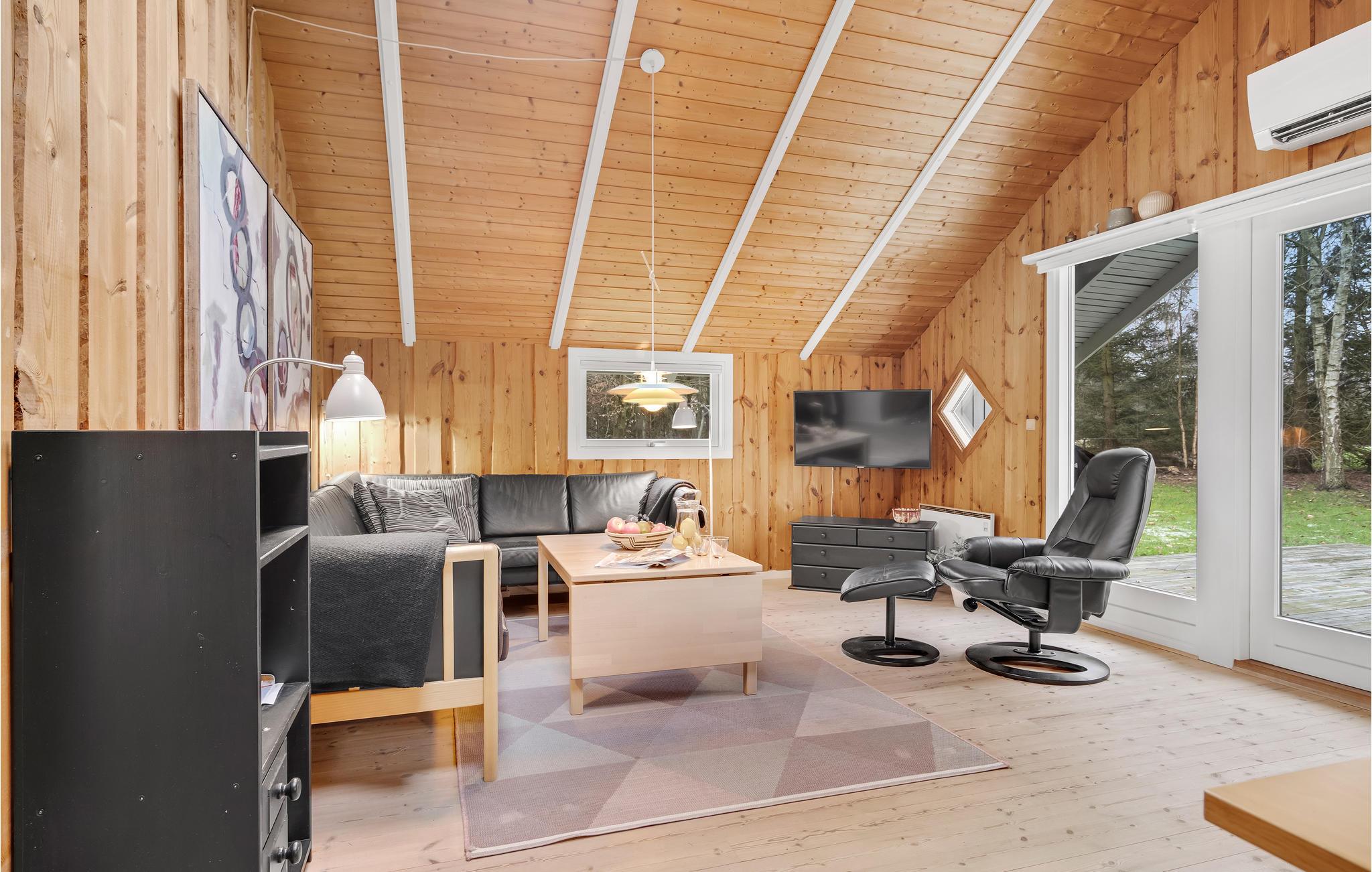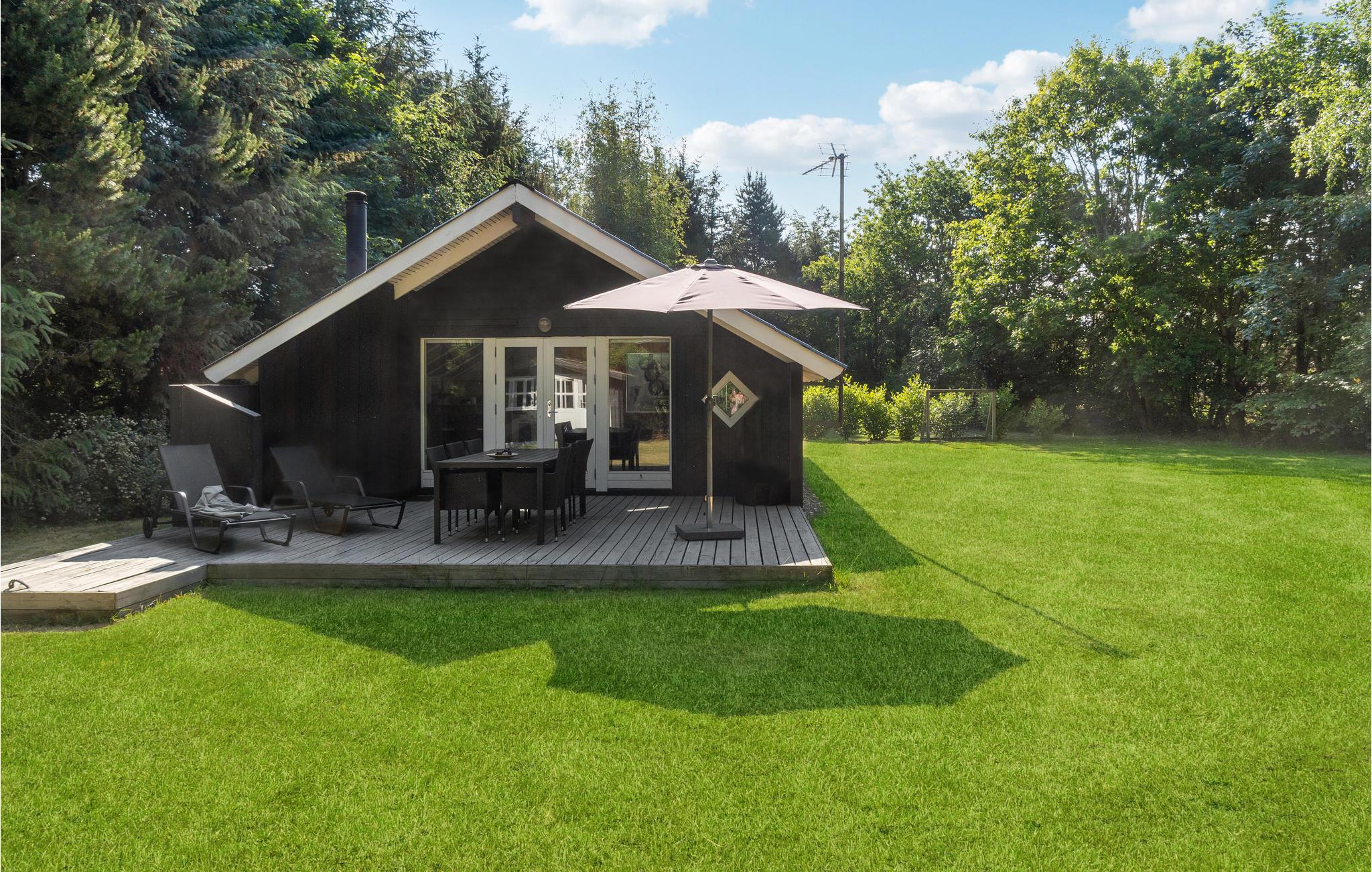 Velkommen på en dejlig, grøn grund, som omkranser dette hyggelige sommerhus. Her kan I holde jeres ferie i en hyggelig bolig, som er enkelt og stilrent og får en skøn varme fra trævæggene. Glæd jer til hyggelige aftener uden travlhed i opholdsstuen efter en lang dag på farten. Læn jer godt tilbage i sofahjørnet, mens ilden knitrer i brændeovnen på de kølige aftener.