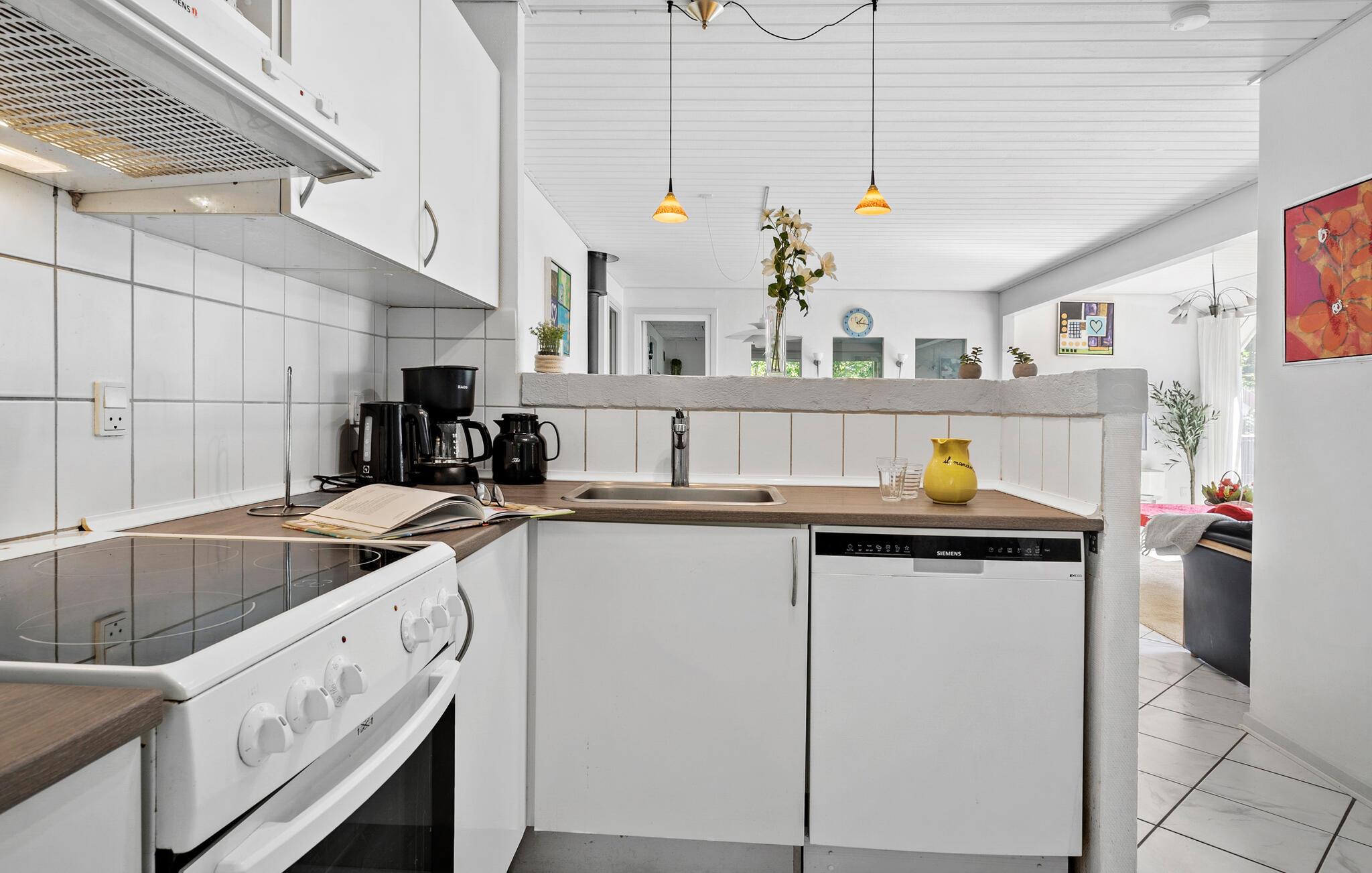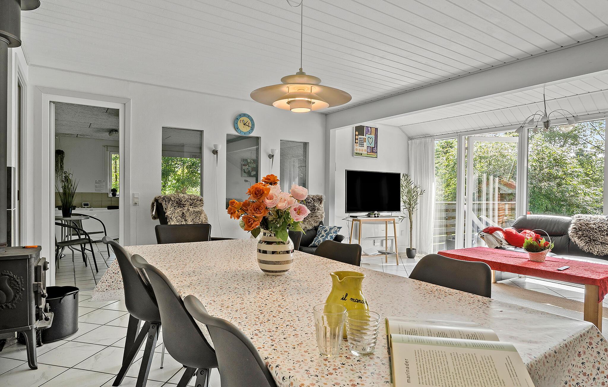 Velkommen til Jegum og dette velholdte hus, hvor to familier får gode rammer til at hygge sig. Huset er varmt og personligt indrettet i en rolig farveskala, og de store vinduespartier i stuen sørger for en lys og behagelig stemning. Sammensæt feriens måltider i køkkenet, hvor der er en halvmur, så man kan følge med i samtalen, mens børnene spiller brætspil ved spisebordet.