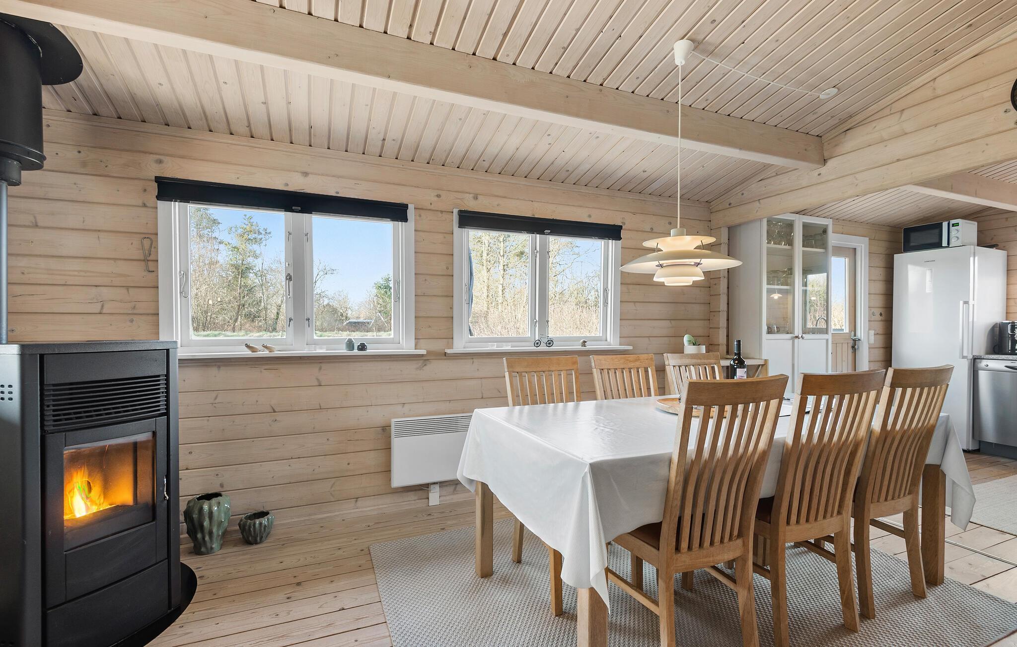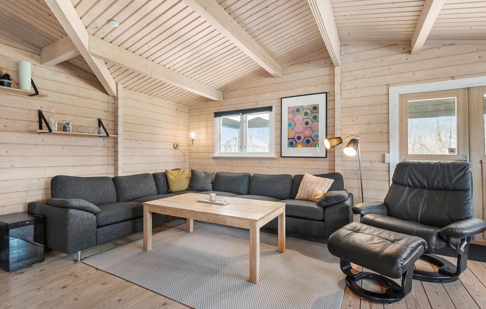 En hyggelig atmosfære med lyst træ og stilfulde møbler byder jer velkommen i dette feriehus. Tilbered jeres måltider i det moderne køkken, og nyd harmoniske stunder i det lyse spiseområde, mens brændeovnen sørger for ekstra hygge. Slap af med en god film på den komfortable sofa, eller læg fødderne op i den indbydende læsestol.
